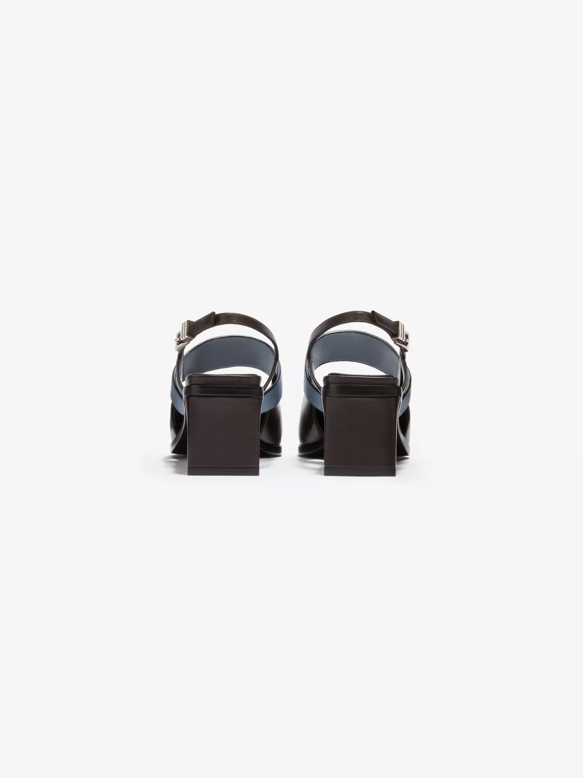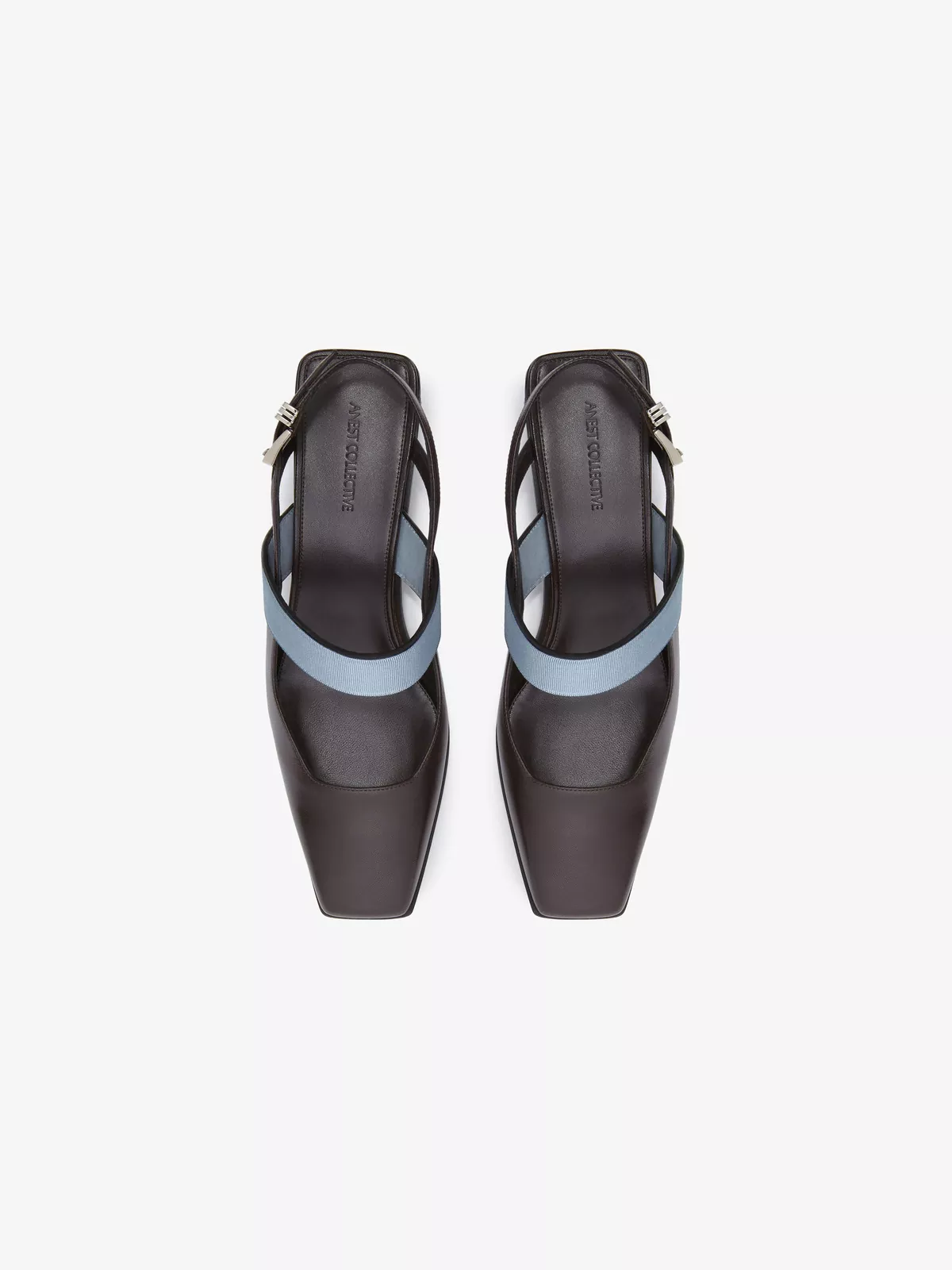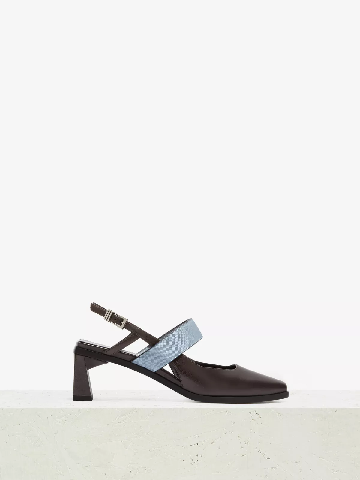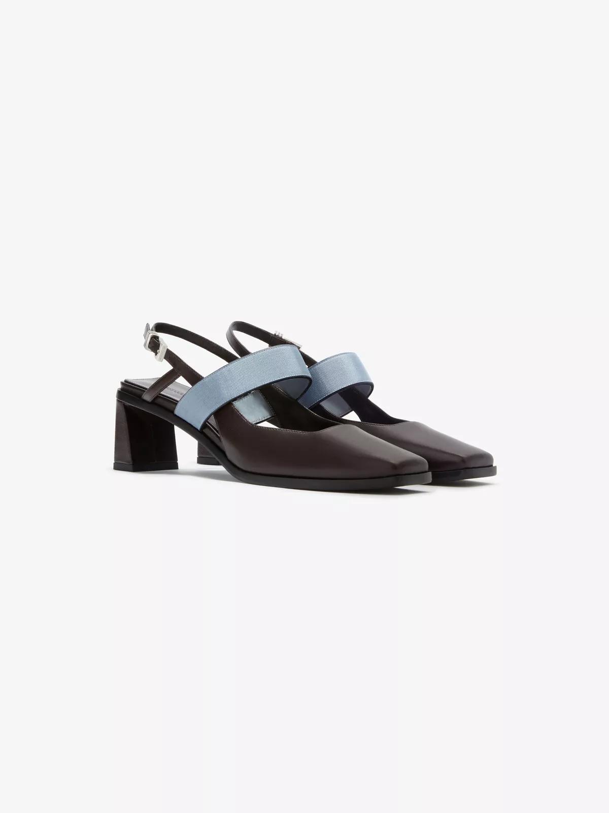 This classic slingback is crafted from a smooth leather with a contrasting textured grosgrain strap that elegantly frames the foot, a square-toe style and a sculptural block heel.