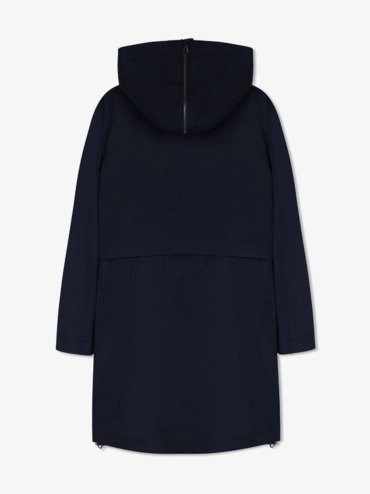 Wool-blend and nylon parka with a hood that turns into a back cape when unzipped. It has an adjustable waistband and concealed fastening with metal buttons and a zip.