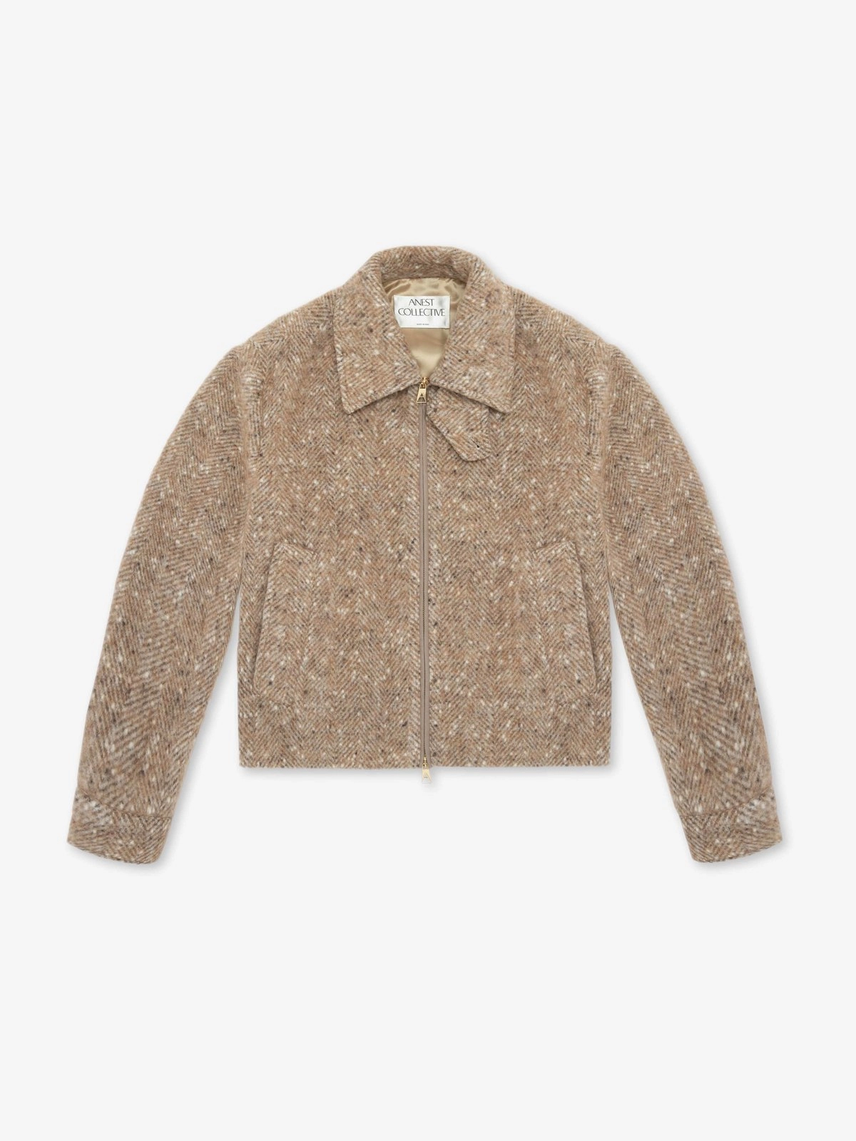 Cropped unisex blouson crafted from a herringbone wool-blend fabric. Designed with a classic shirt collar and a front metal zip closure featuring a double puller. Two jetted pockets accent the sides, while the back is defined by two generous pleats fastened with horn buttons at the hem. Fully lined for comfort and structure.
