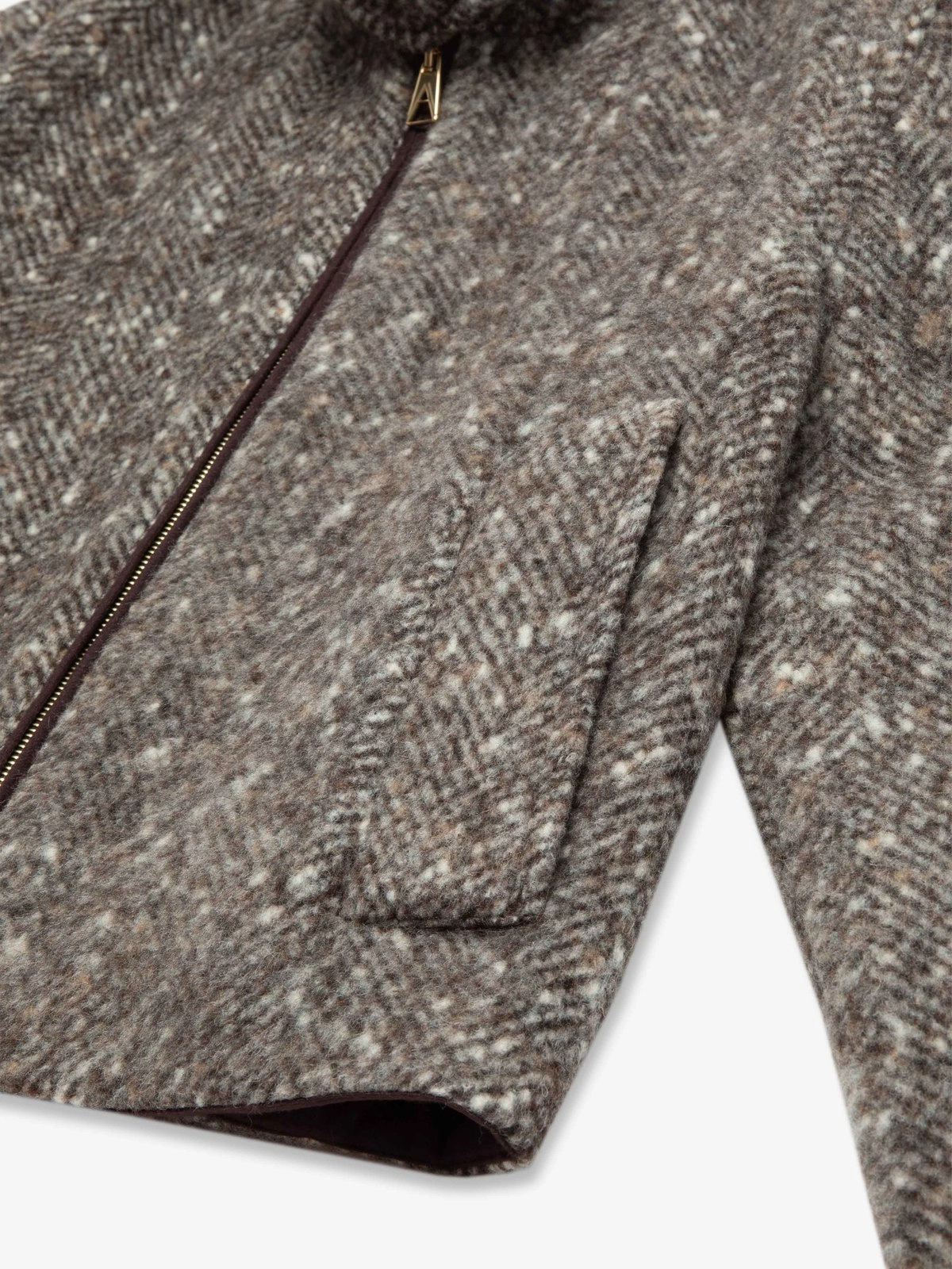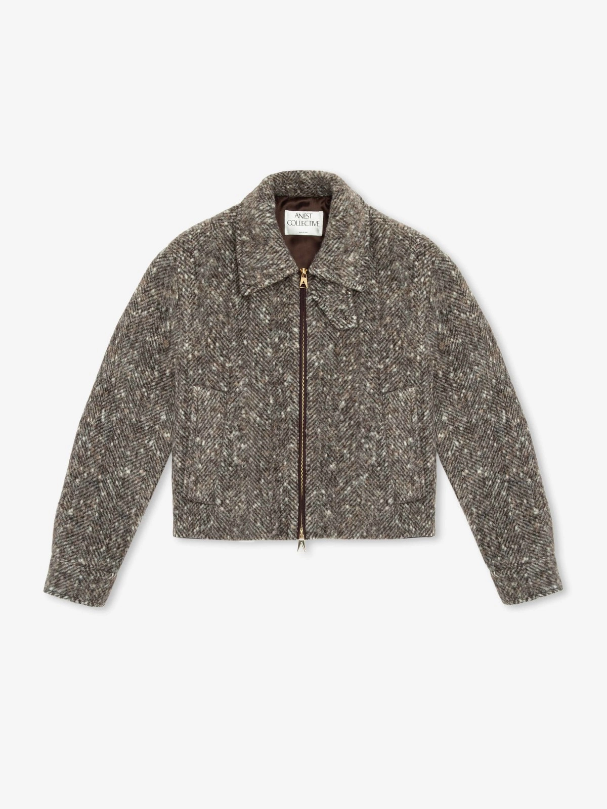 Cropped unisex blouson crafted from a herringbone wool-blend fabric. Designed with a classic shirt collar and a front metal zip closure featuring a double puller. Two jetted pockets accent the sides, while the back is defined by two generous pleats fastened with horn buttons at the hem. Fully lined for comfort and structure.