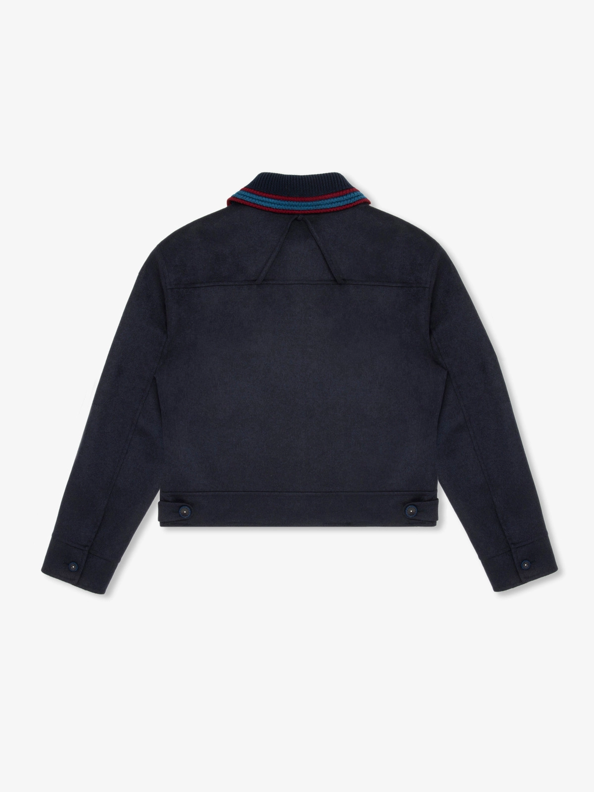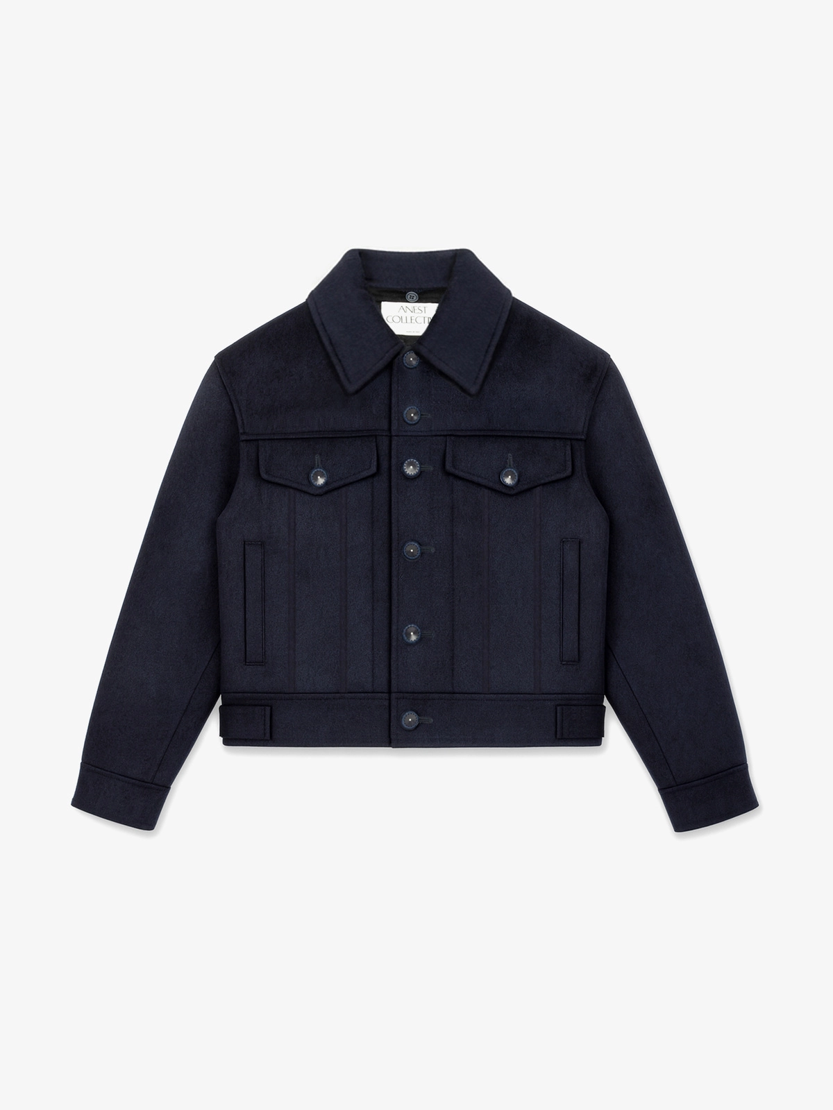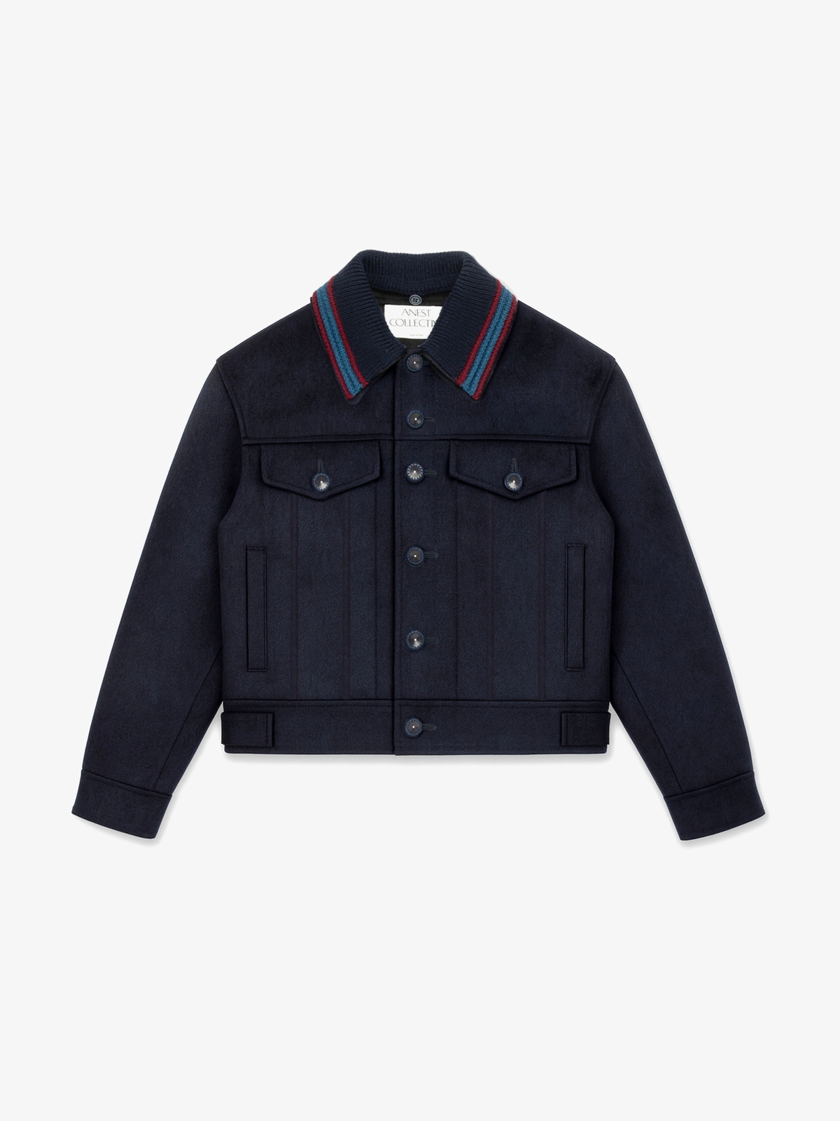 A denim-inspired blouson jacket, exquisitely crafted in pure double cashmere, embodying both structure and luxurious softness. The piece is fully constructed in double and unlined, showcasing impeccable handmade craftsmanship inside and out. A detachable knitted collar in contrasting tones lends versatility and a touch of modern edge, while the visible corozo button fastening adds a natural, understated elegance. The front is defined by two flap pockets at the breast, complemented by two refined fillet side pockets for balanced functionality. At the waist, two side adjusters allow for a personalized fit. On the back, the house’s signature ‘A’-shaped string detail introduces a distinctive, sophisticated accent.