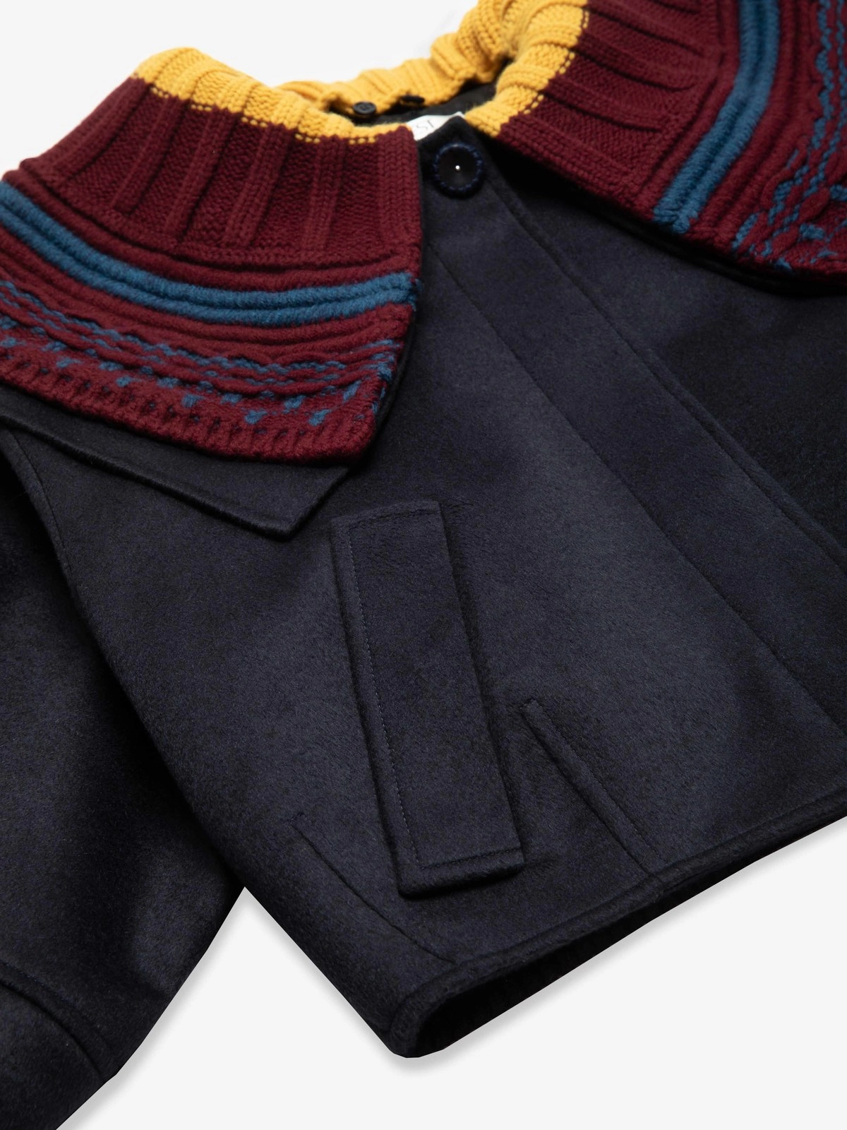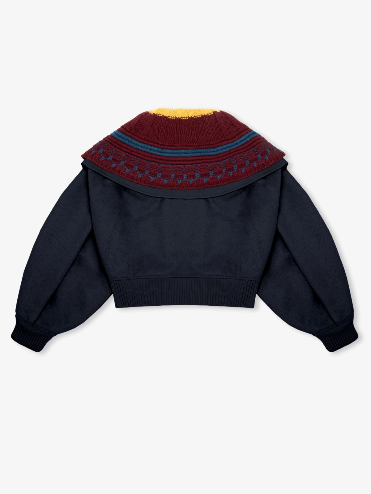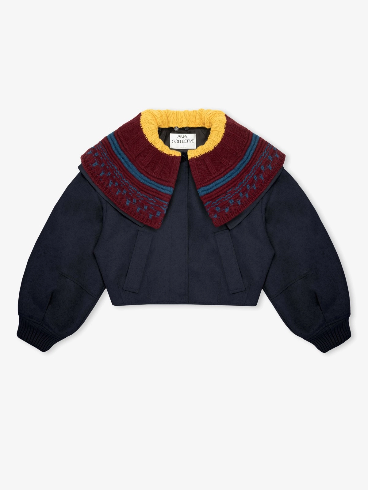 Rounded cropped blouson crafted in double cashmere and fully lined, featuring a detachable oversized knitted collar in contrasting-colored stripes. Classic hidden fastening with corozo button visible only at the neckline and concealed horn buttons along the closure. Two side welt pockets. Finished with ribbed cuffs and a ribbed band at the back hem.