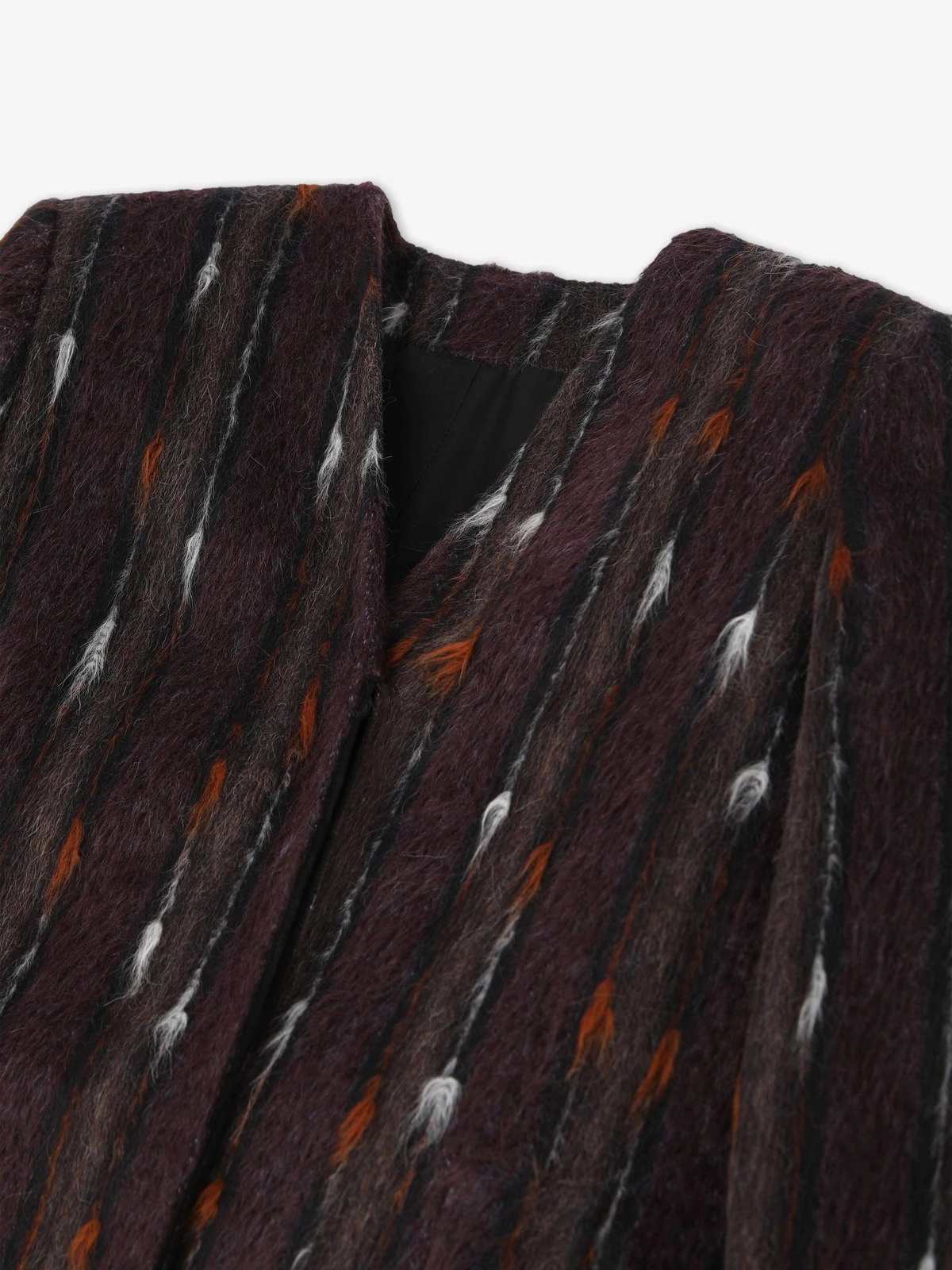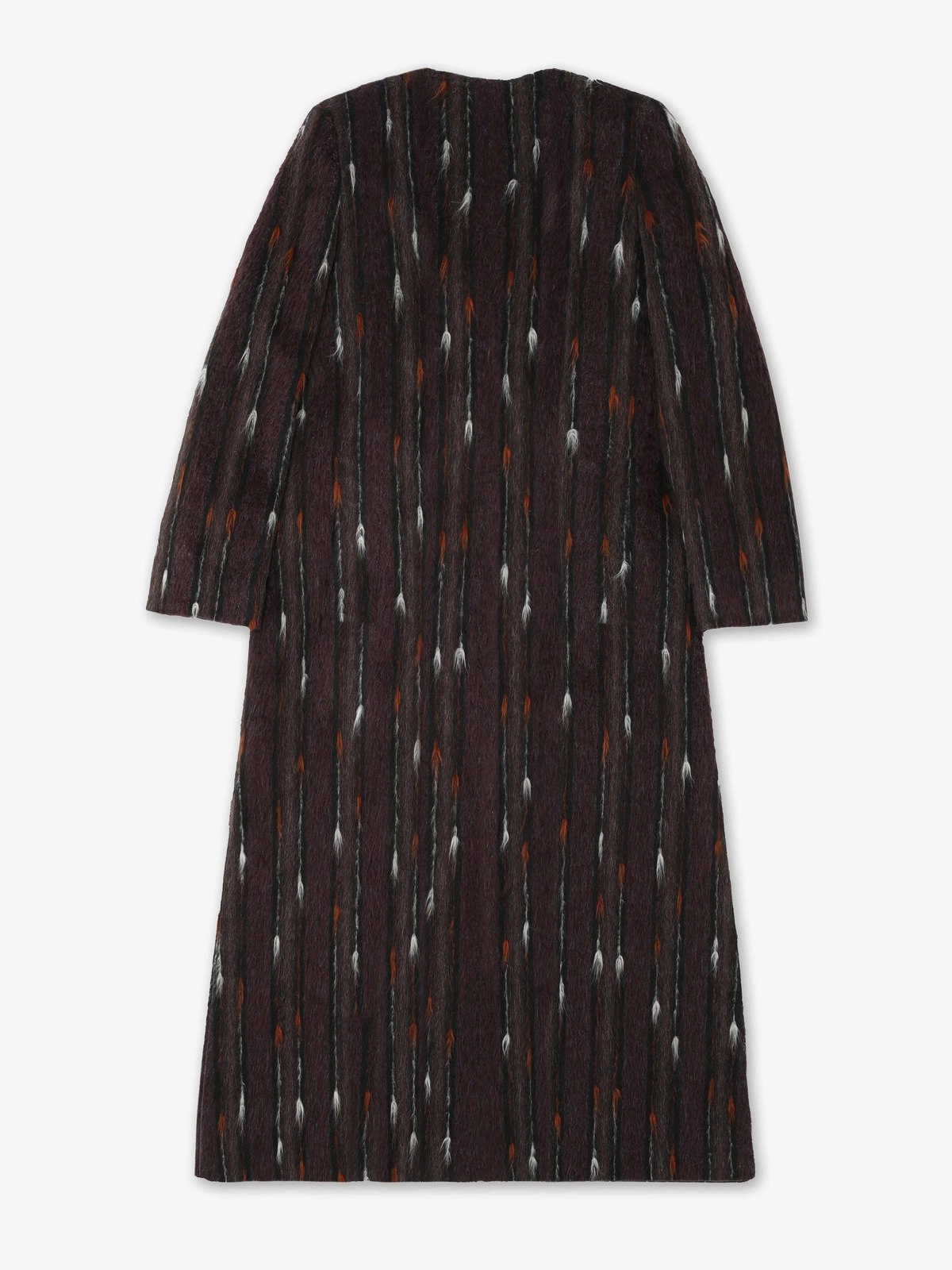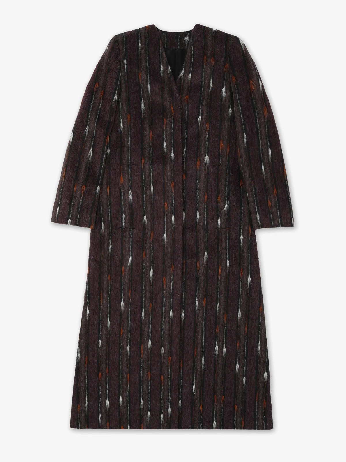 Long single-breasted coat crafted from a luxurious wool blend with a soft, hairy alpaca texture. Features a clean V-neckline and concealed horn buttons on the front as well as a classic hidden fastening. Fully lined. Finished with sleek jetted pockets at the hips and side slits for ease of movement and elegant flow.
