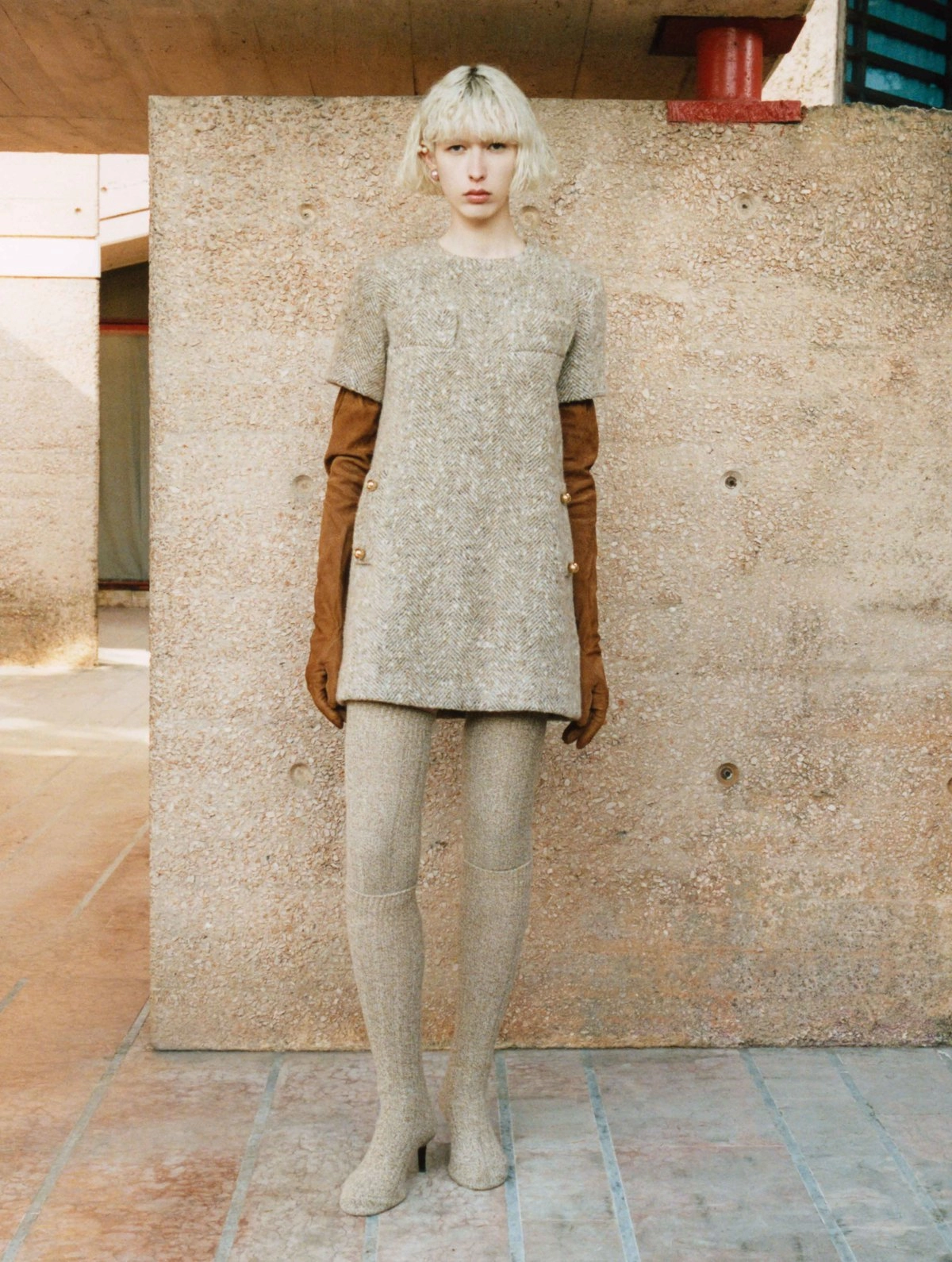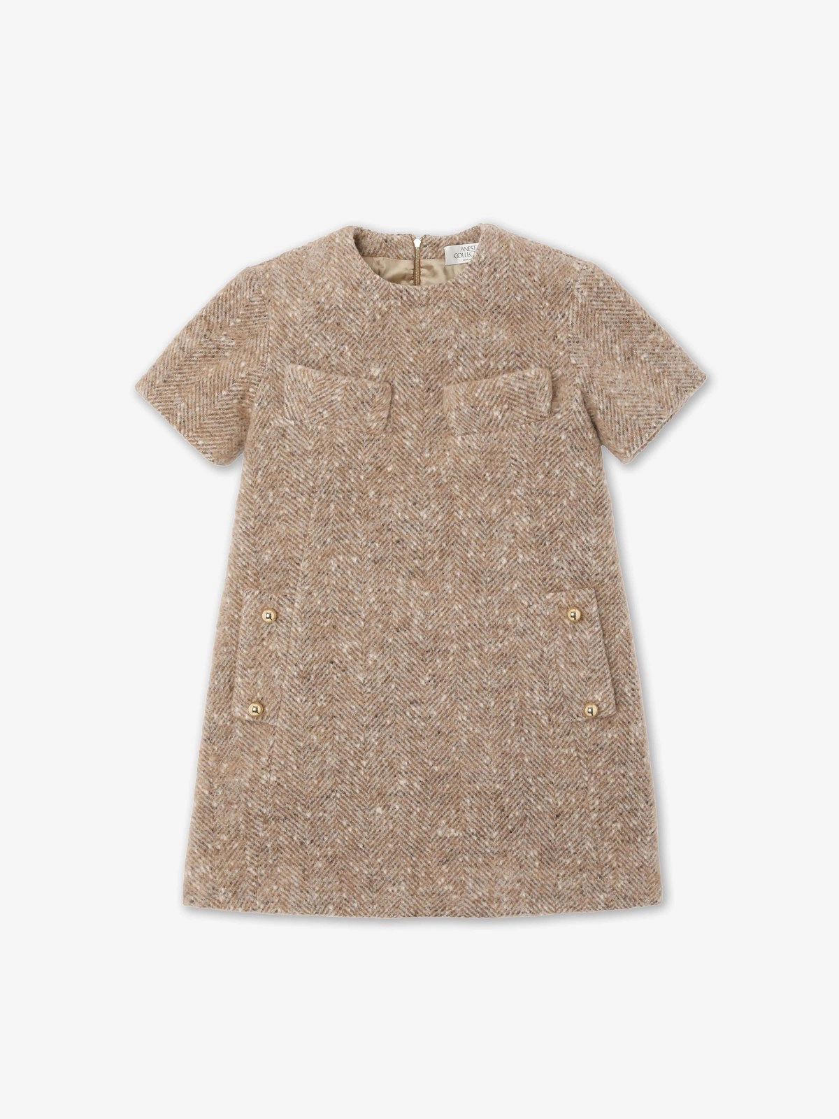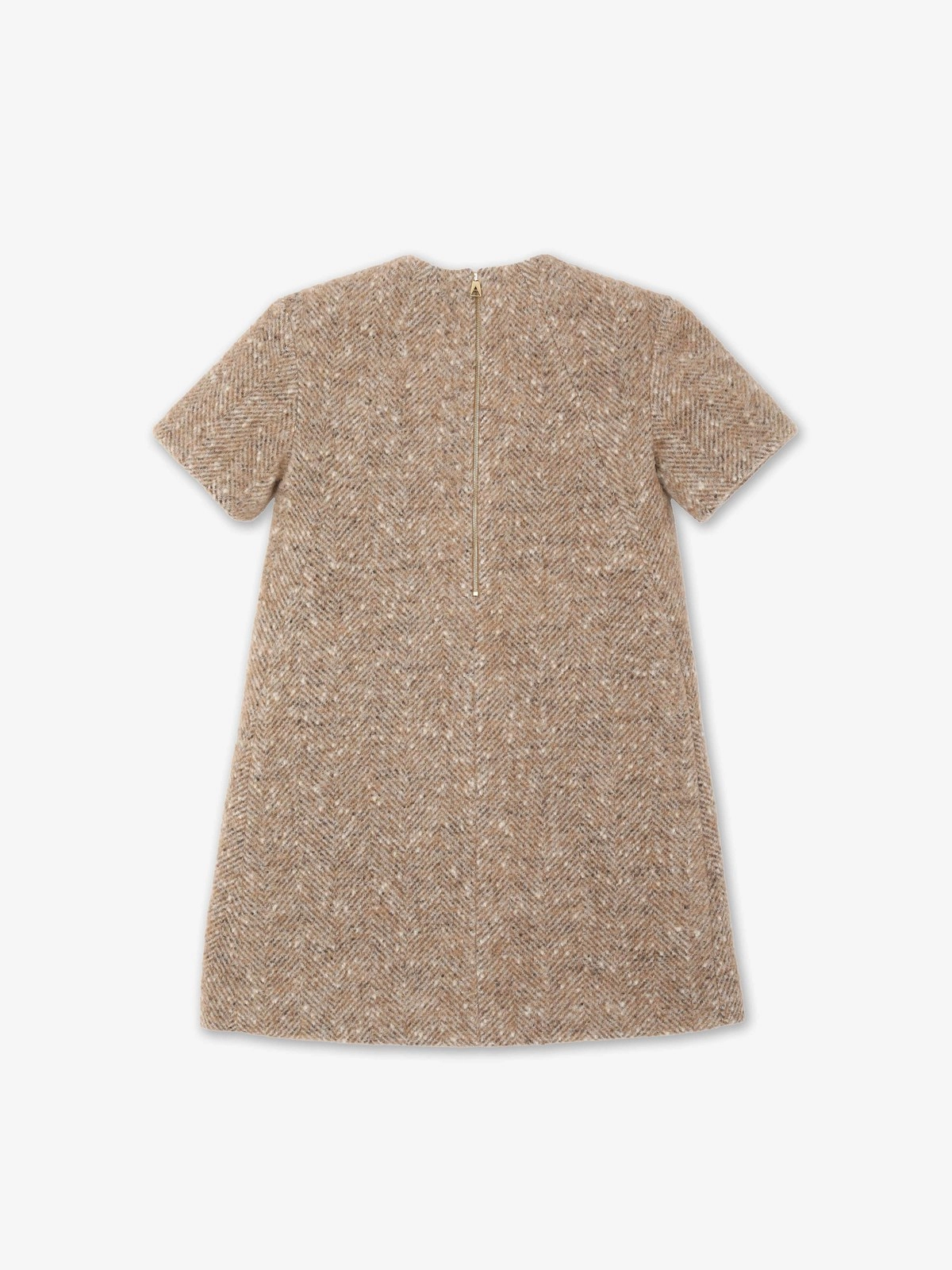 Short dress tailored from a herringbone wool-blend fabric, featuring a round neckline with an inner facing detail and bell-shaped sleeves. The breast features two flap pockets, while two welt side pockets are embellished with metal boules buttons. Fully lined for a refined construction, the design is completed with A-line seams at the back that flow elegantly toward the sides.