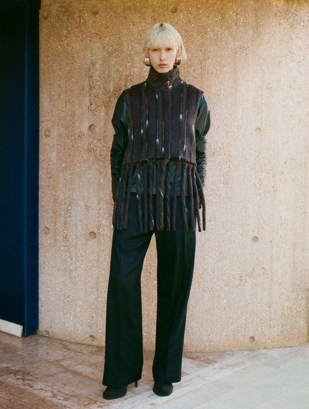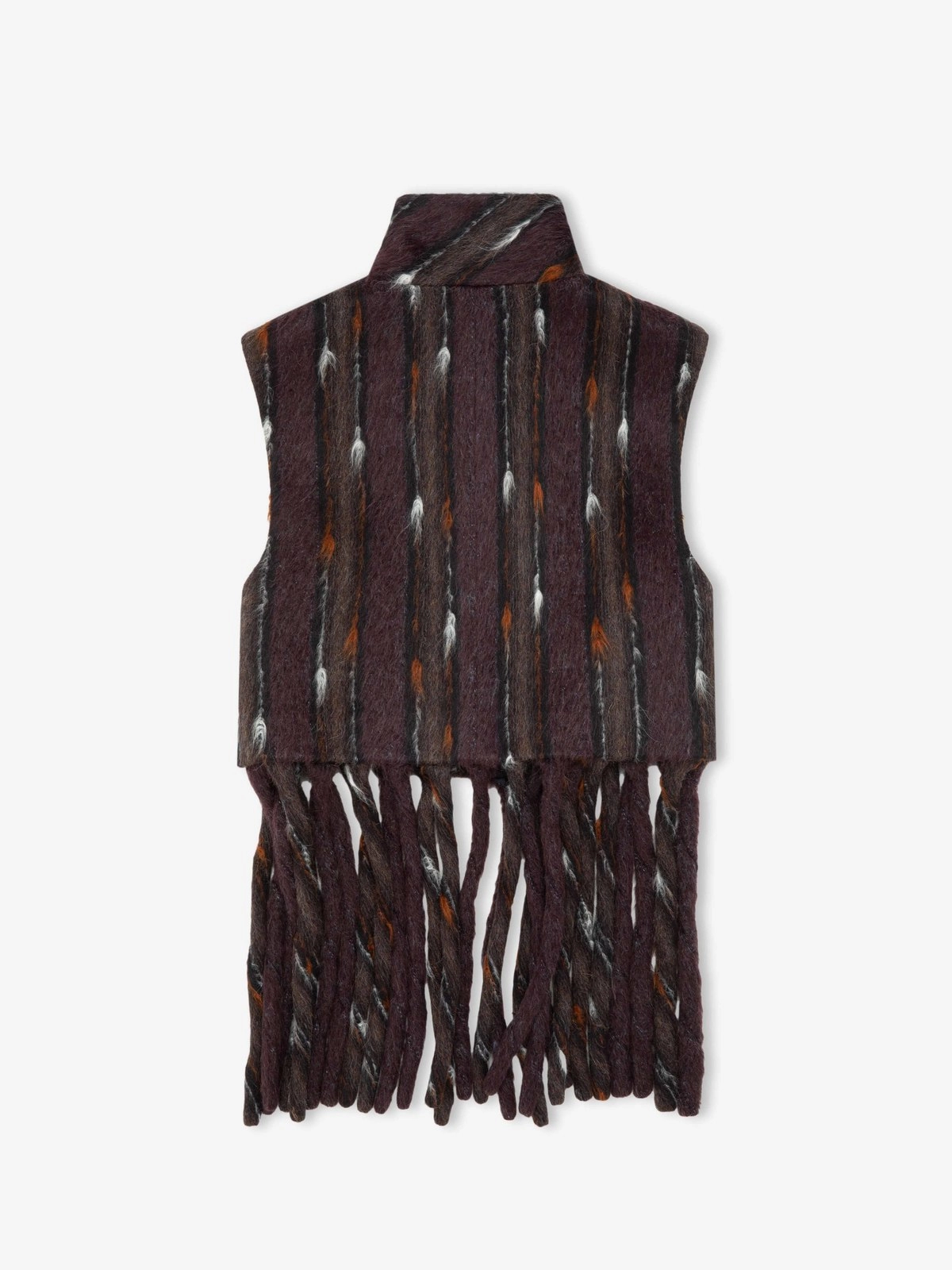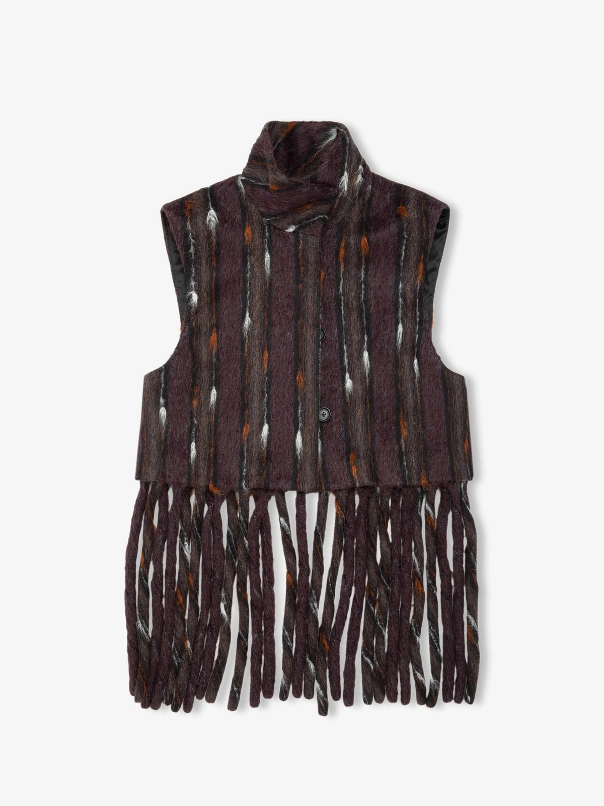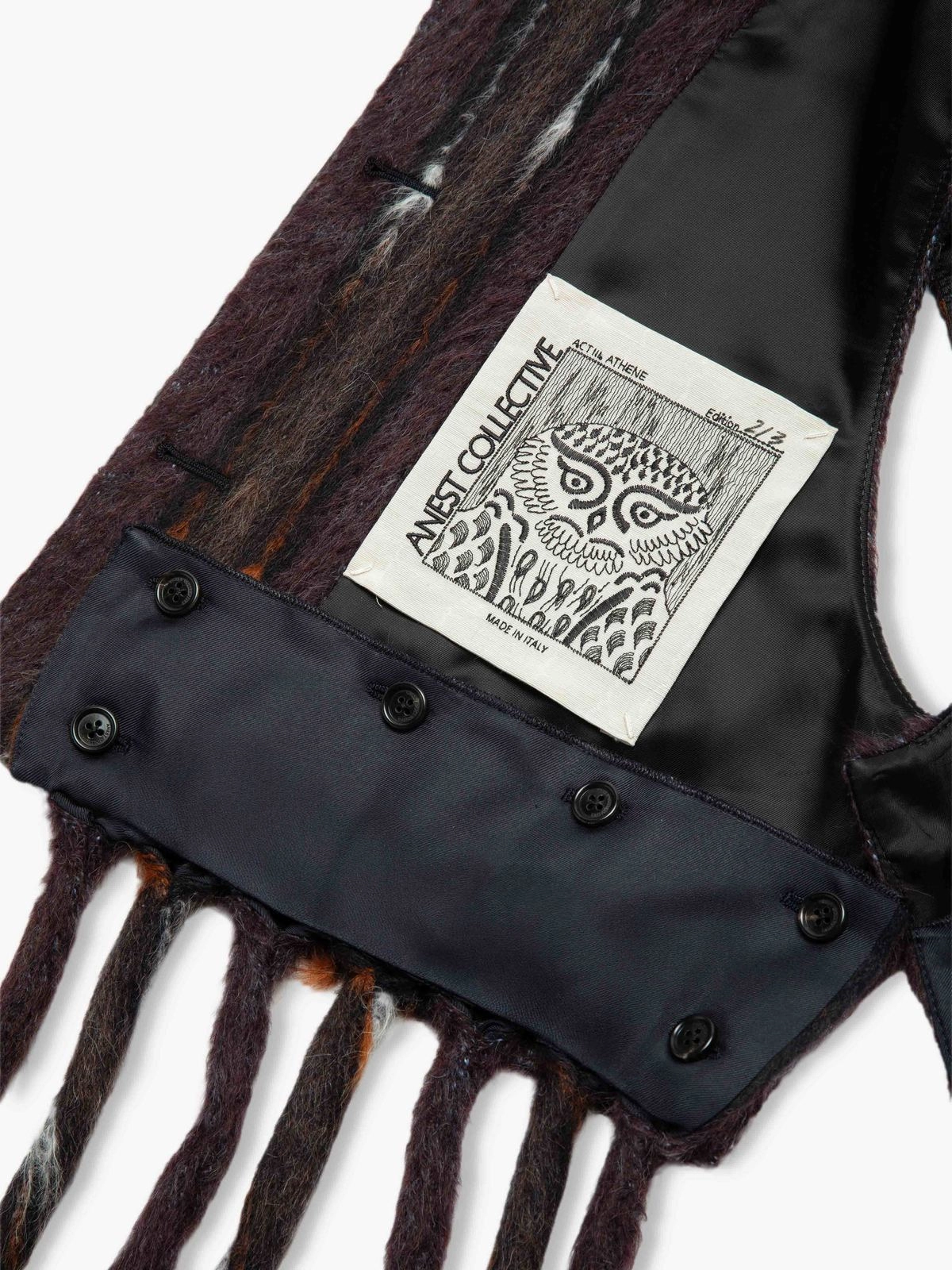 Single-breasted vest crafted from a luxurious wool blend with a soft, hairy alpaca texture, enriched with delicate fringes at the hem for a subtle textural accent. Designed with a high neckline and concealed horn buttons along the front, featuring a classic hidden fastening that extends to the collar for a tailored finish. Side slits add ease of movement and a modern sense of fluidity, making this piece both functional and elegantly distinctive.