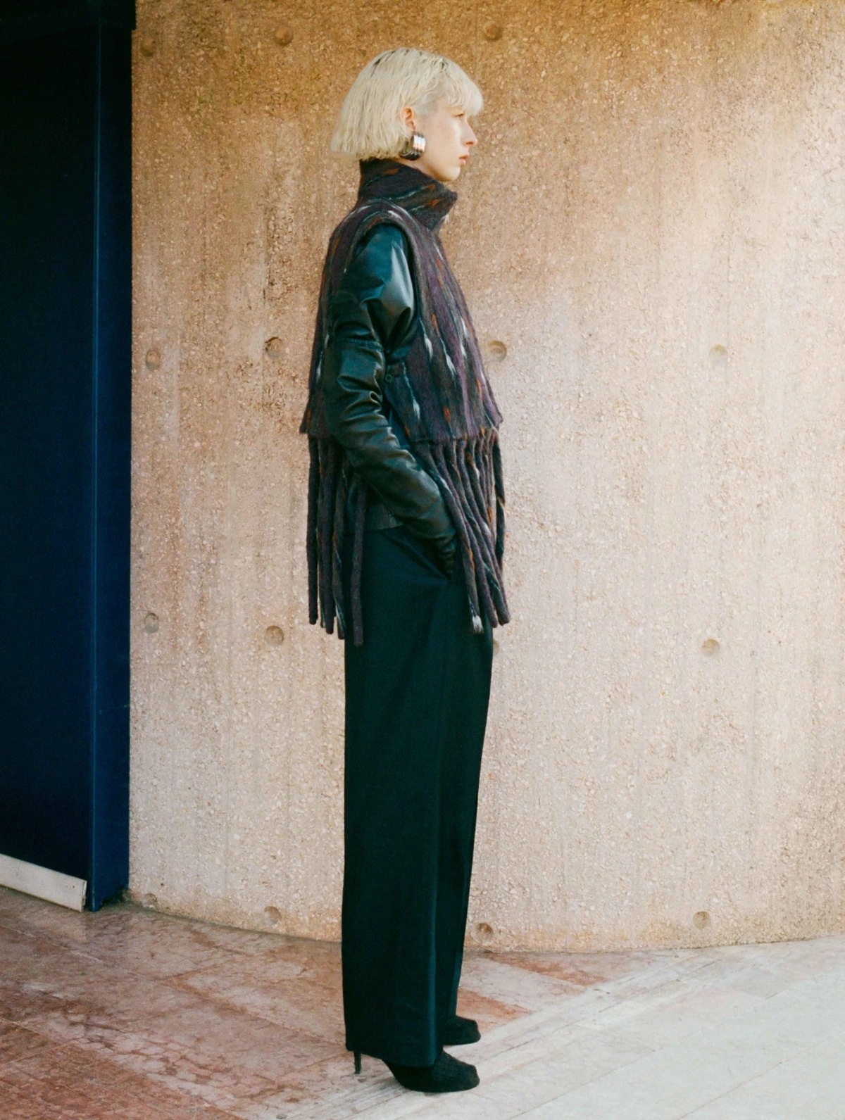 This vest is a modern layering piece that blends tailored elegance with artisanal detail. Wear it layered over a slim turtleneck or cotton shirt for a smart, minimalist look, or pair it with wide-leg trousers or a dress to create balanced, contemporary proportions. For transitional seasons, it works beautifully over a lightweight blouse, while in colder months, it can be worn over a coat as a warm, textural layer. Ideal for fall through early spring, this vest is suited for both casual and refined dressing. Its versatile design allows it to function as a statement piece or an elegant layering item—perfect for the office, travel, or understated weekend ensembles. Whether dressed up or down, it adds depth and quiet sophistication to any outfit.