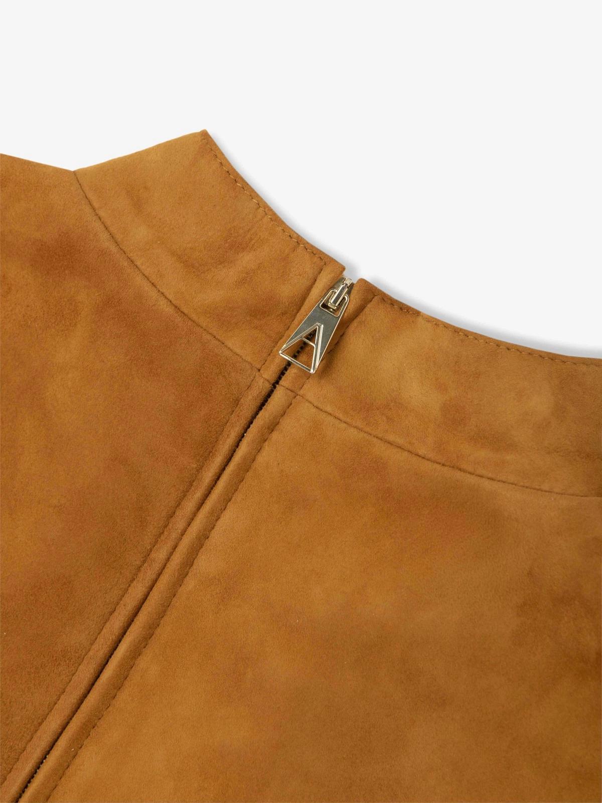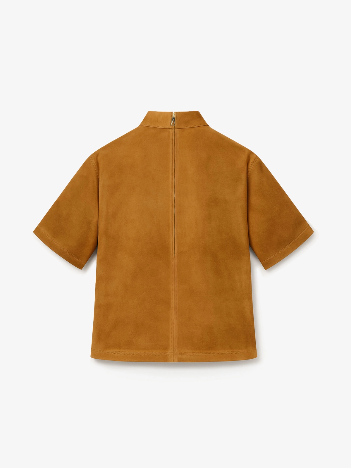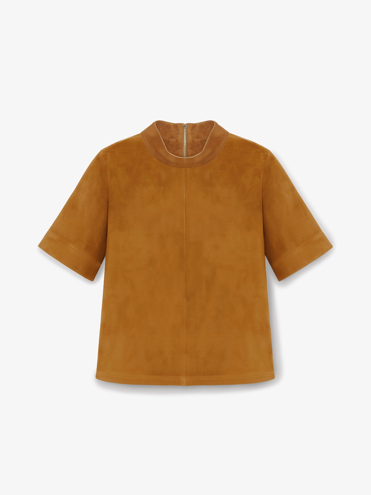 T-shirt crafted in soft lambskin leather, featuring a gleaming gold metal back zipper. Designed with a double-layered half collar and short sleeves finished by a twin-needle topstitching detail.