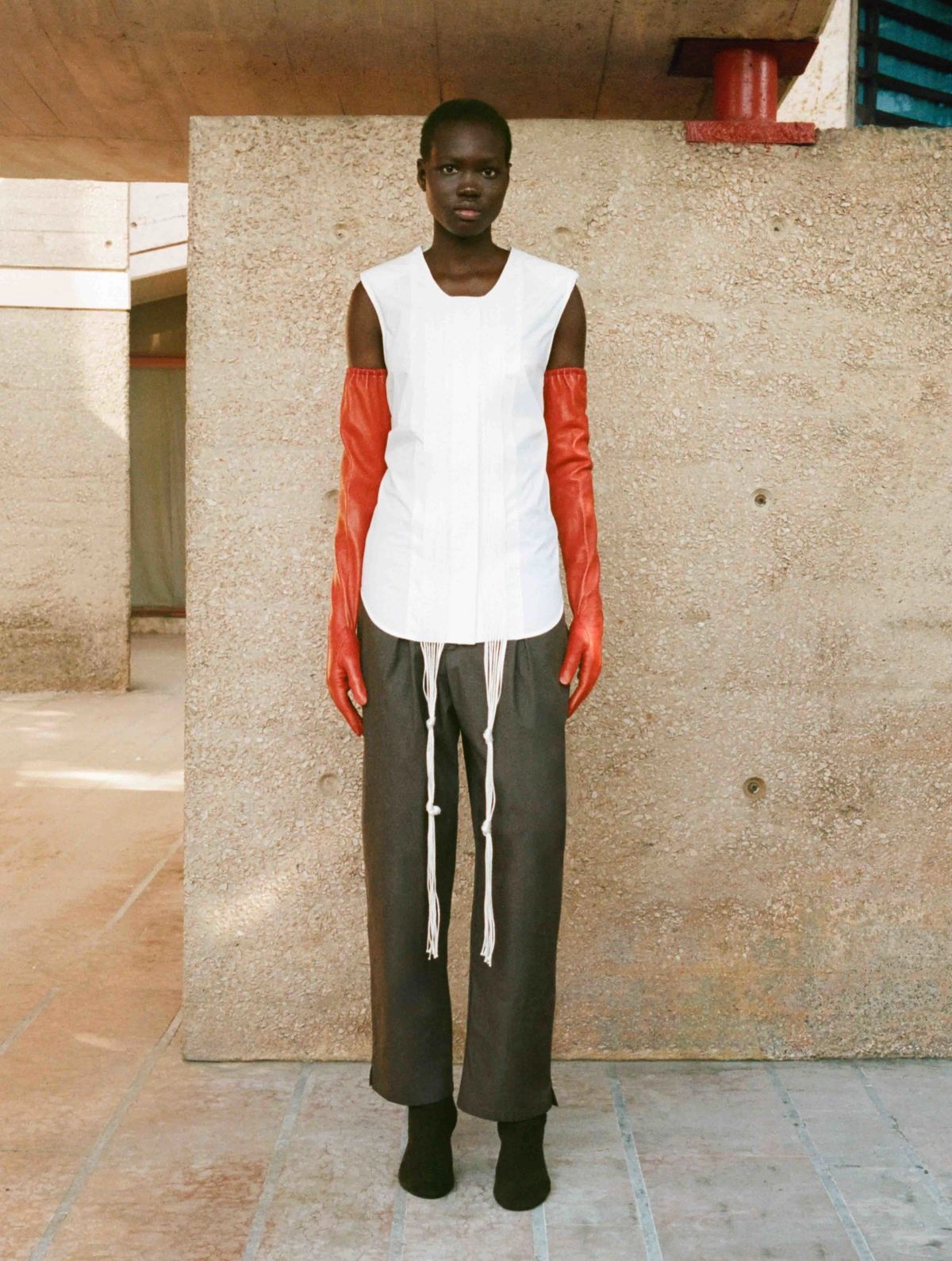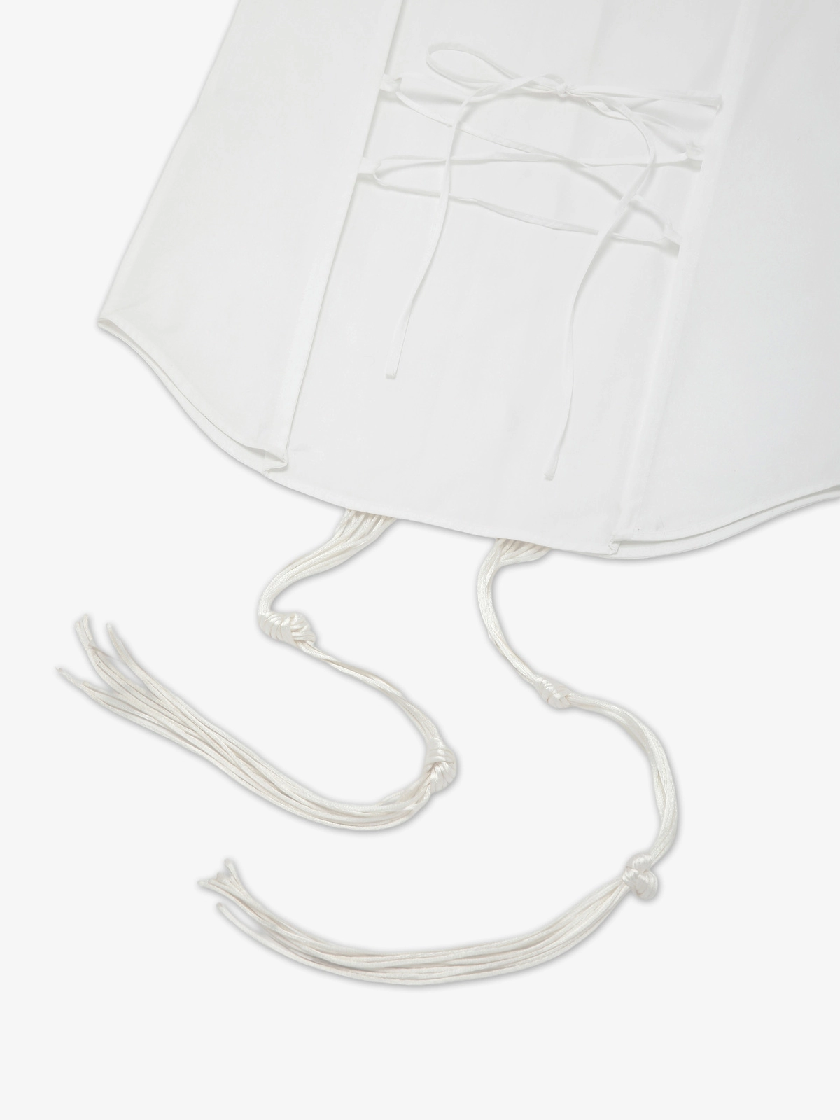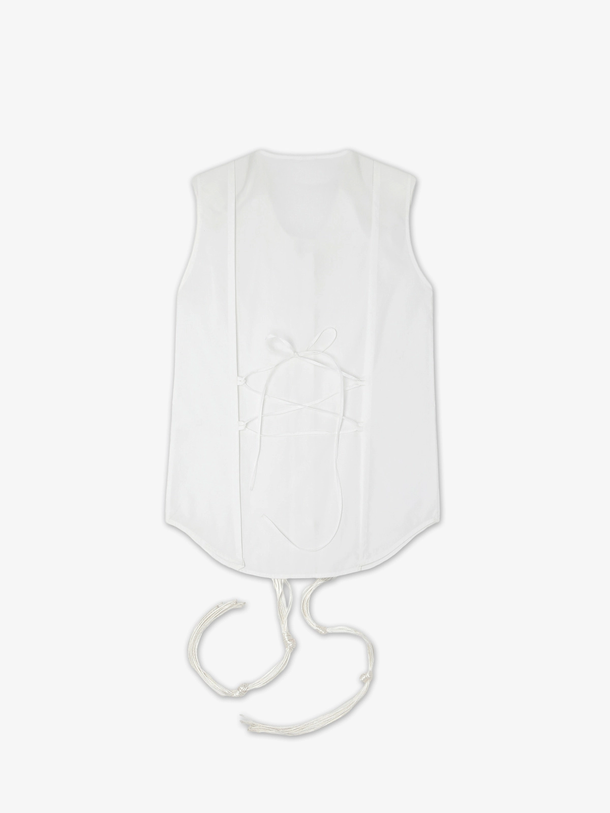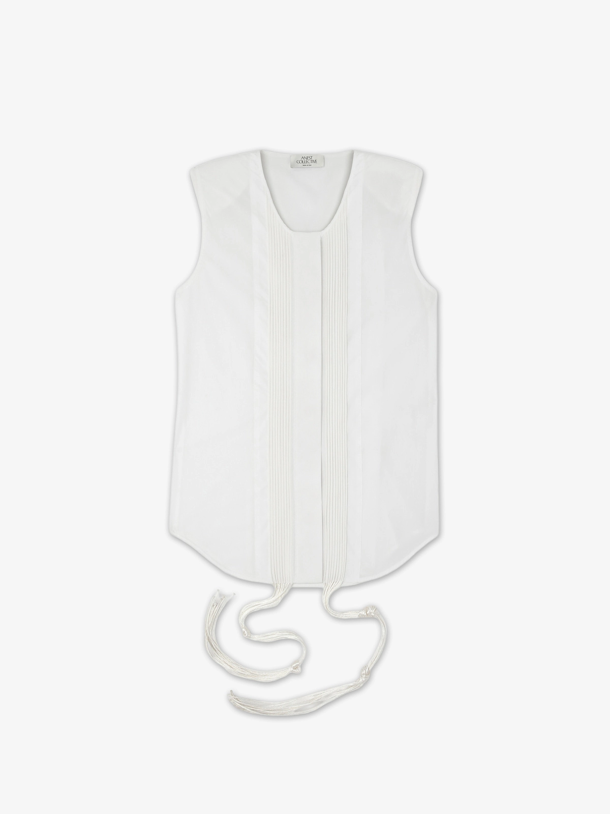 Sleeveless top crafted from a soft cotton-blend fabric, featuring concealed mother-of-pearl buttons along the front. Designed with detachable padded shoulders for added structure and versatility. Embroidered plastron adorned with multiple cotton piping, left loose to create soft fringe-like strands, casually knotted at varying lengths for a relaxed, artisanal effect, while a loop and string accent gracefully complete the back.