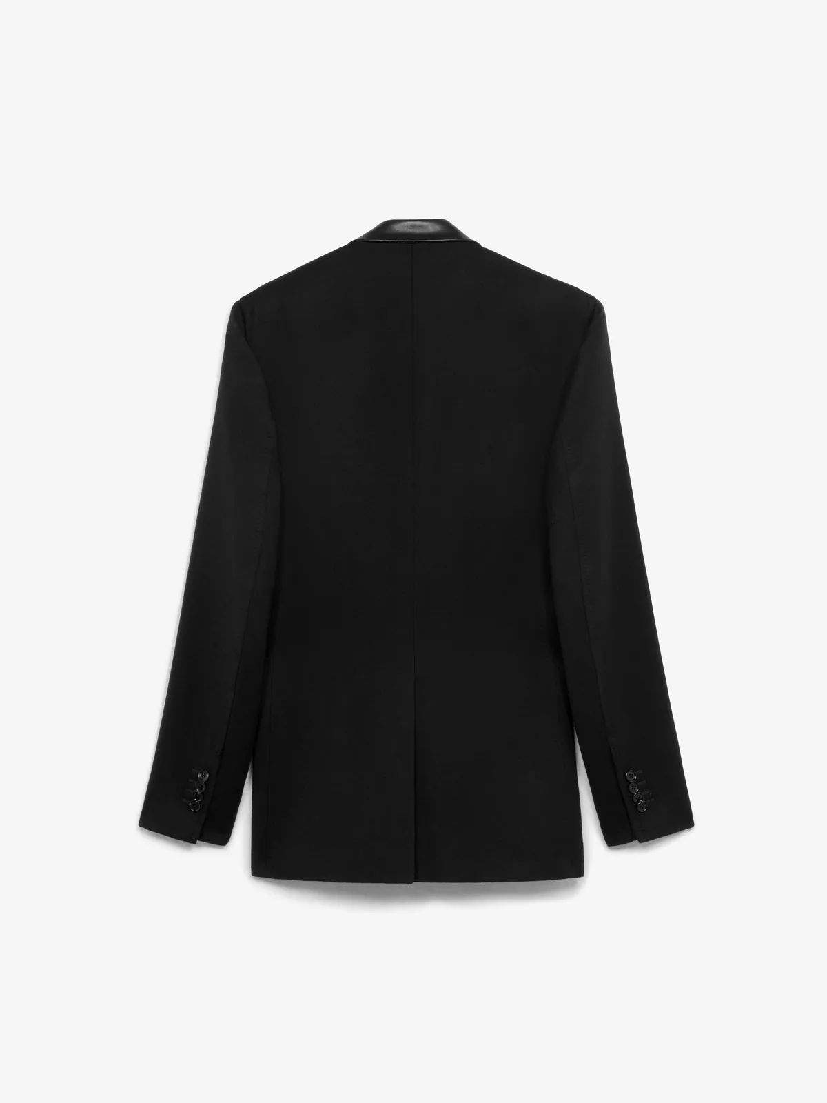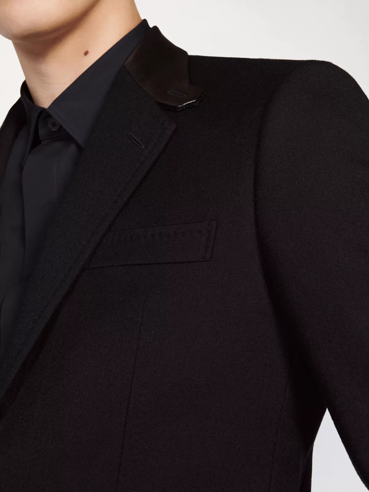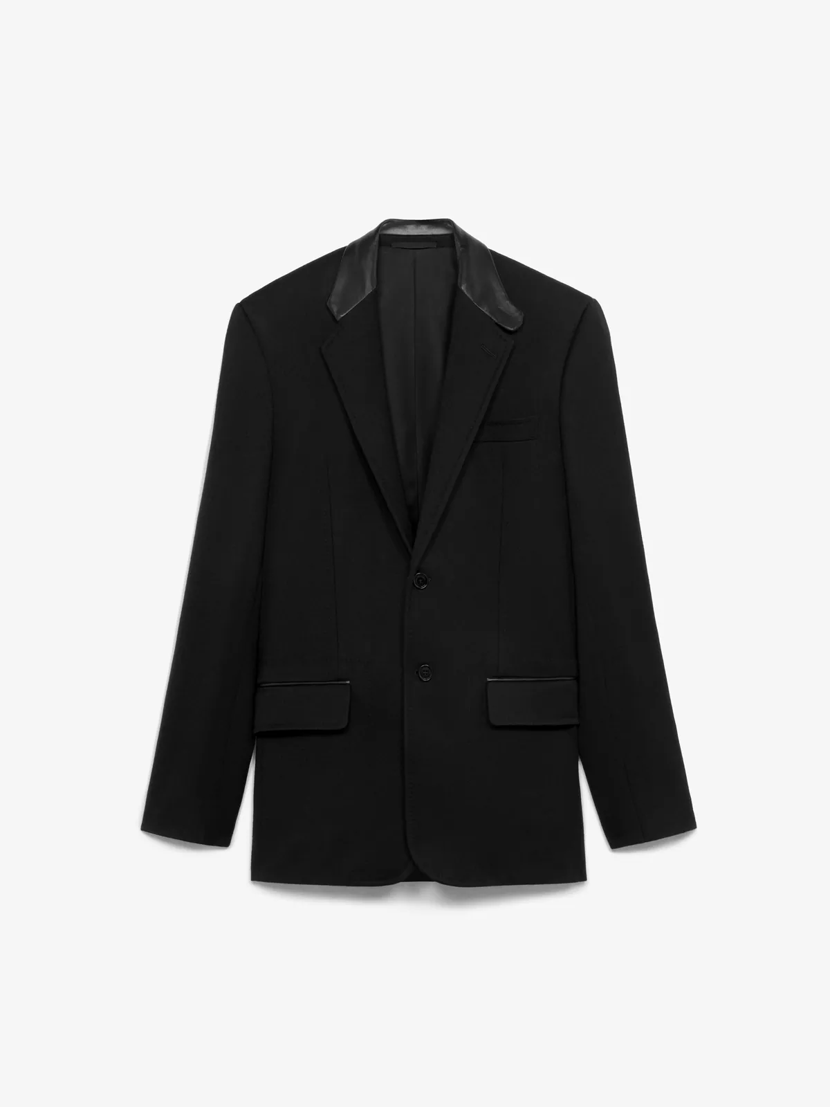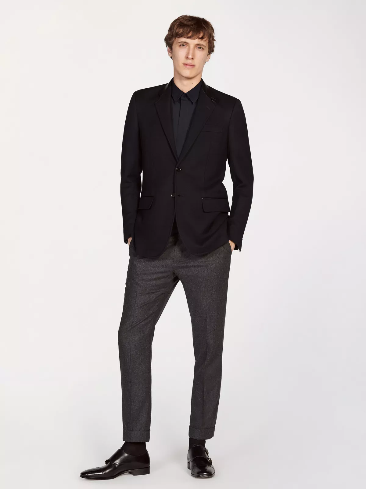 This single-breasted jacket is cut a wool blend and shaped to a slim-fit silhouette, with a front button closure, flap pockets, and notch lapels with leather detailing and pick stitching.