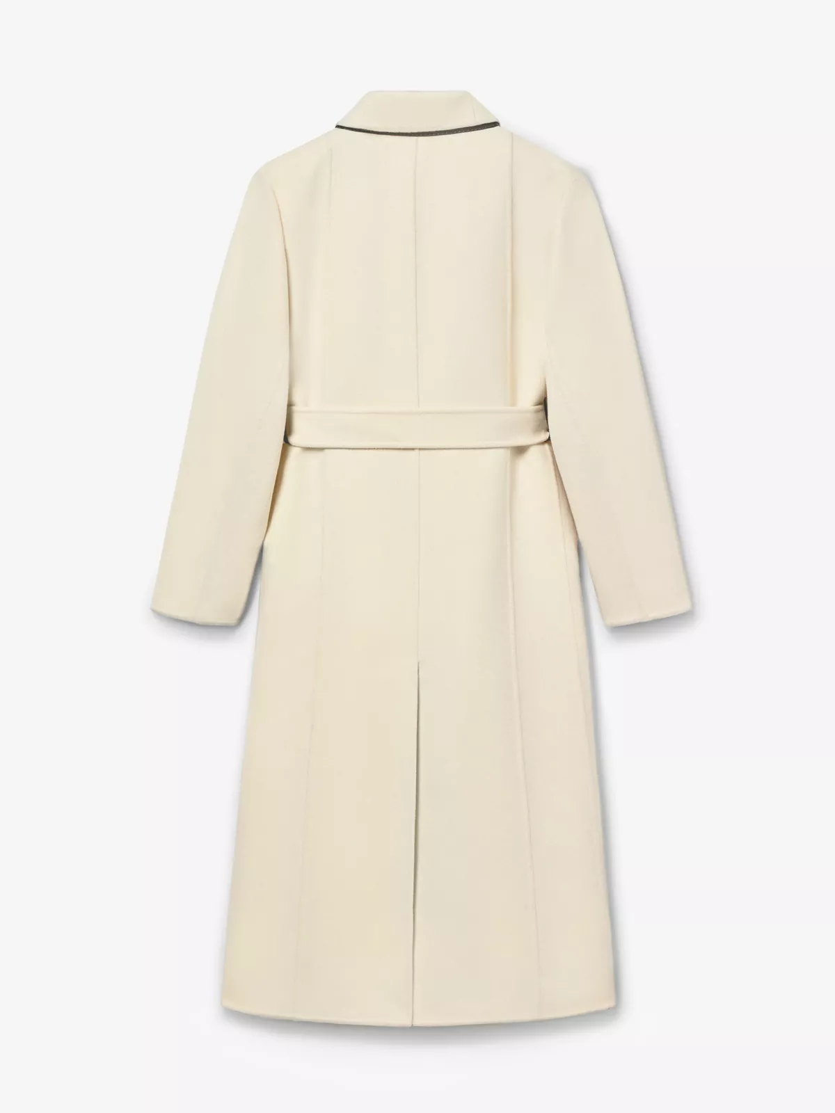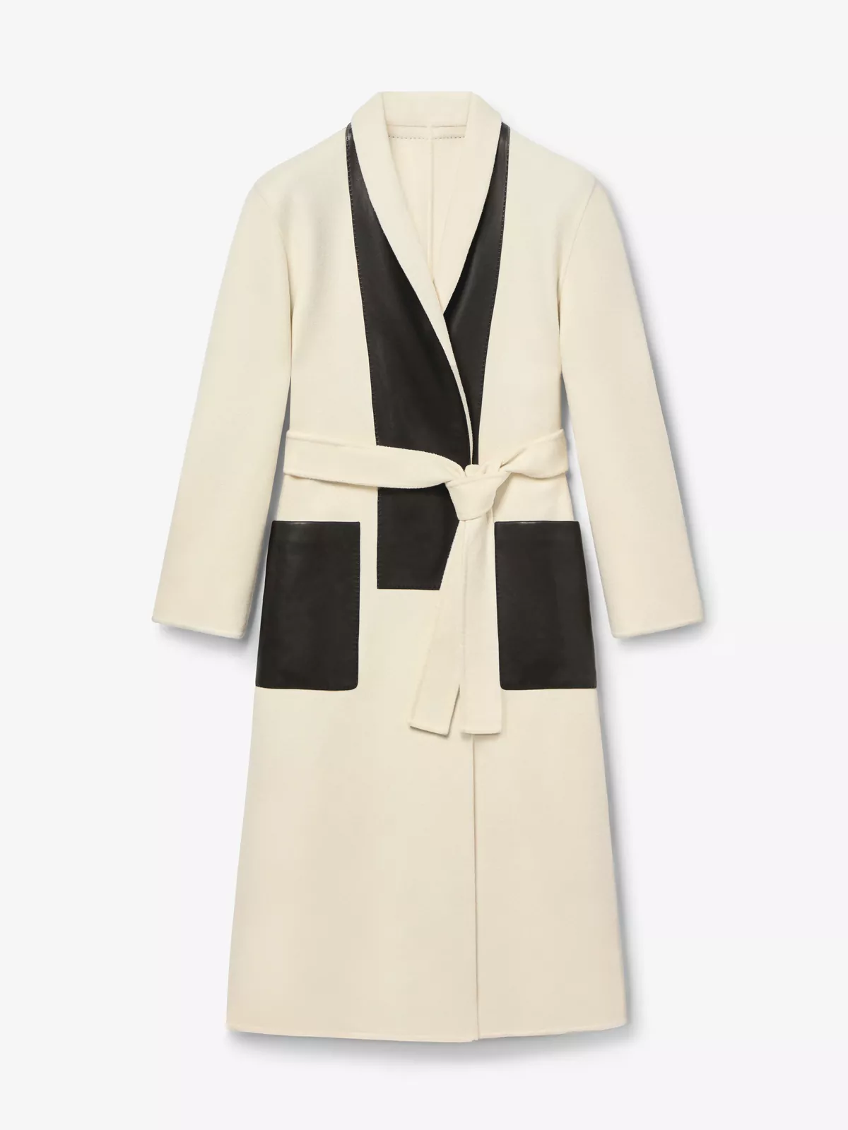 Made from a luxurious double-face cashmere, this wrap coat has two deep side vents for added movement, a waist-cinching wrap belt and a leather shawl collar and patch pockets.