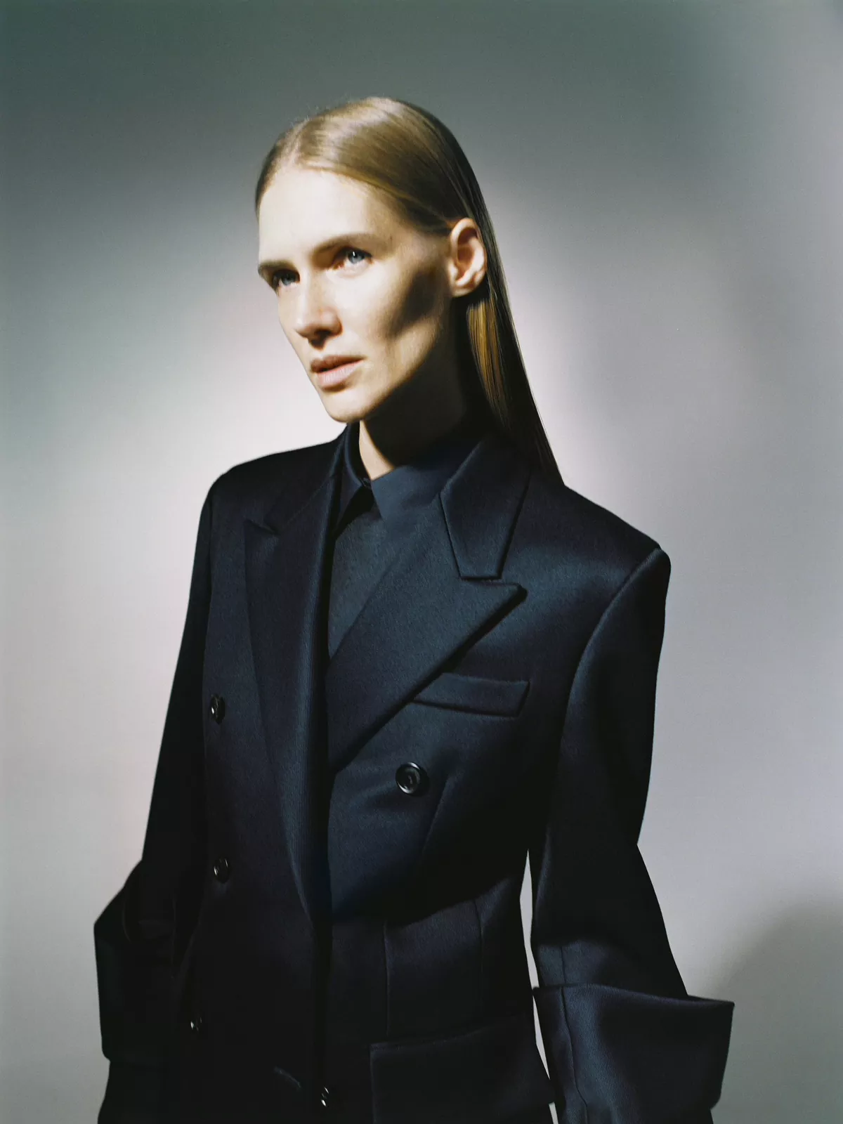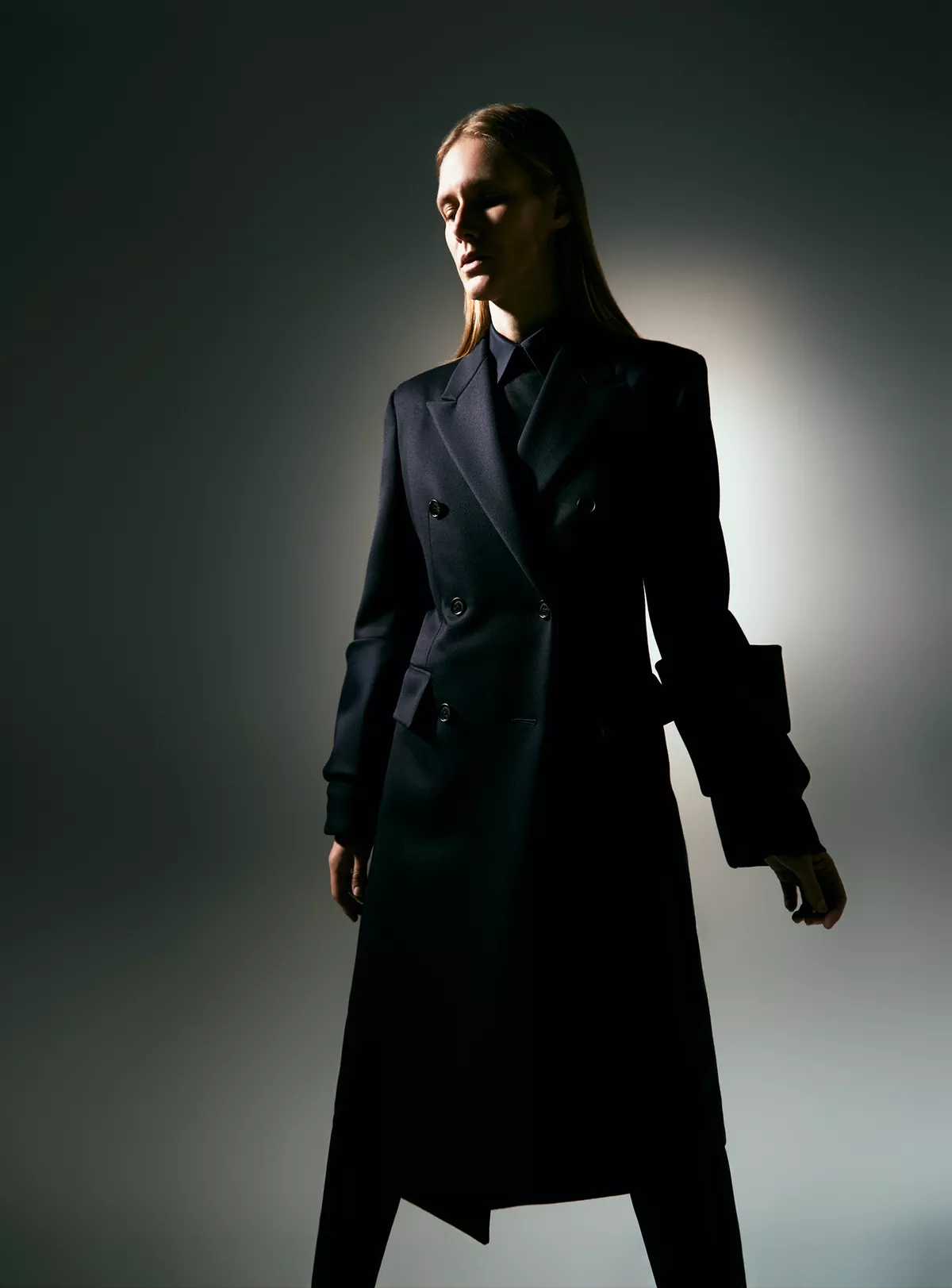 This double-breasted coat is cut from a virgin wool twill and crafted to a slim fit, with peak lapels, front flap pockets and oversized cuffs in a contrasting mohair-wool blend.