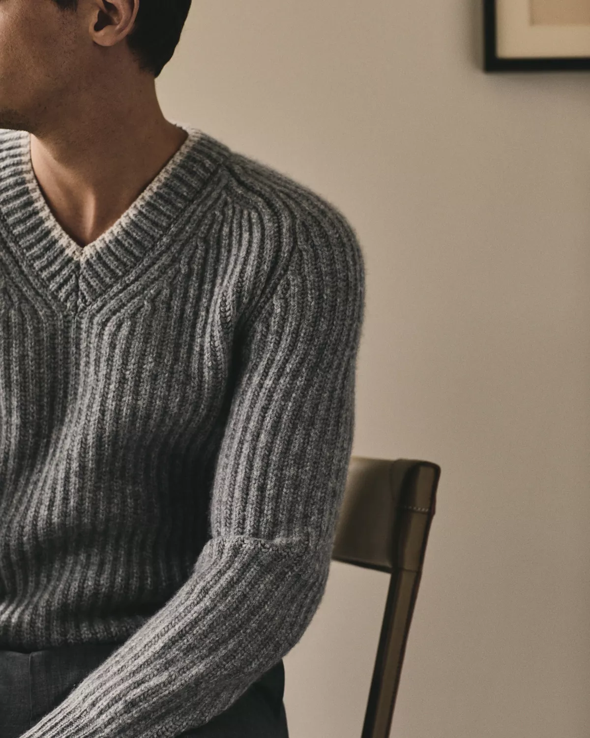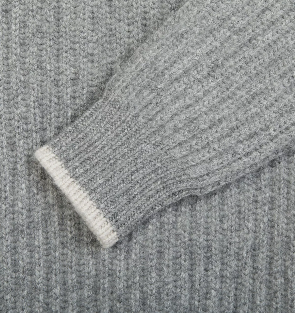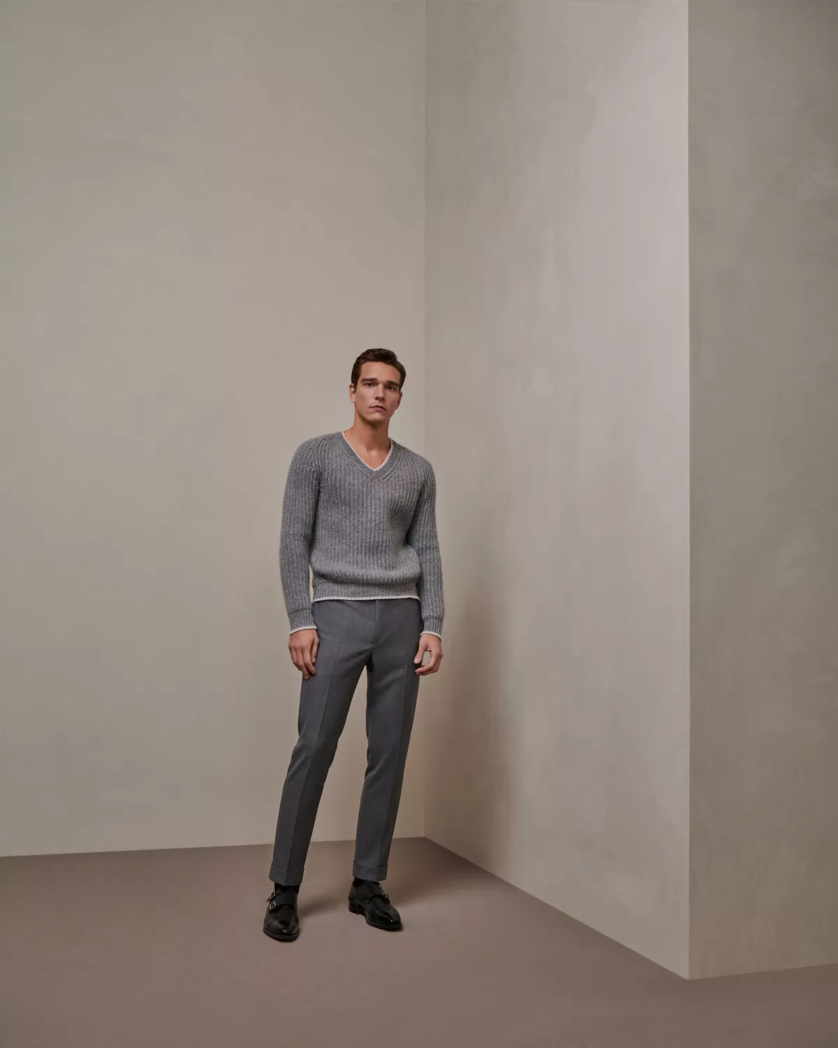 This Light Grey V-Neck sweater is knitted in a fisherman rib in pure cashmere for the ultimate warmth and comfort. It features an in-contrast trim on neck, hem and cuffs.
