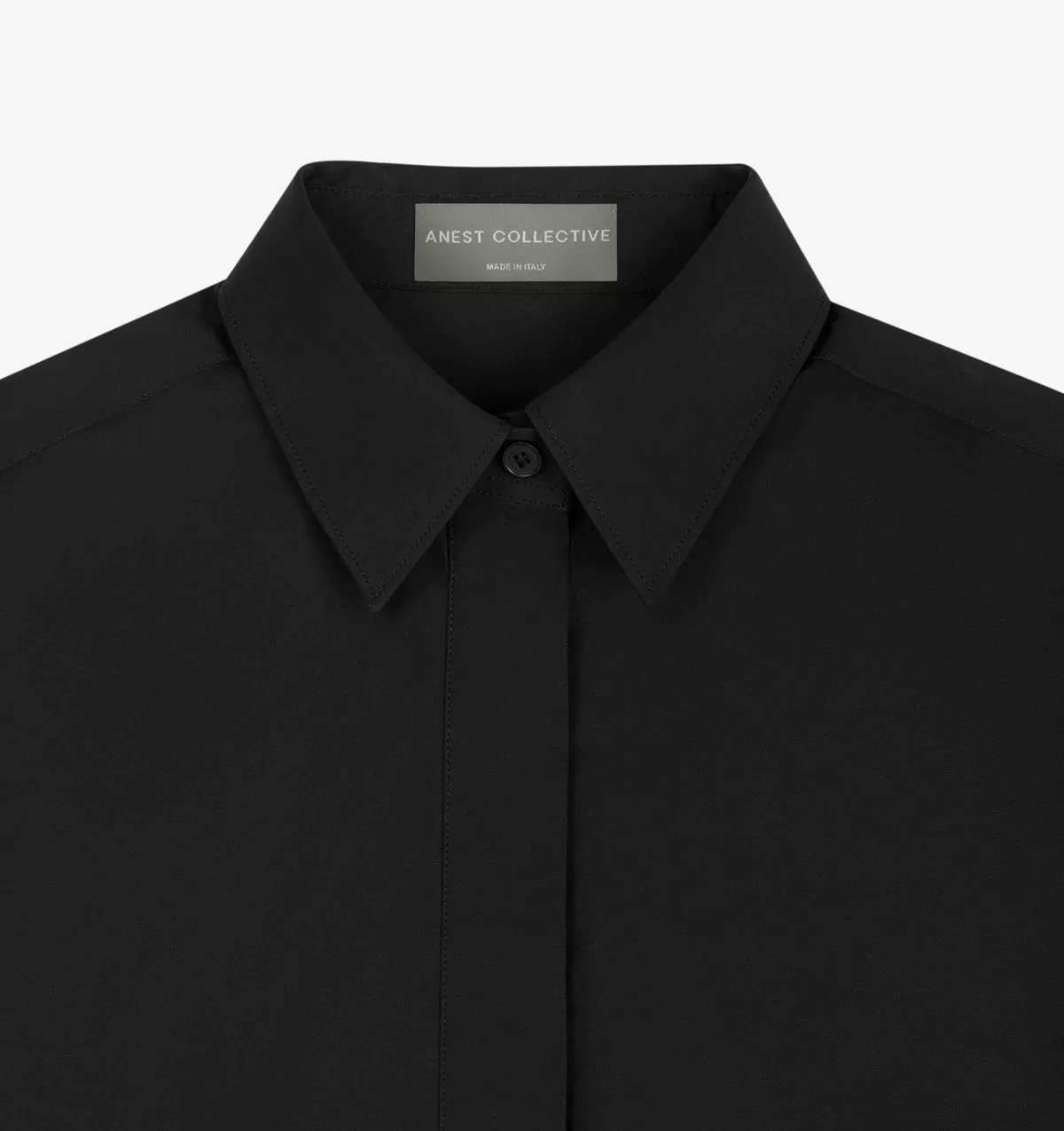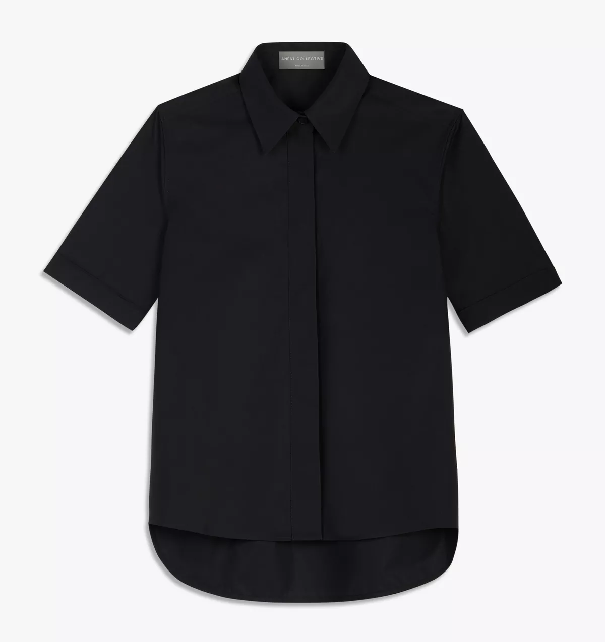 ANEST COLLECTIVE believes that tailored pieces, such as this cotton blouse, are an everyday exercise in sophistication. Made in Italy from shiny poplin cotton, it is shaped into an oversized silhouette with a point collar, short sleeves. The button placket is hidden to emphasize the streamlined appearance of the piece.