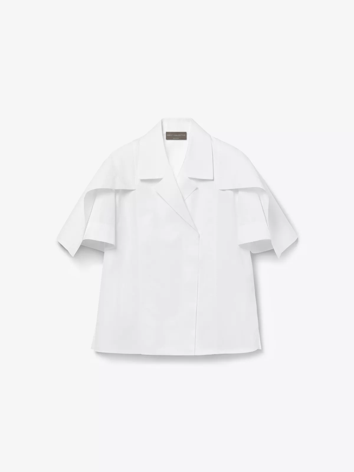 This cotton-poplin shirt is shaped to a double-breasted silhouette, with a concealed front placket, a nipped-in waist, statement collar and short, puffed sleeves.