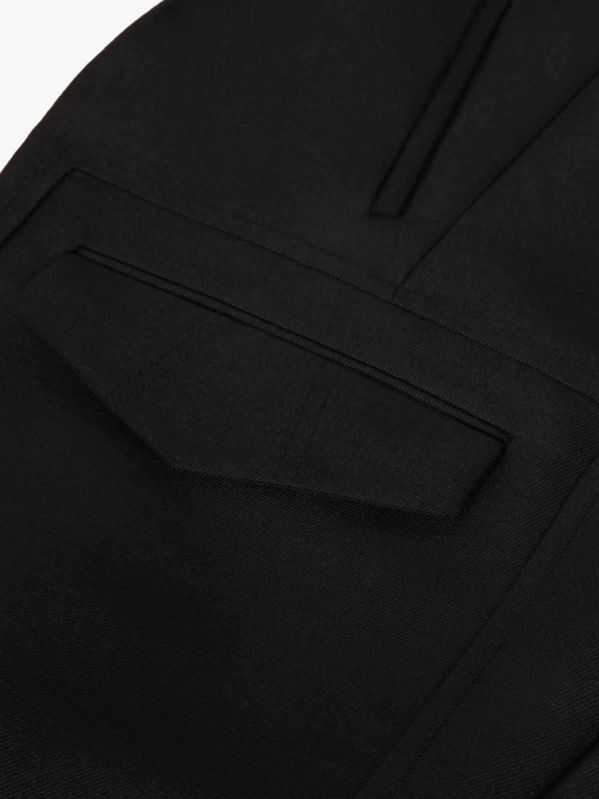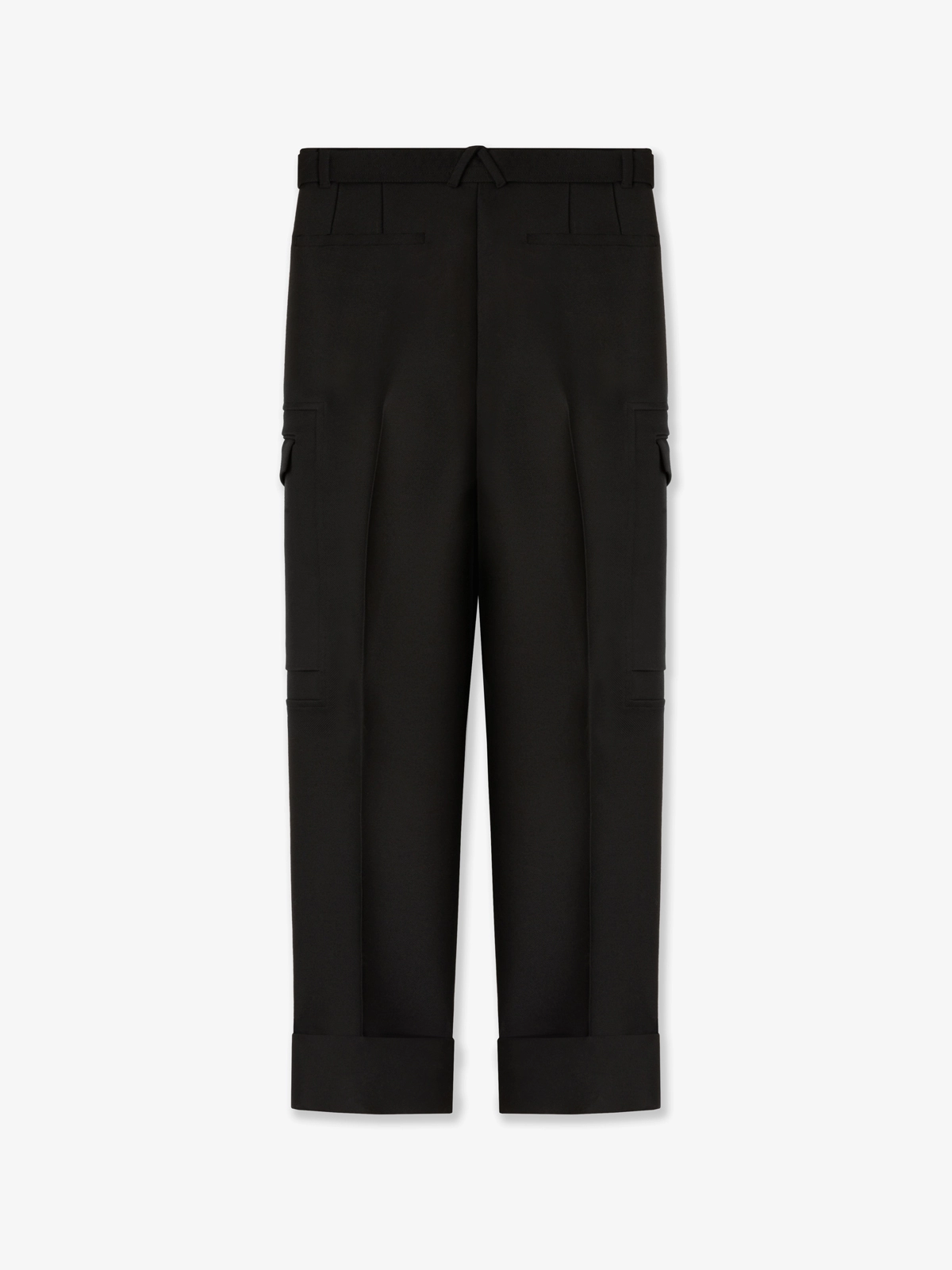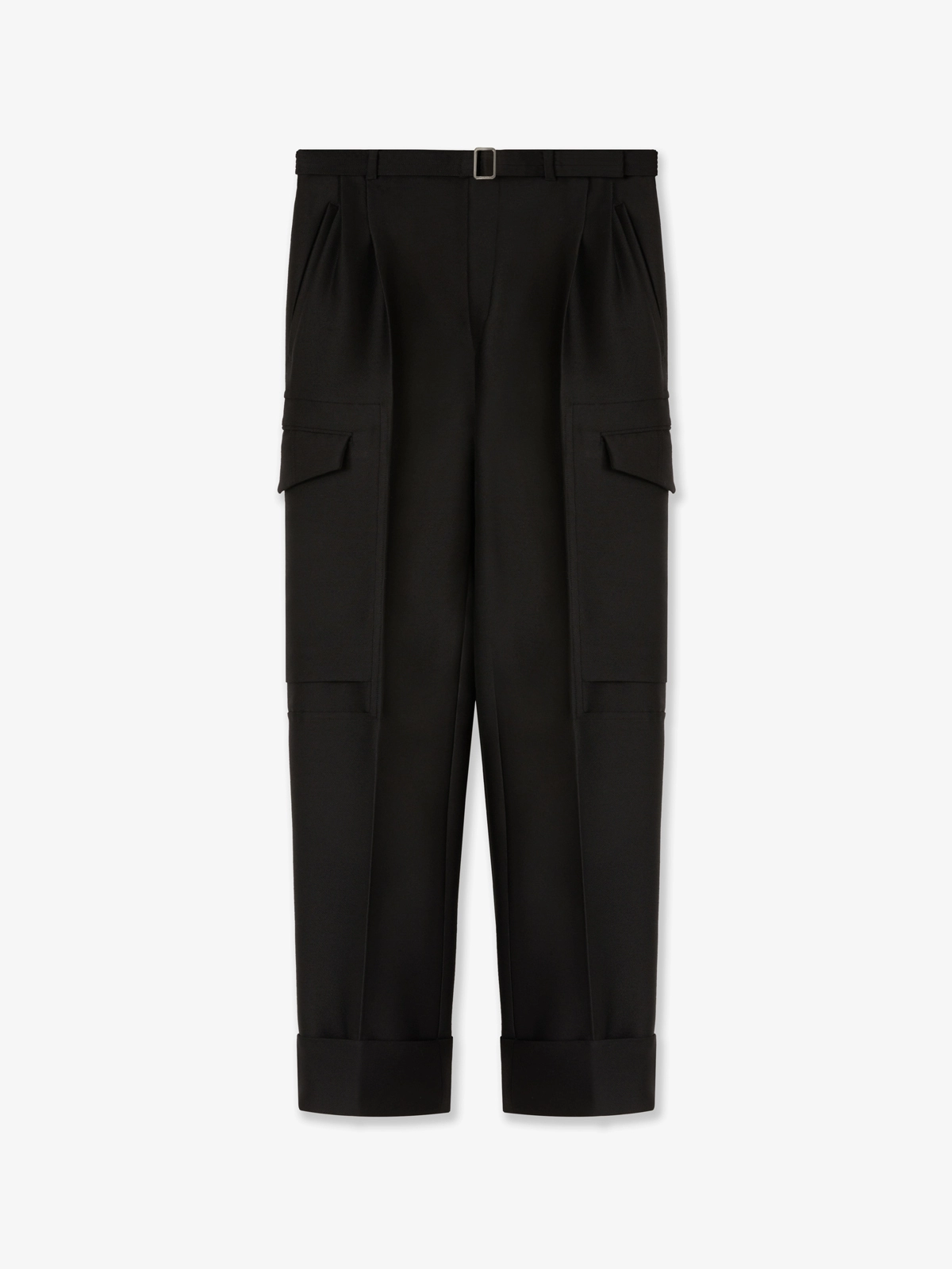 These on-trend cargo trousers have been cut to a wide fit from a wool blend, with a self-covered belt and metal buckle, and two diagonal utility-style side pockets.