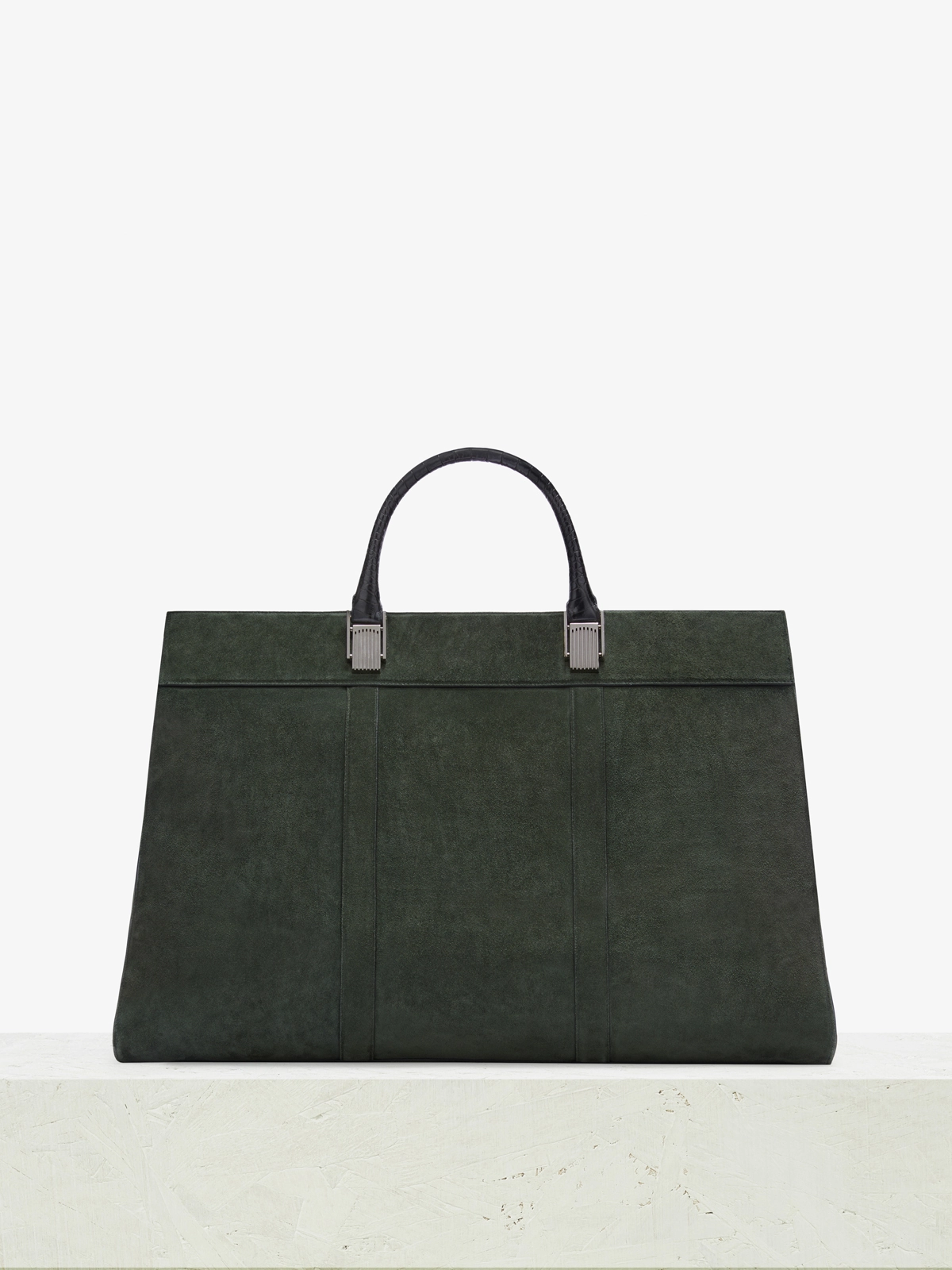 This travel bag is made from a suede calf leather with crocodile-print-effect handles and a detachable shoulder strap, protective feet and soft-silver metal detailing.