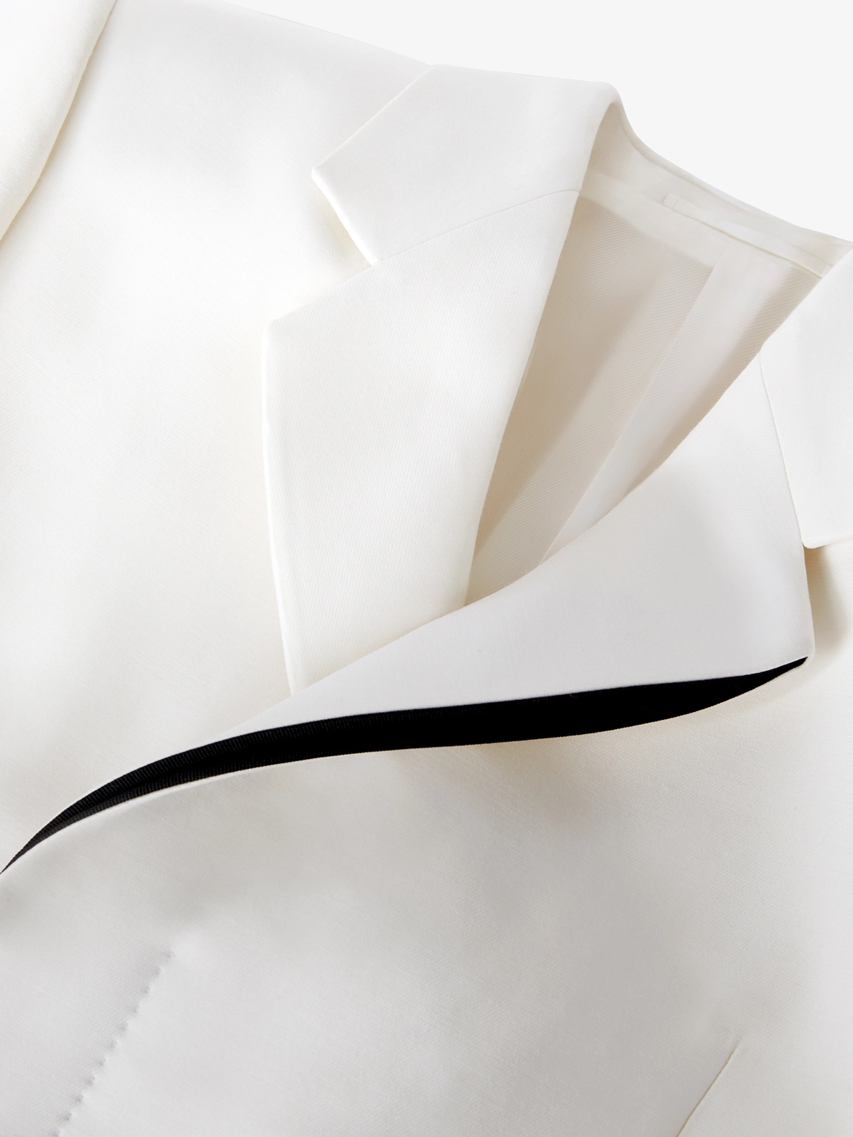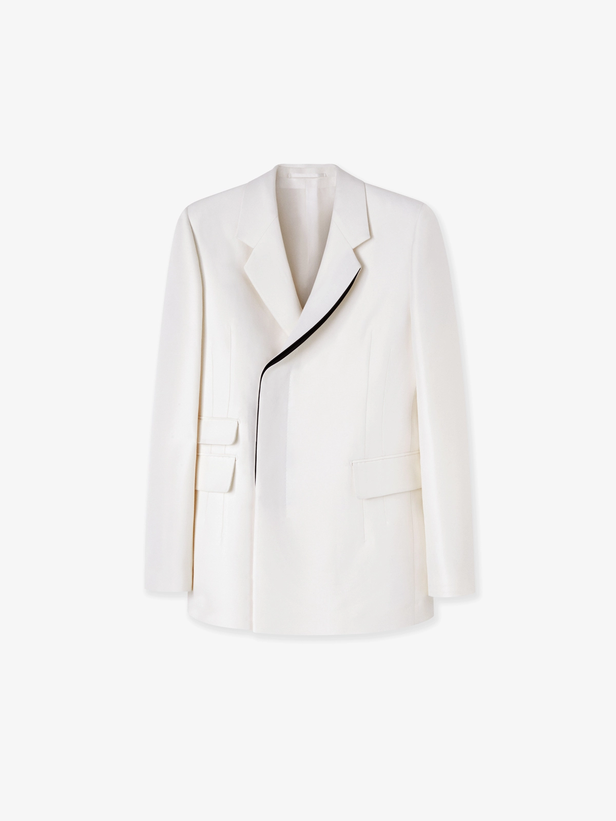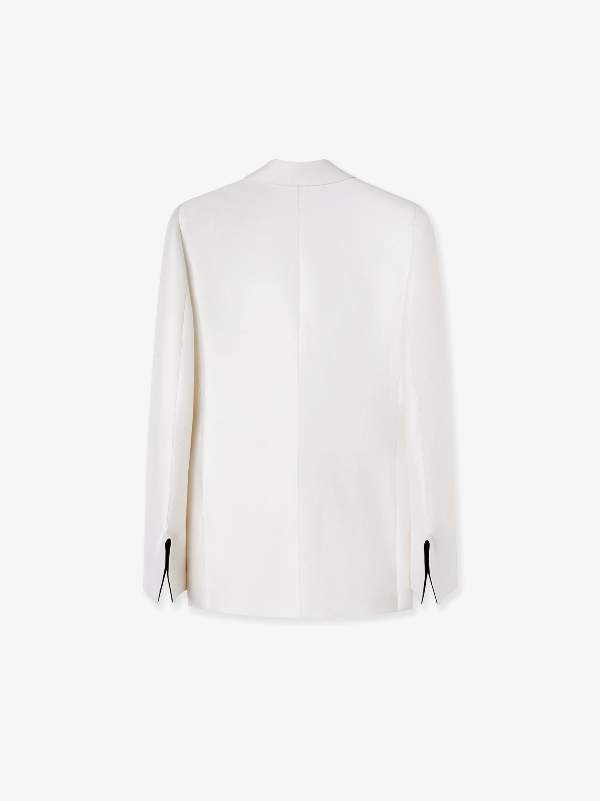 This timeless longline jacket has been crafted from a soft wool-silk blend in a slim, double-breasted silhouette with a contrasting cannetté collar detail and softly defined shoulders.