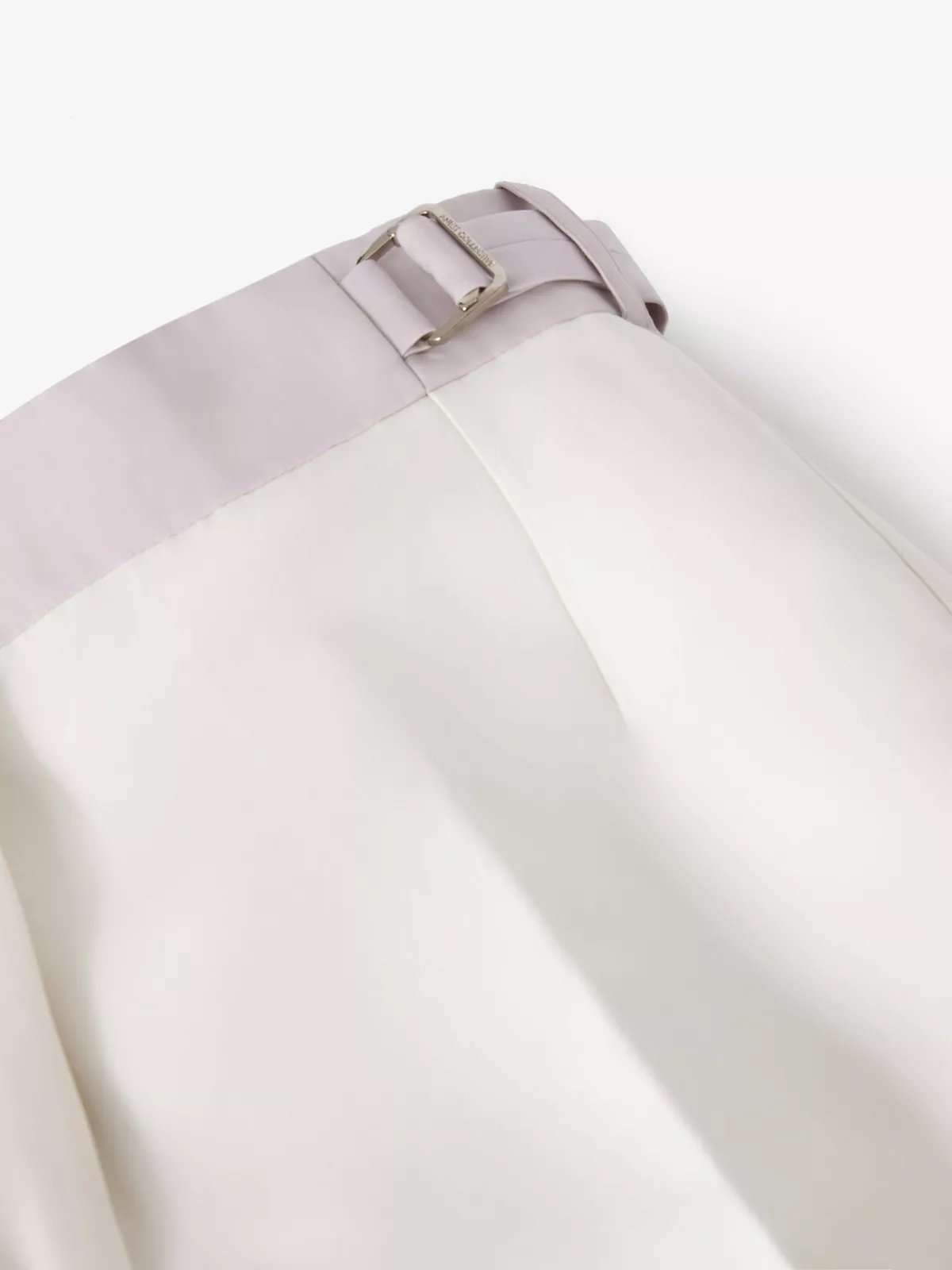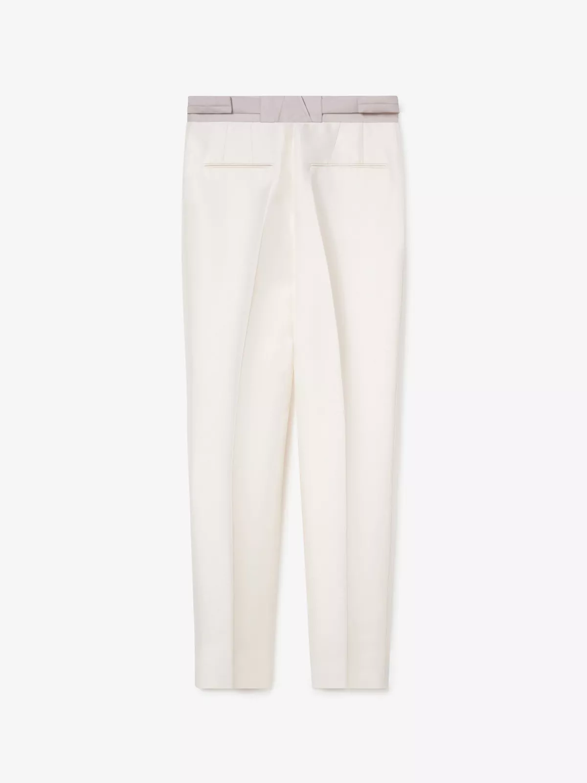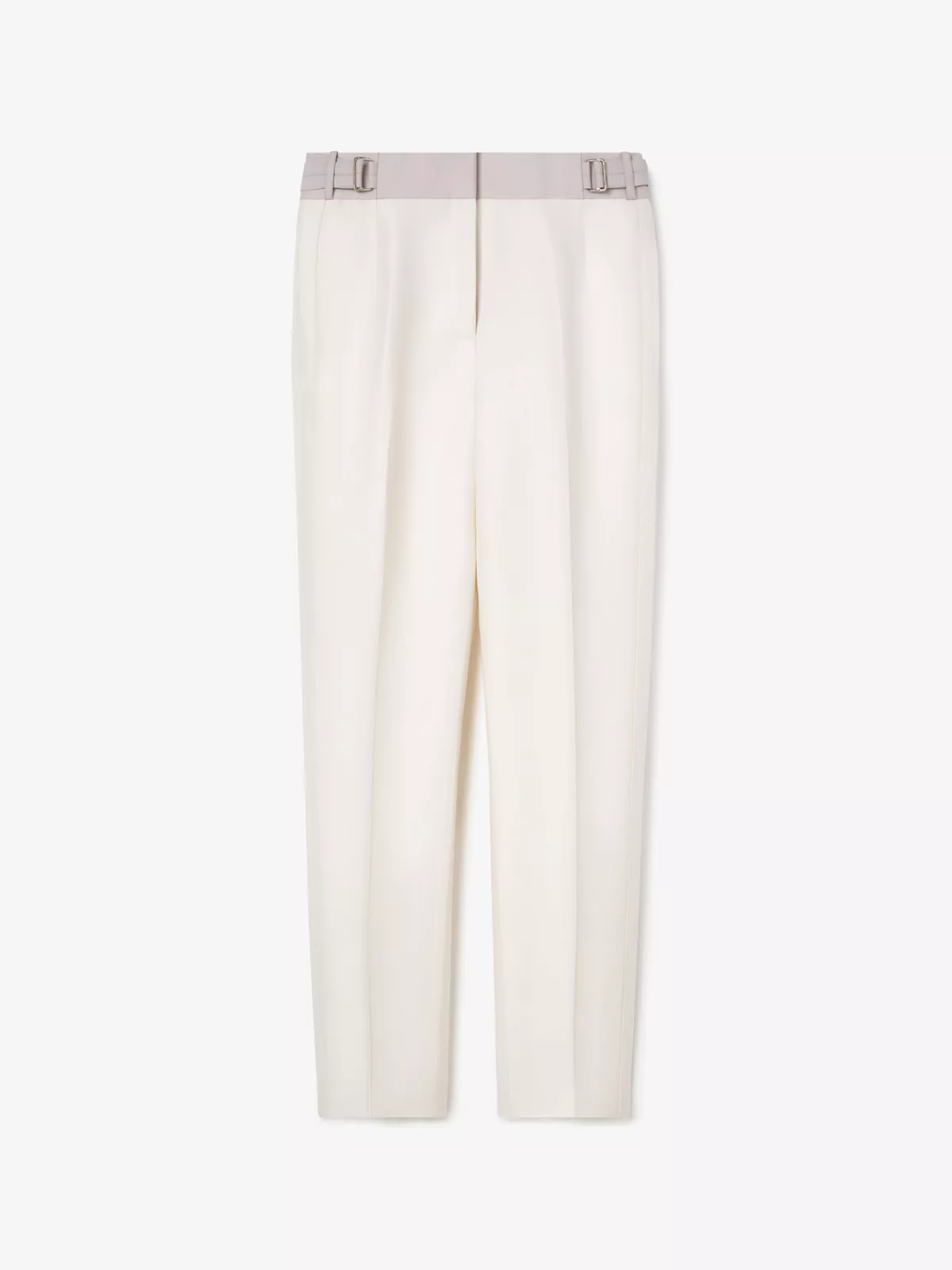 These elegant high-waisted trousers are made from a wool-silk blend in a straight silhouette with a contrasting waistband with adjustable cufflinks and soft creases to enhance the shape.