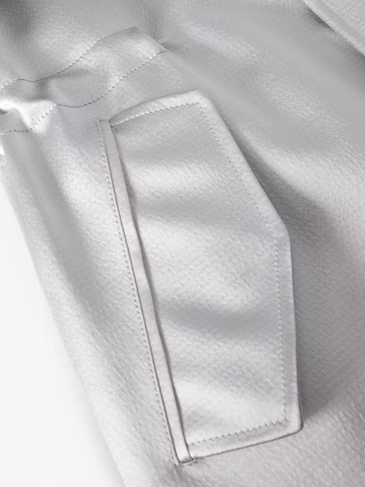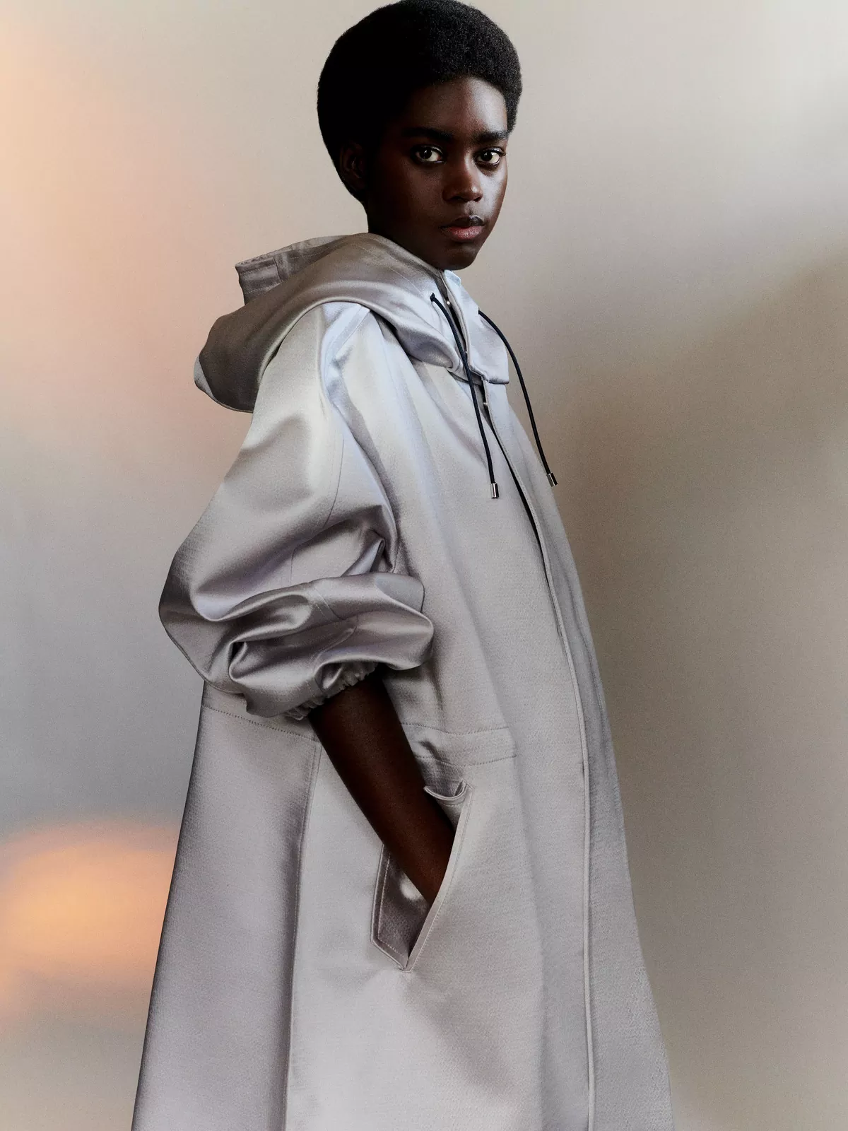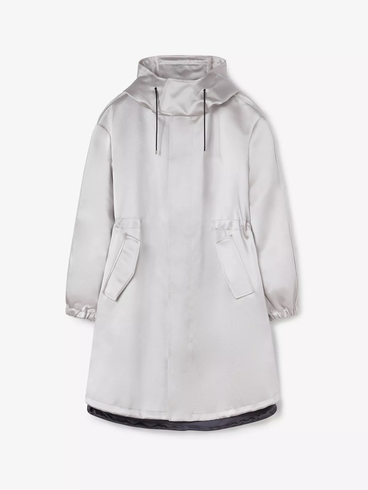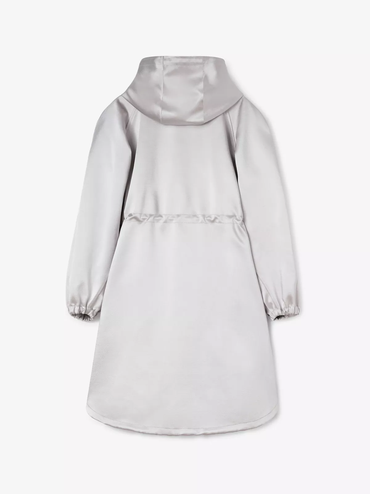 Designed in a luminescent silk blend, this parka-style coat has been shaped to an softly oversized silhouette, with adjustable internal drawstrings to enhance the shape, raglan sleeves, a circle hemline and angled side pockets.