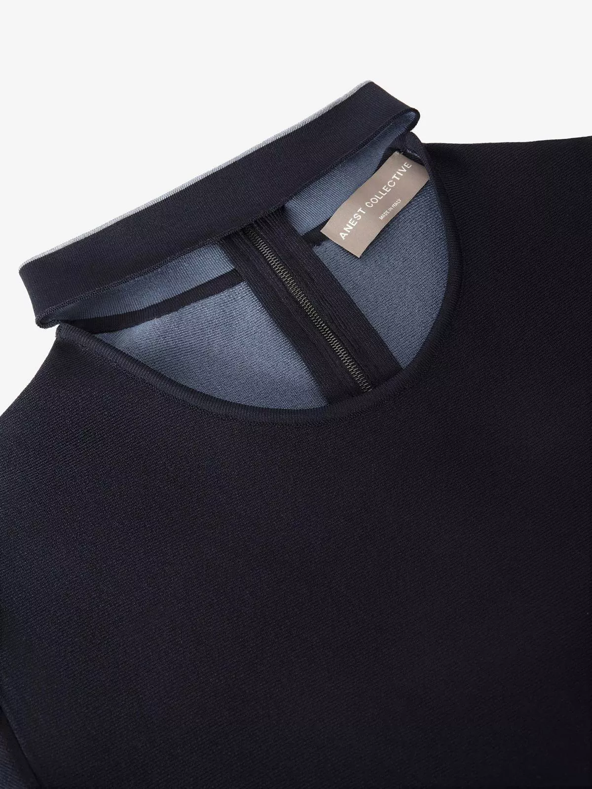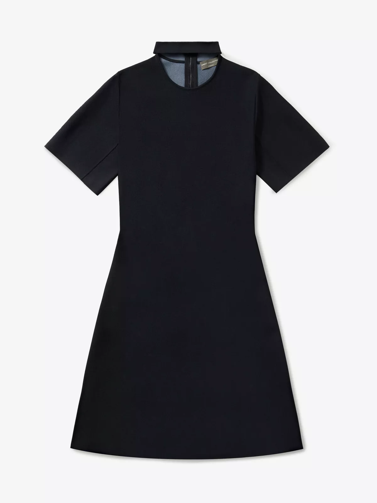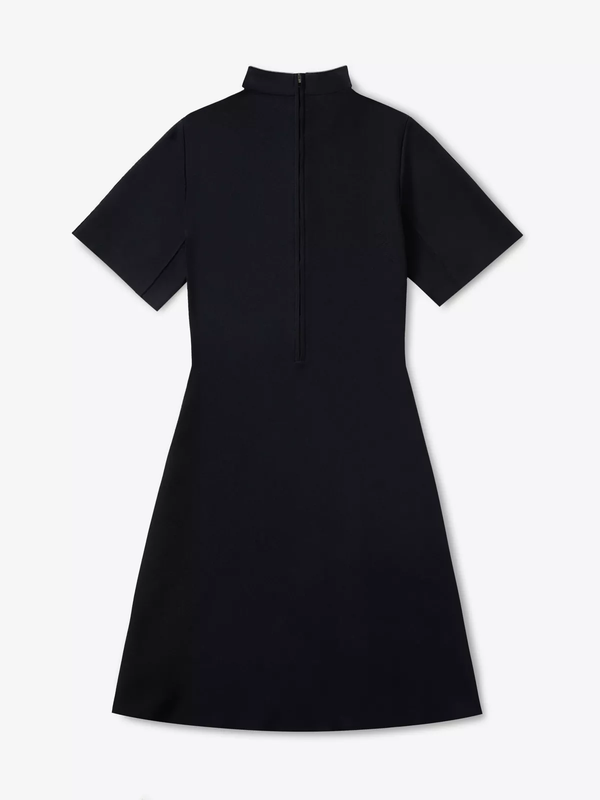 Made from a silk-blend knit, this short-sleeved dress is fitted at the waist before falling to a full skirt and has a statement choker-style neck.