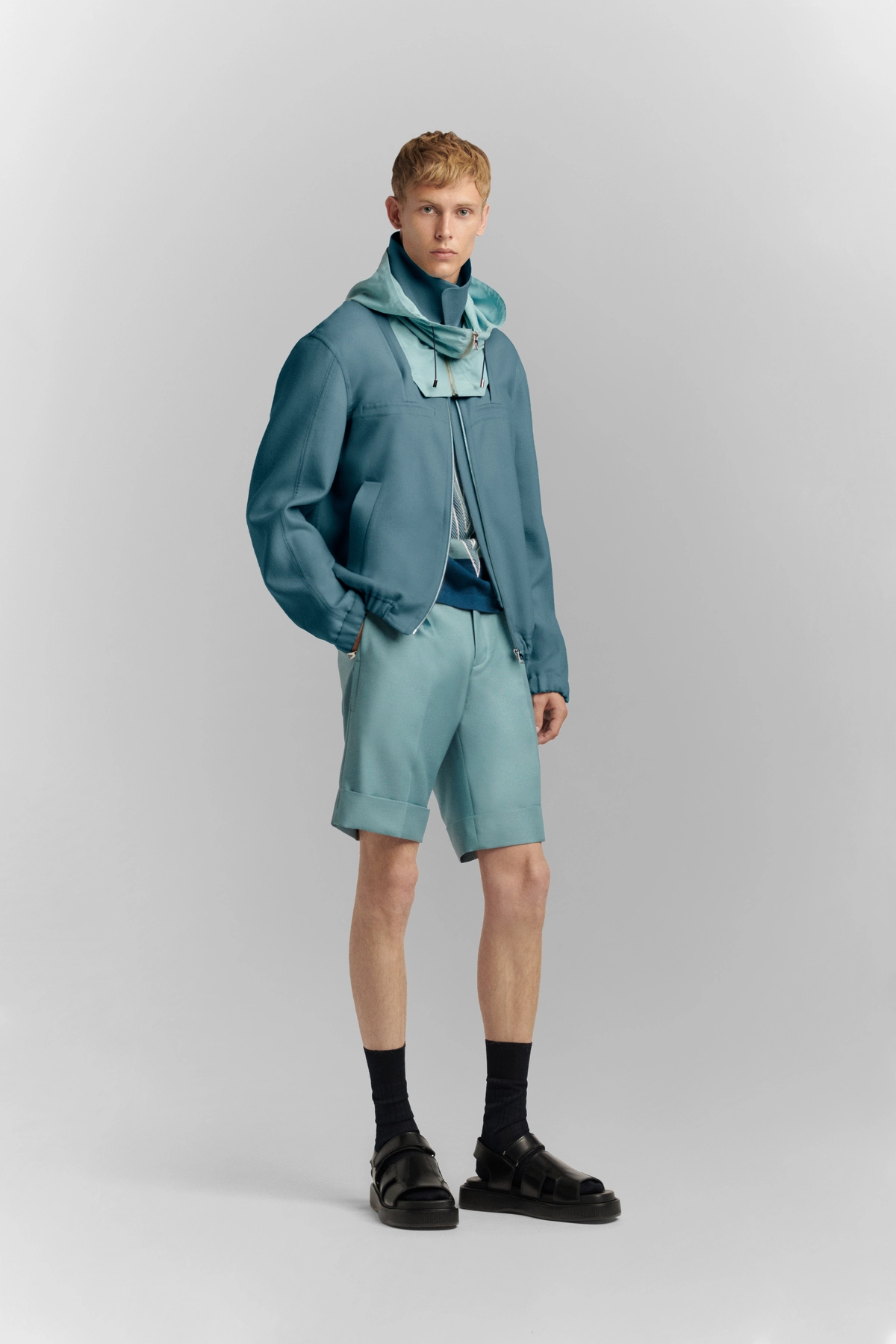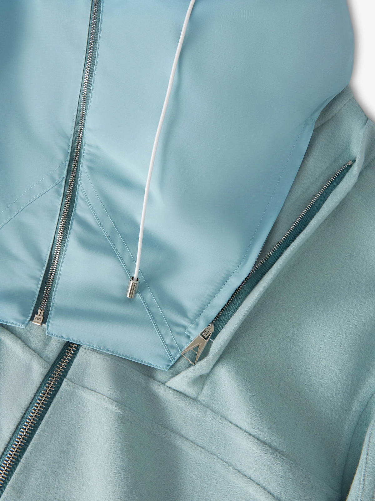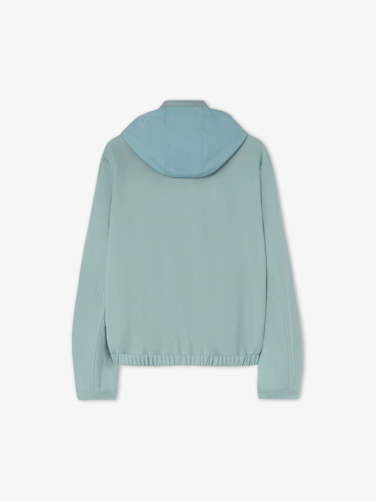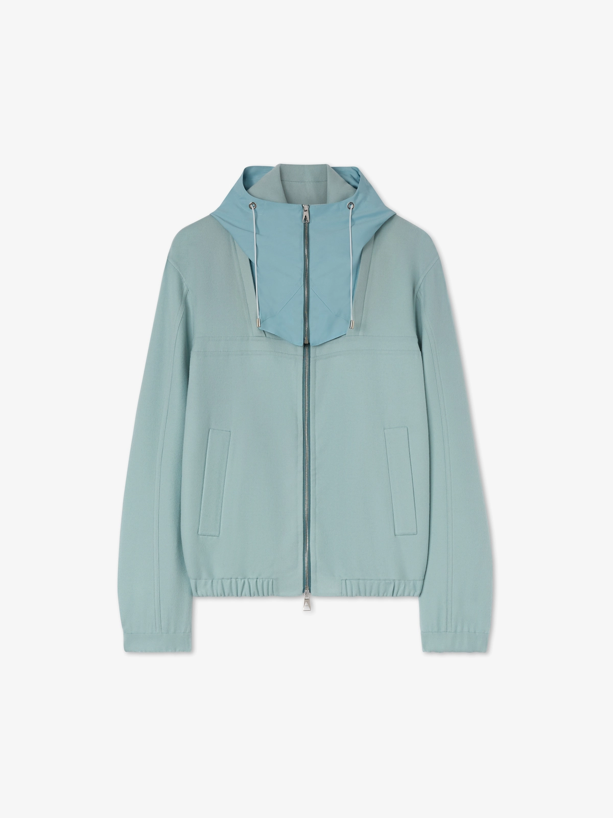 This blouson is cut in a fine Double face Merino wool fabric. It has a shirt collar and a removable hood in contrast fabric. Sleeves have silver top stitching details.