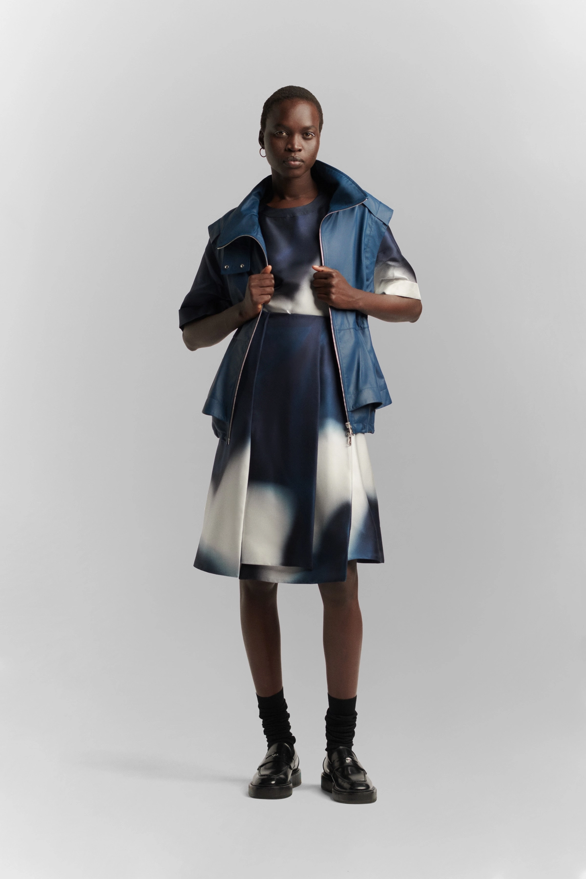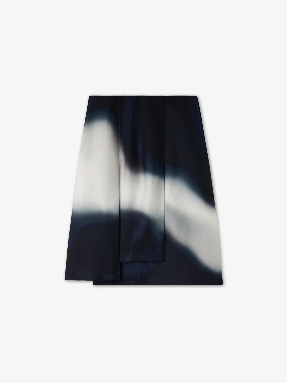 This multi Panel knee lenght skirt is crafted from a silk twill with a placed asbtract noise print.