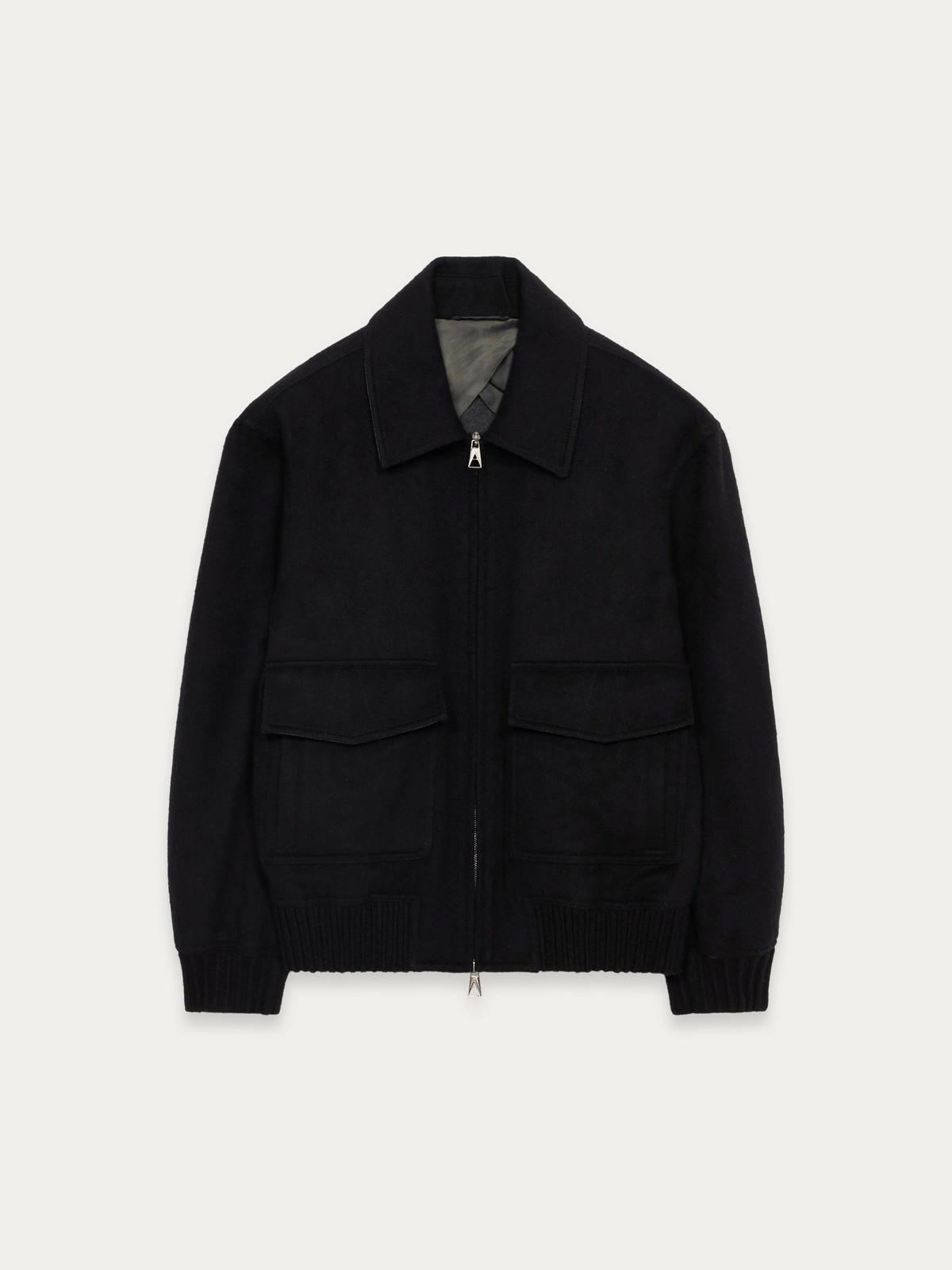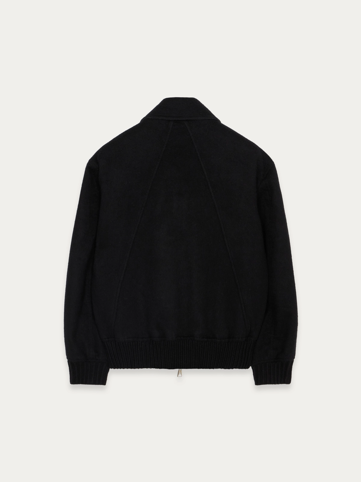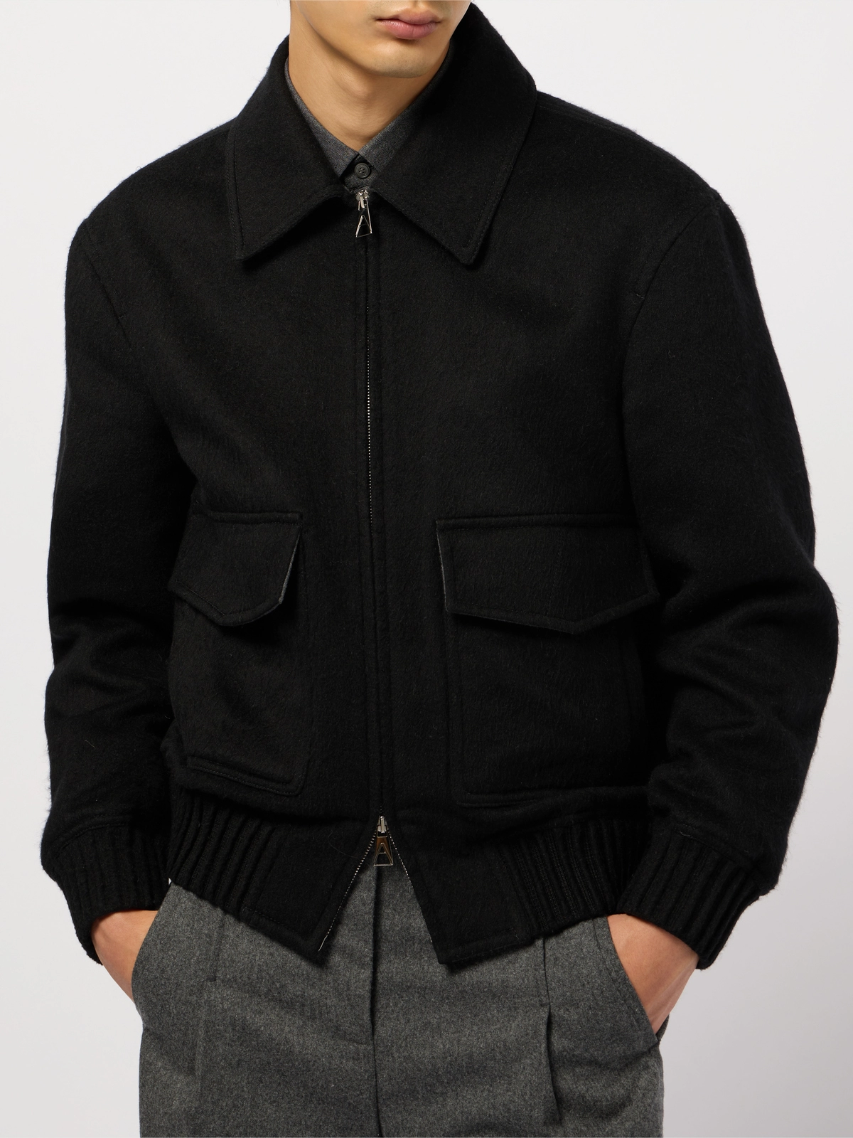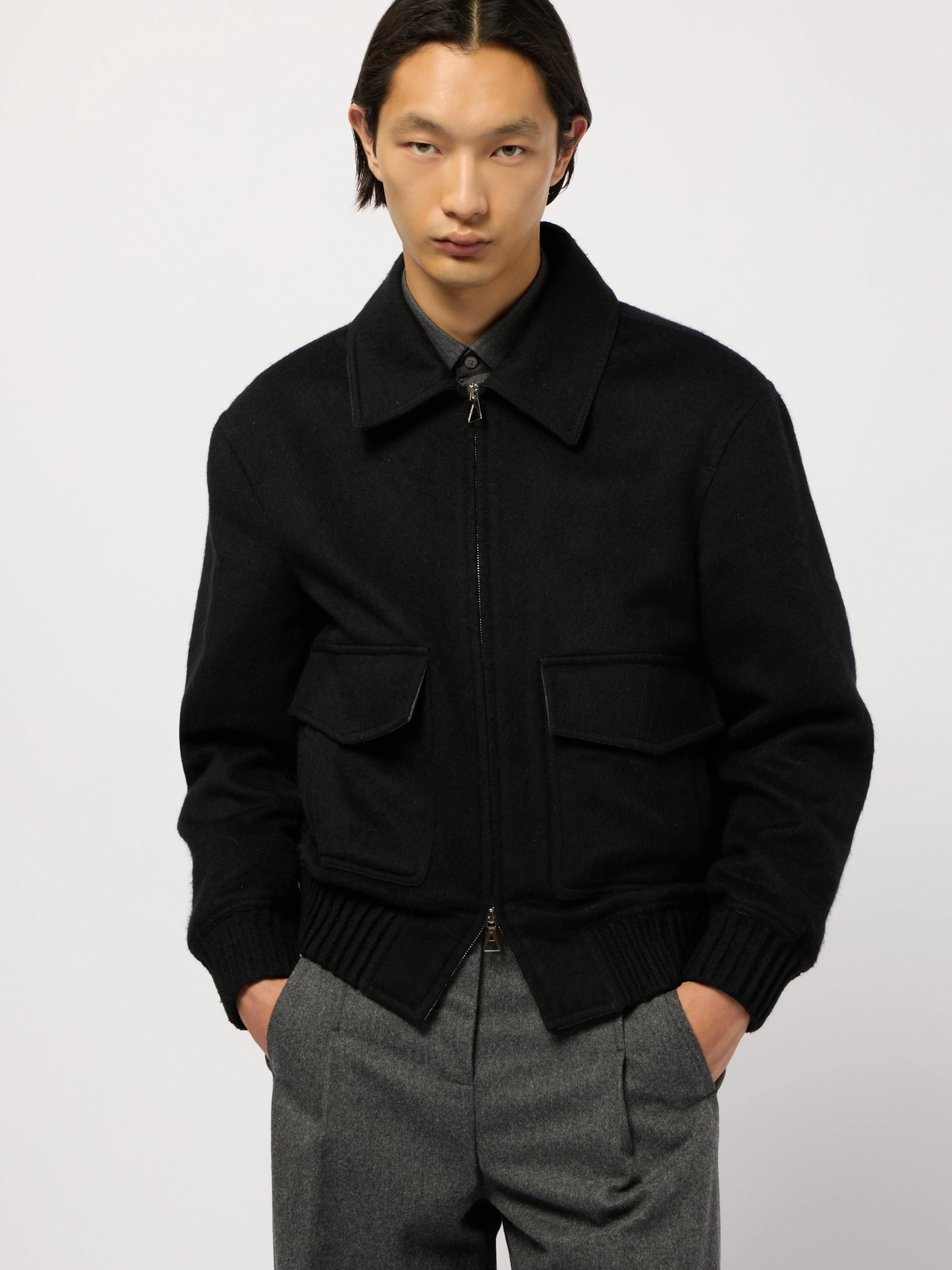 Round-shaped blouson crafted in a double virgin wool-and-silk blend. It fastens with a double zip puller. Fully unlined in double color, black on the outside and grey mélange inside.