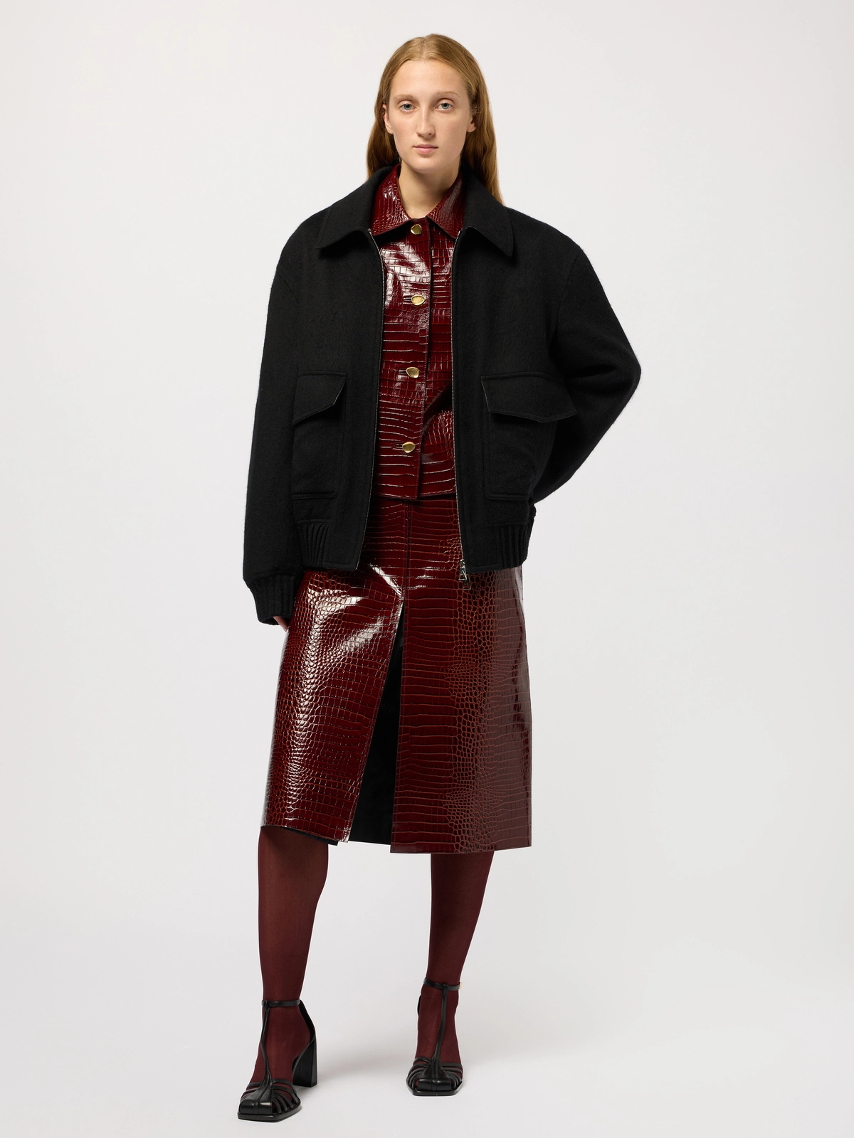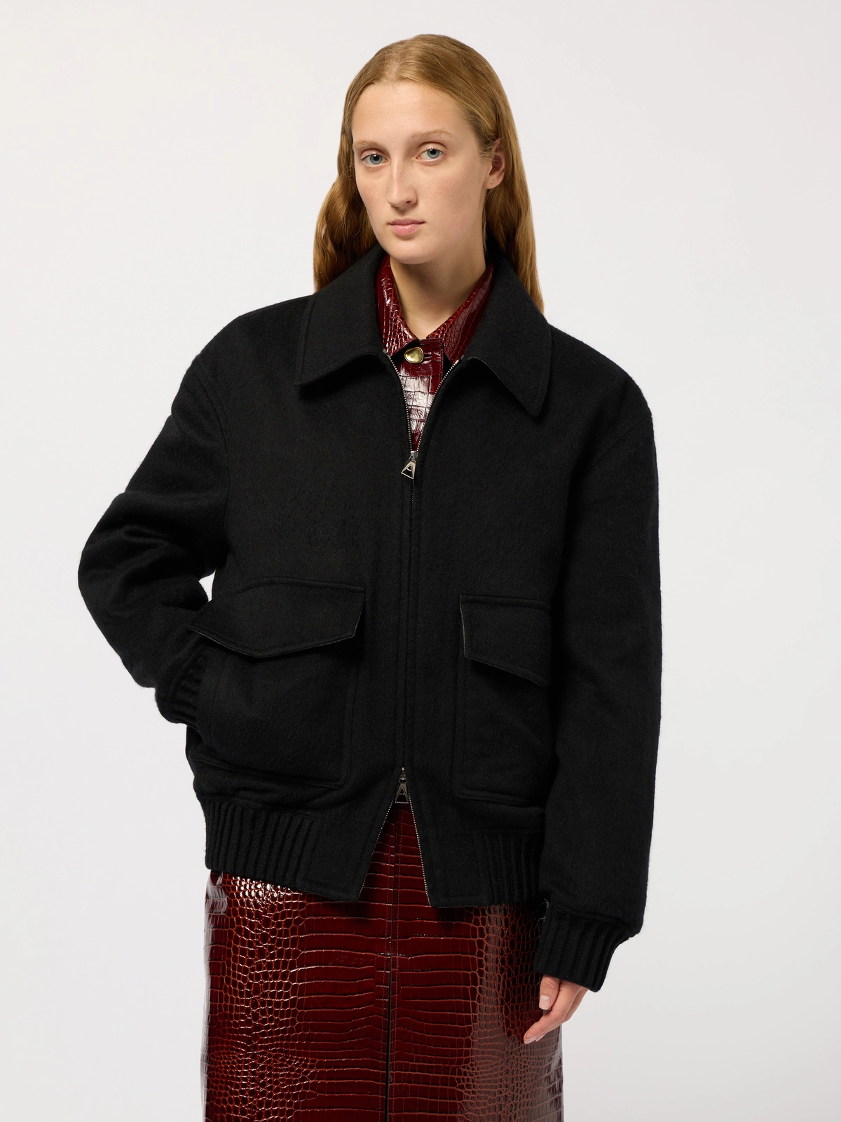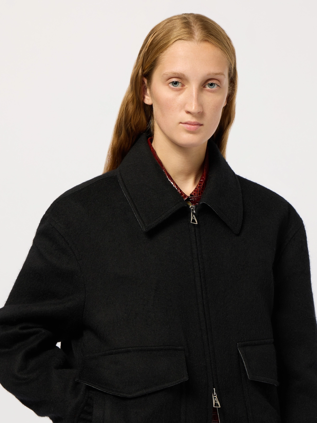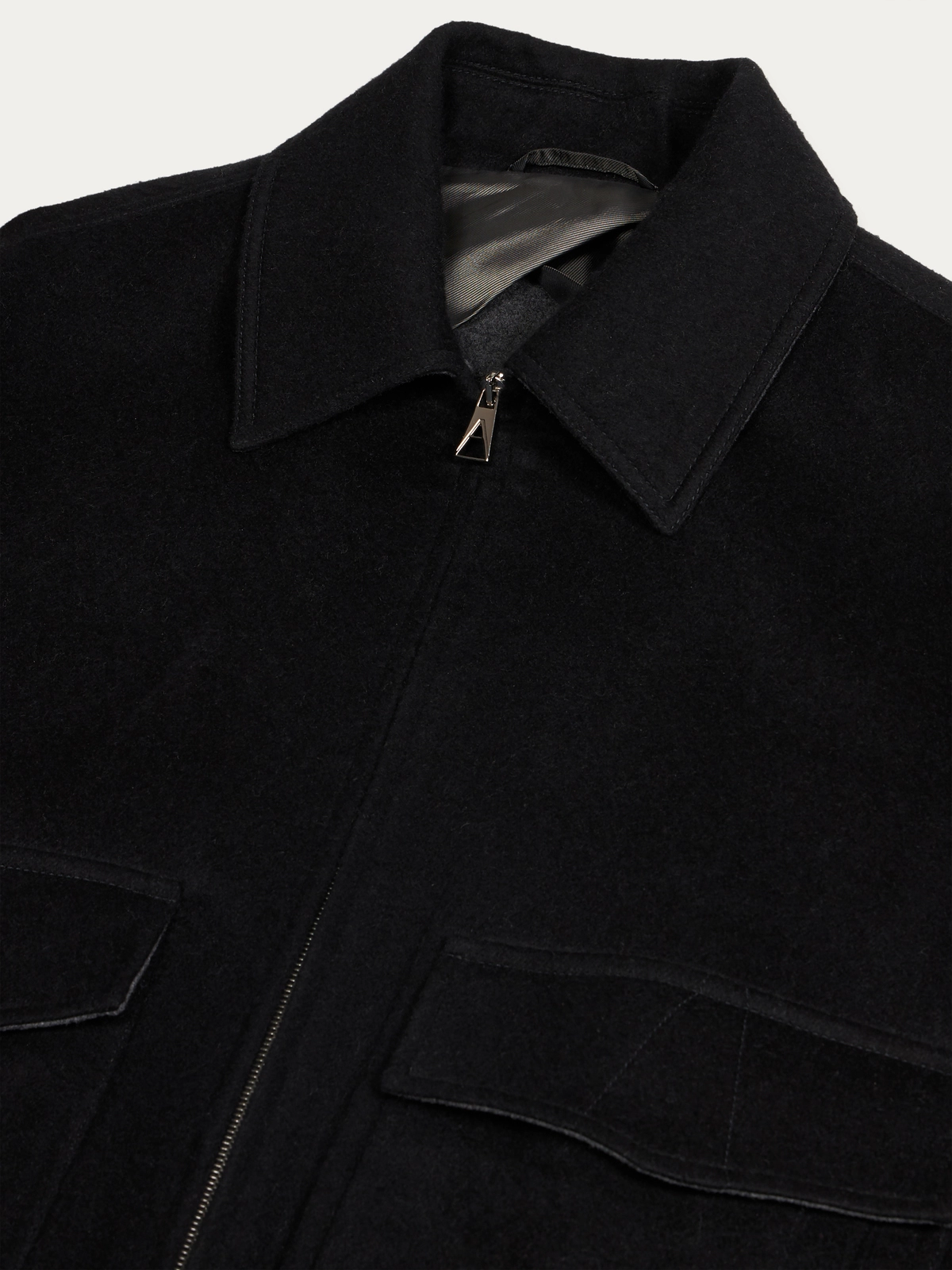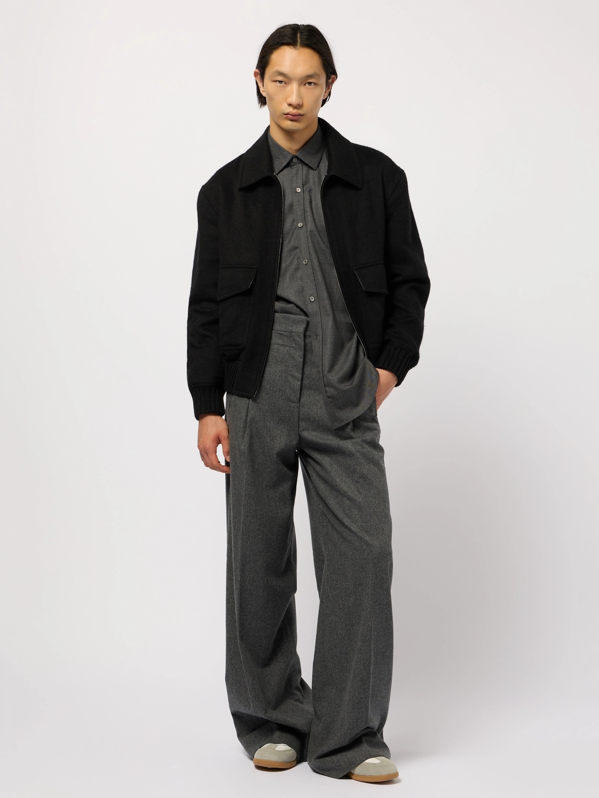 Round-shaped blouson crafted in a double virgin wool-and-silk blend. It fastens with a double zip puller. Fully unlined in double color, black on the outside and grey mélange inside.