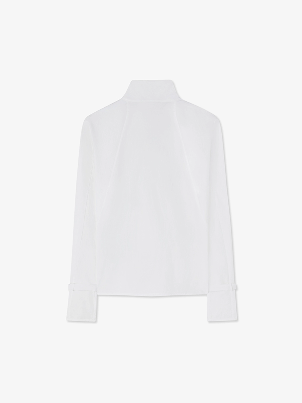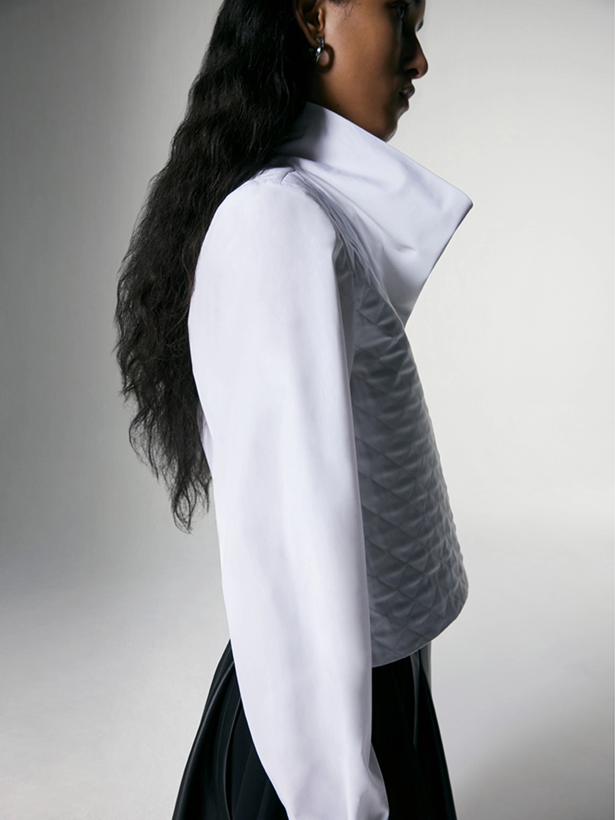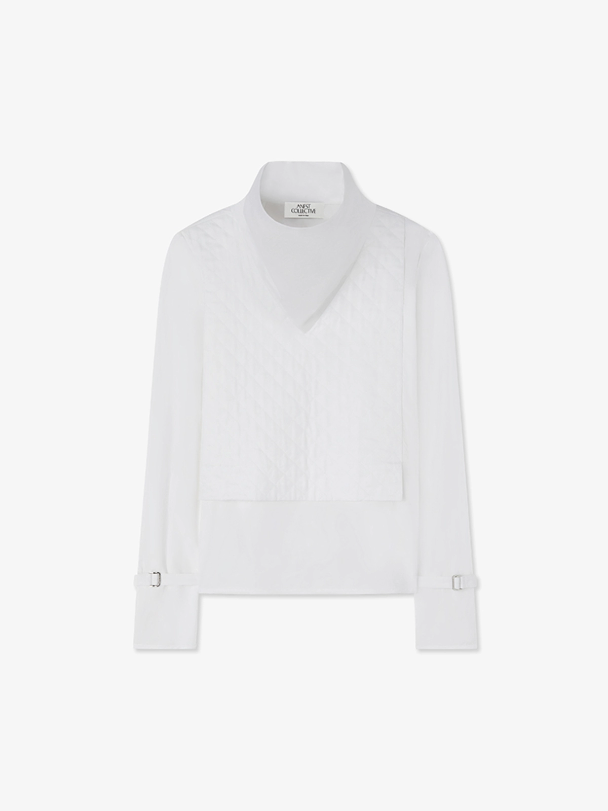 Cotton top with a quilted front panel, cowl neck and cuff straps with metal buckles. It has a shoulder button fastening.