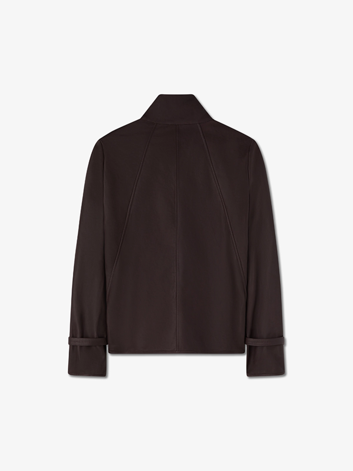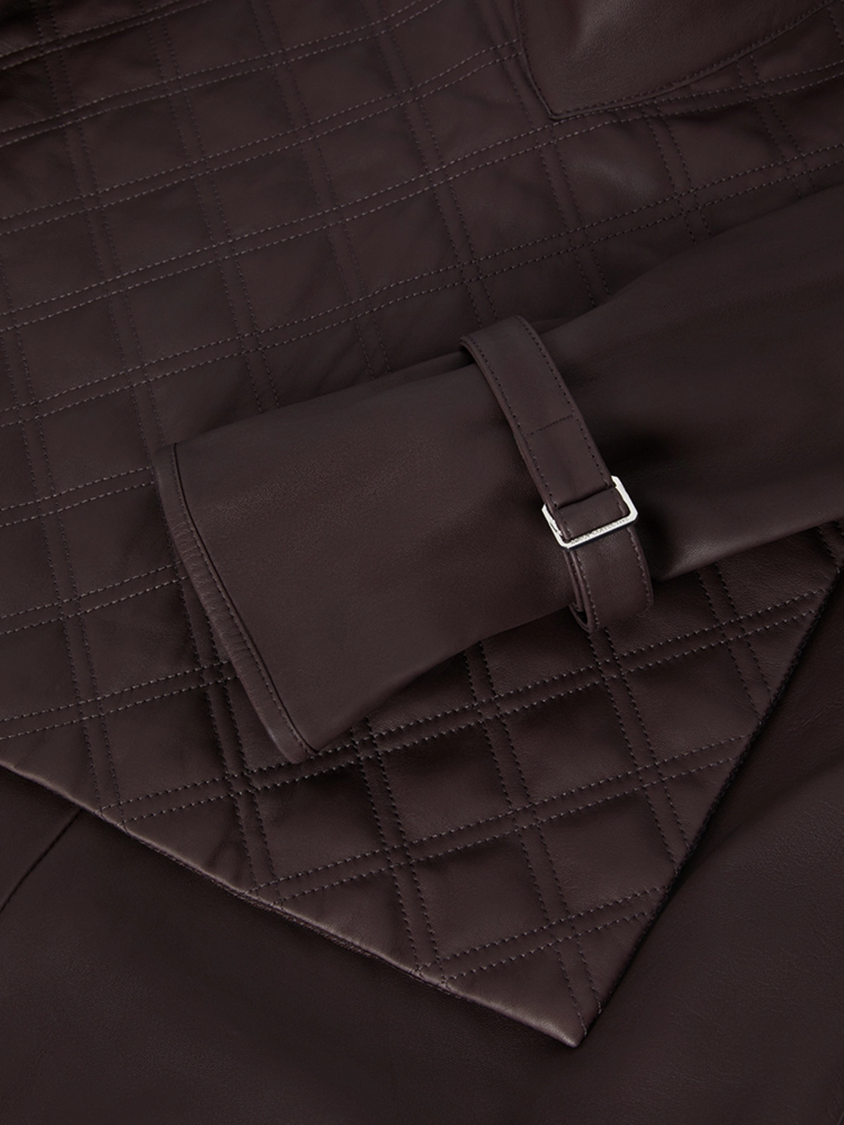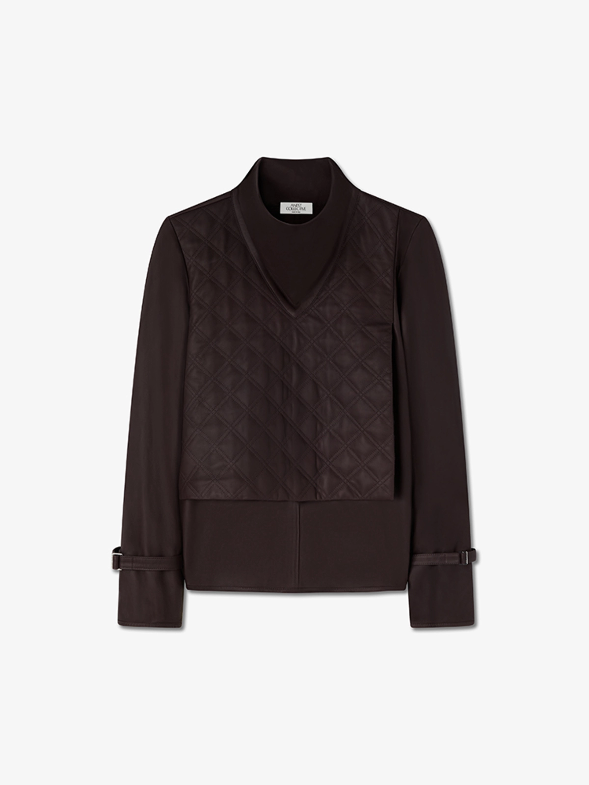 Nappa leather shirt with a quilted front panel, a cowl neck and cuff straps with metal buckles. It has a shoulder button fastening.