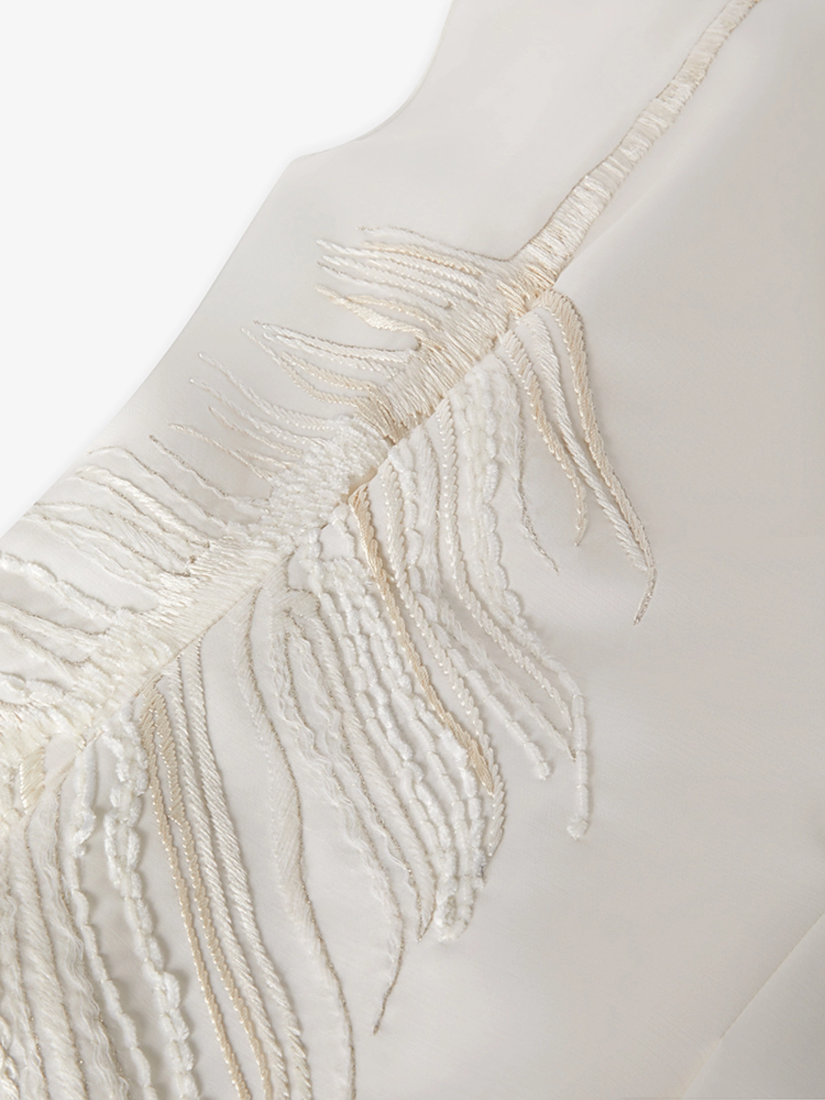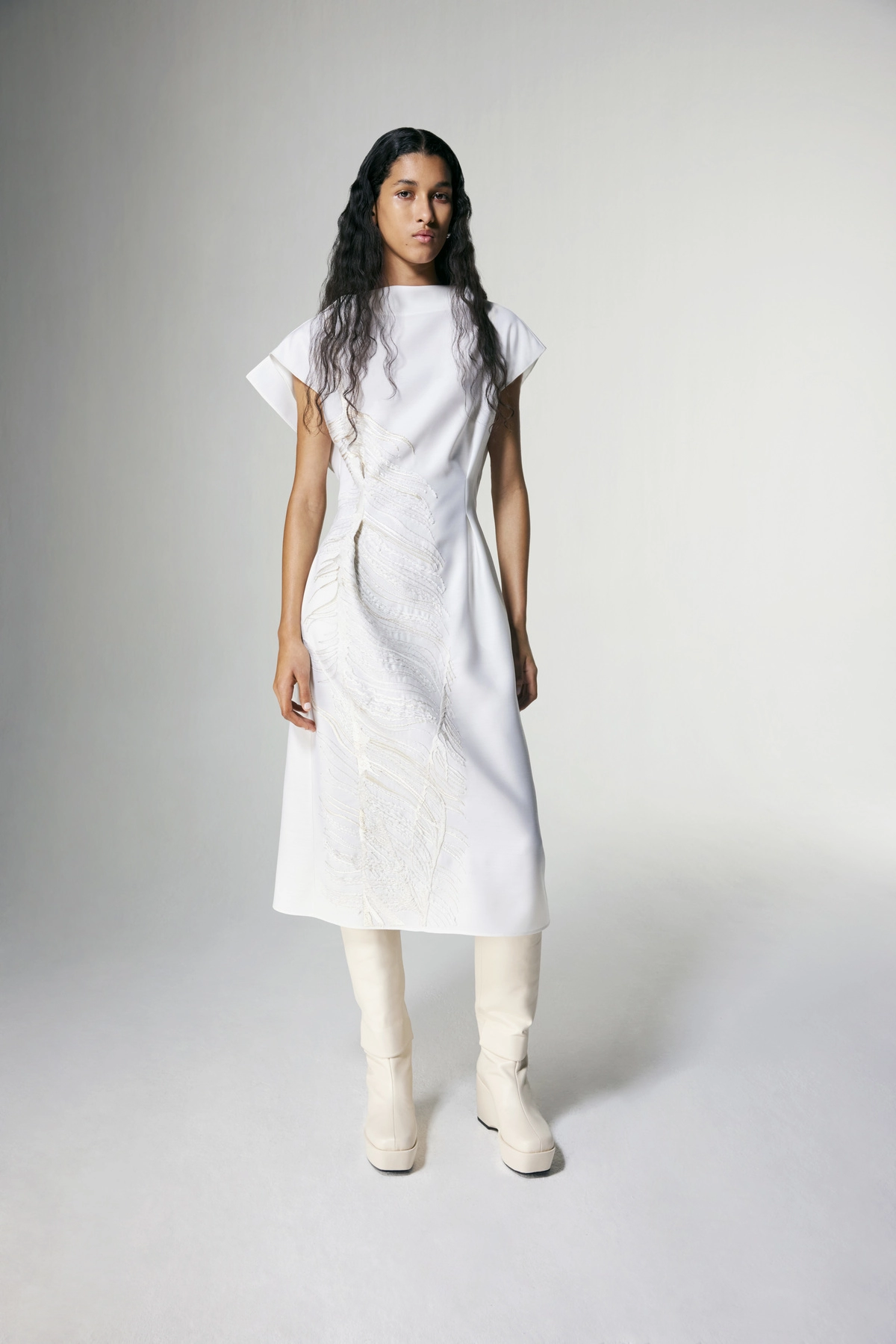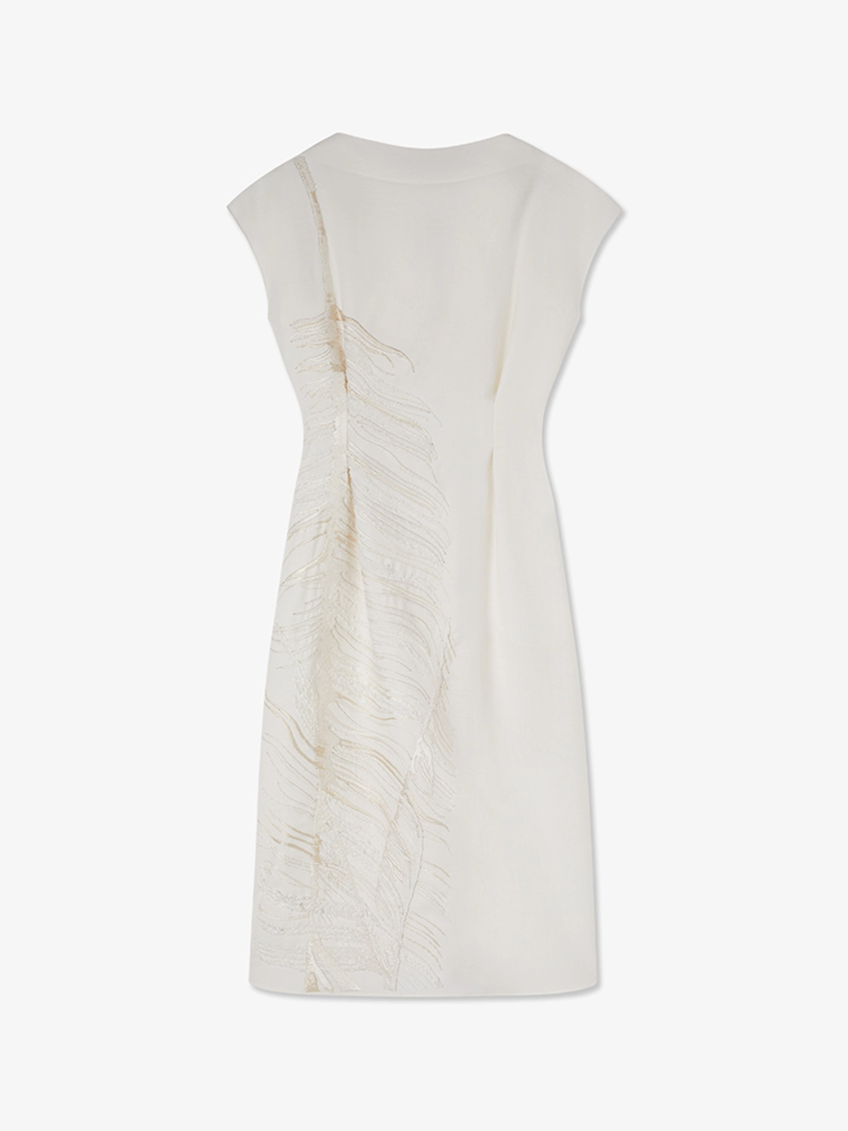 Wool-silk mid-length dress with hand-embroidered feather detailing. It has capped sleeves, a nipped-in waist, and a back zip fastening with our signature ‘A’ puller.