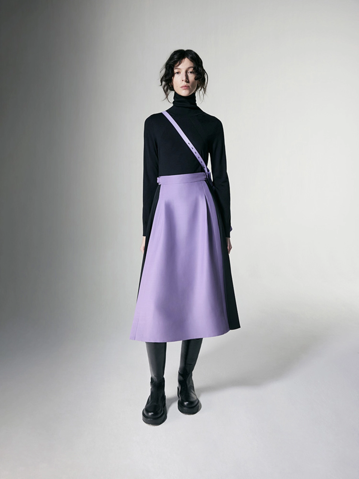 Silk-wool mid-length skirt with pleated side panels and adjustable waist straps with metal buttons and sliders. Ithas a back zip fastening with our signature ‘A’ puller.