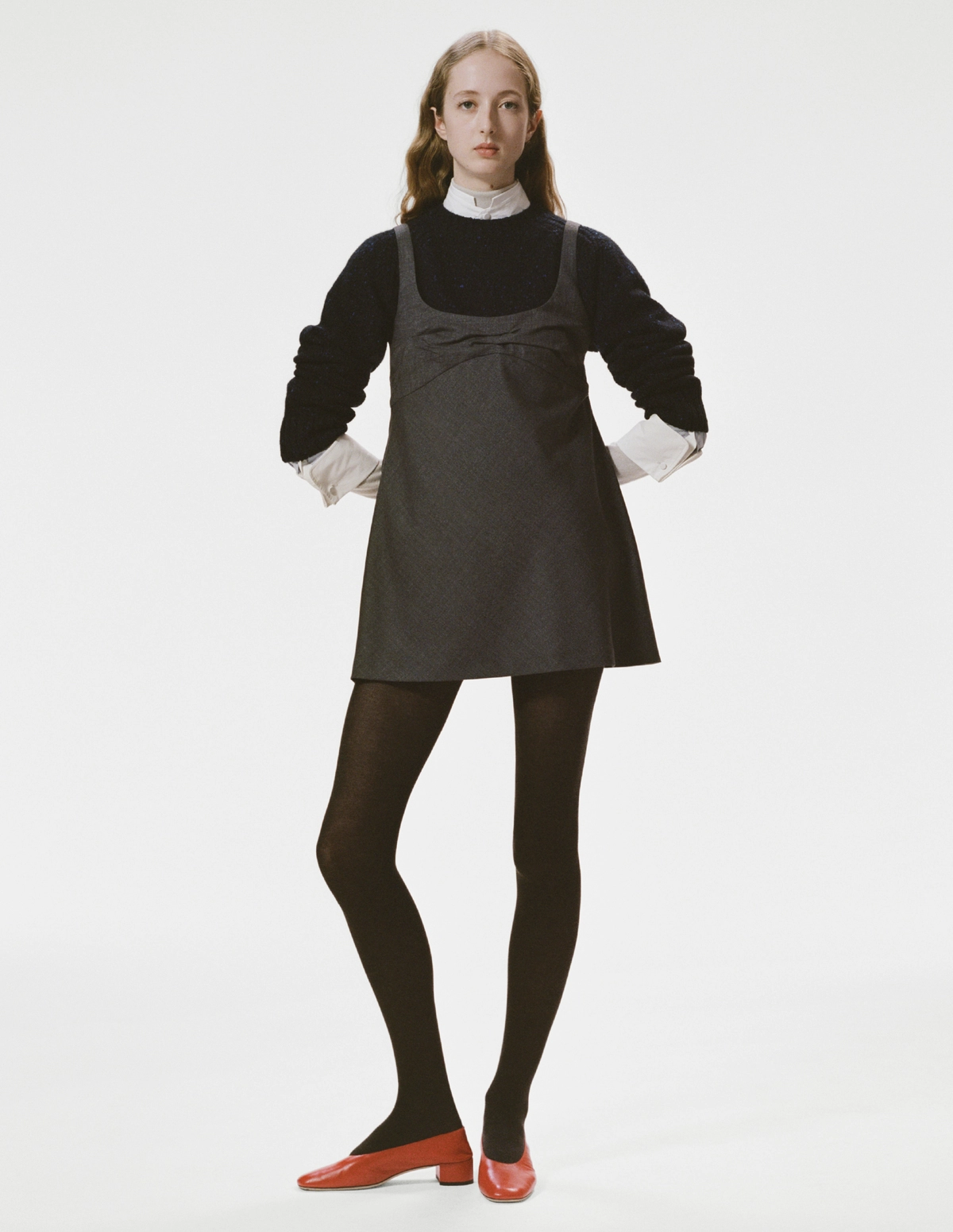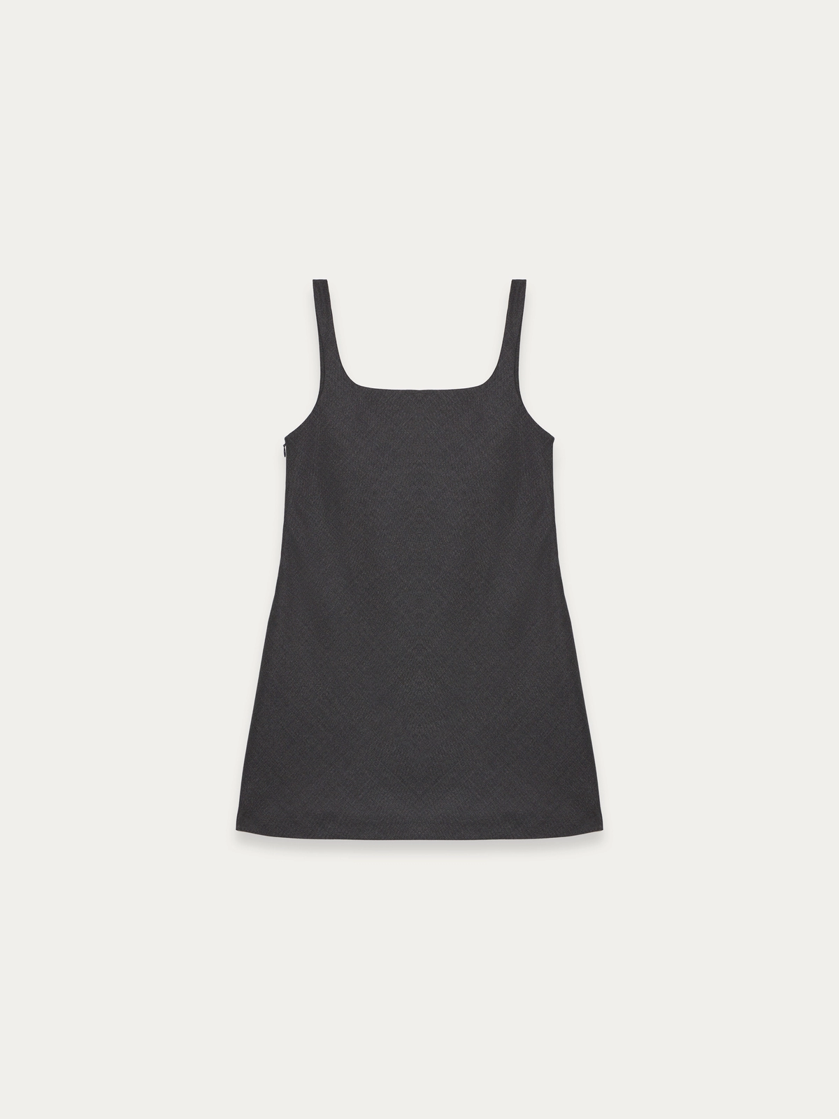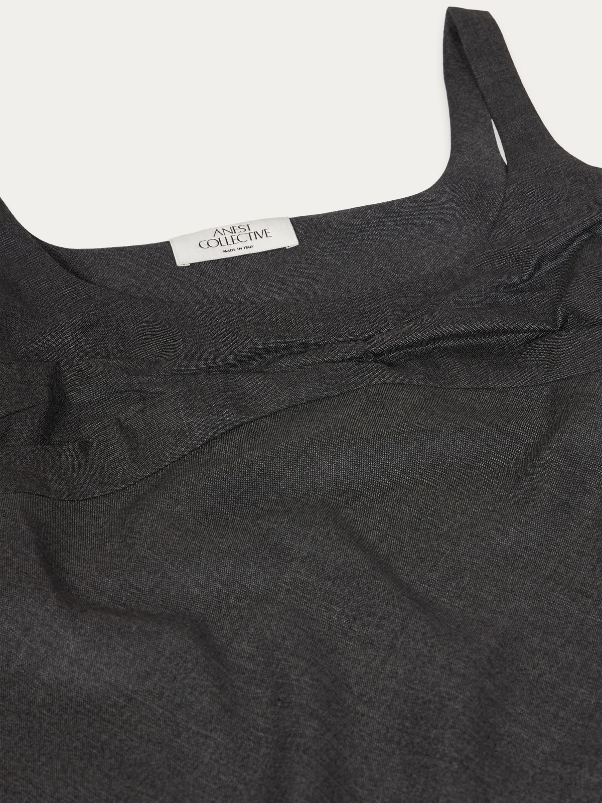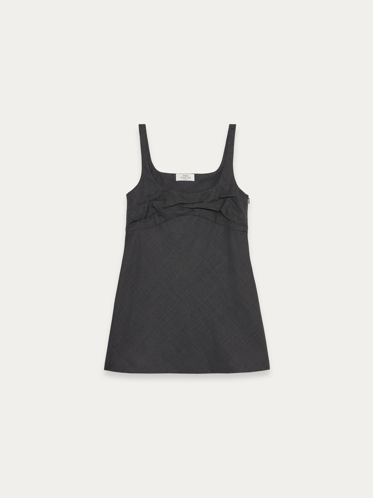 Here this style is fashioned in a lightweight sartorial grisaille wool, with a hand crushed draped bust detail. To help elevate the style so that it can be worn as statement pieces for everyday dressing, as either a top worn over a shirt or simple sweater and paired with a pant or skirt. Or on its own as a mini dress.