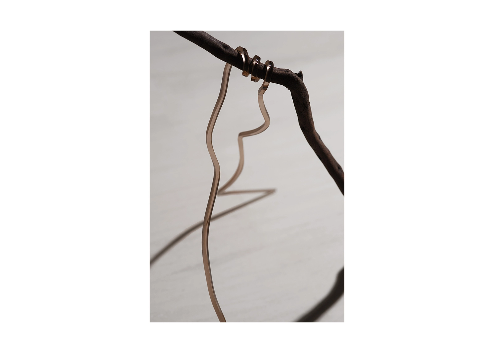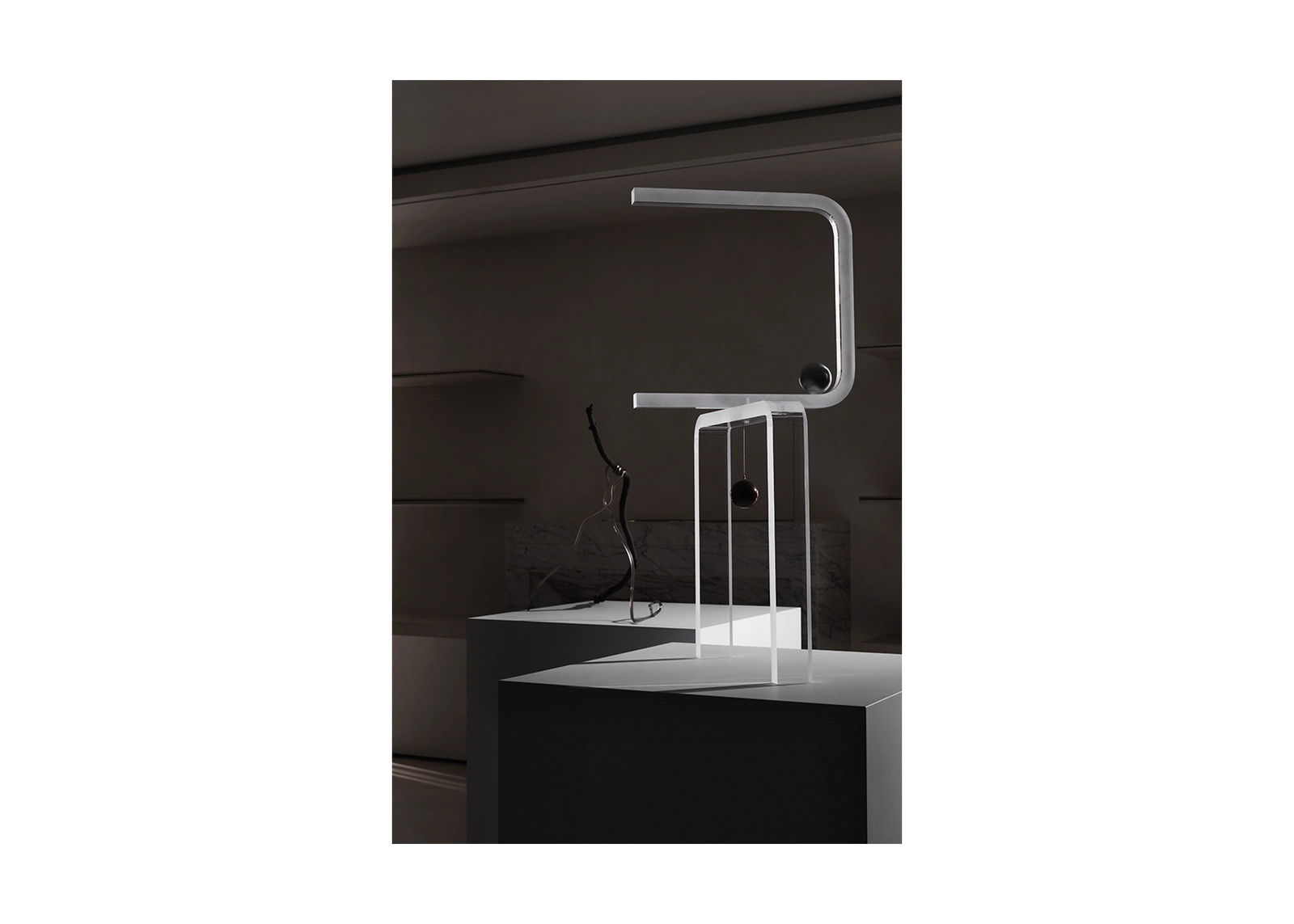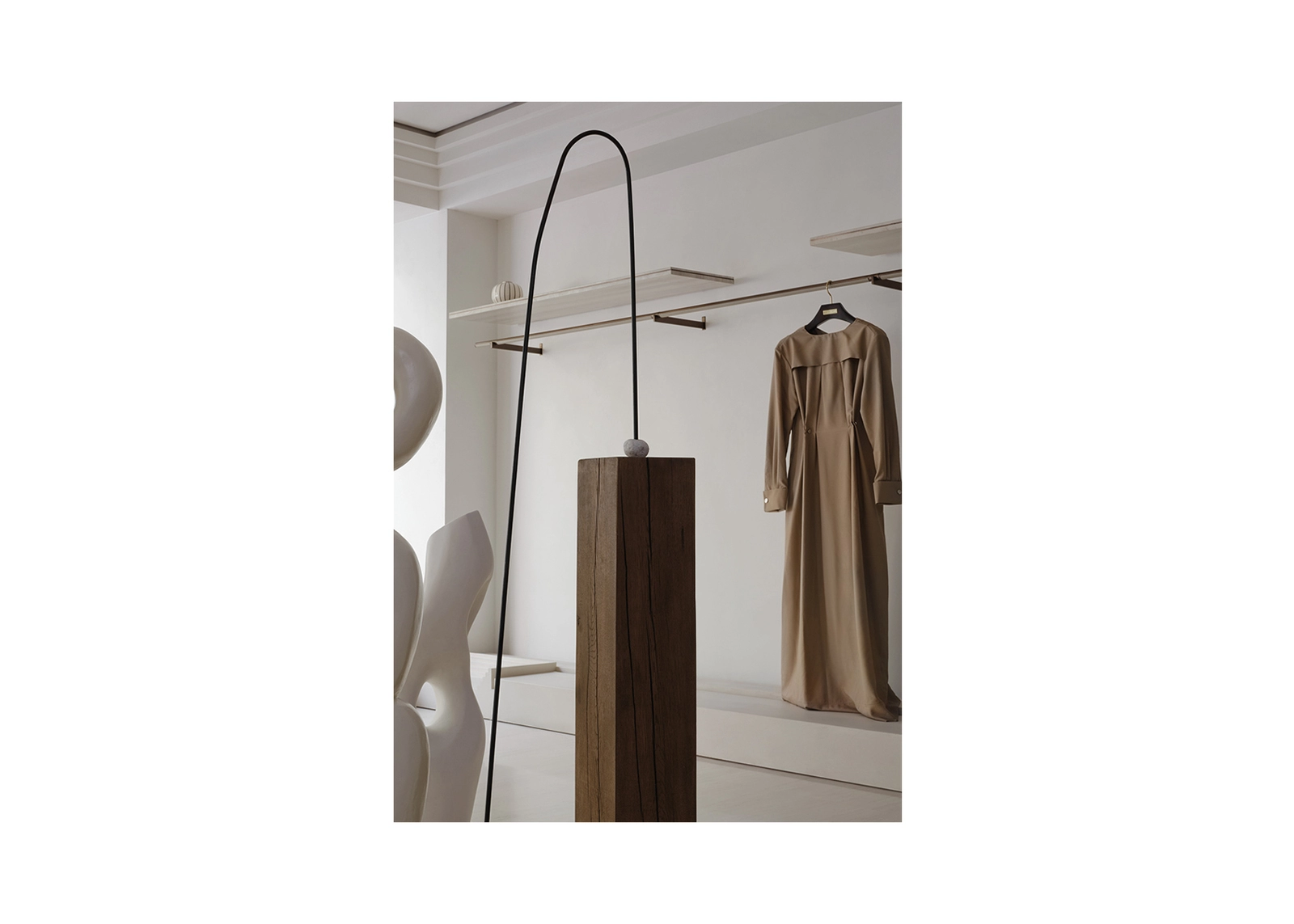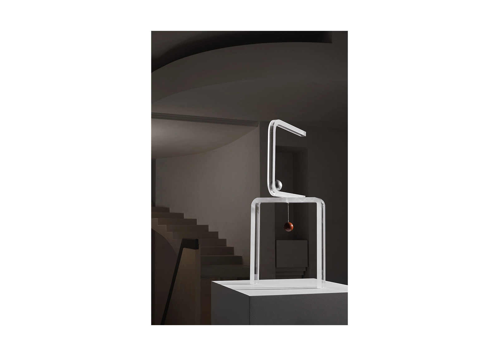 而最开始提及的那根松木枝条,则与另一座装置一起被安置在精品店二楼,轻推吊置小球,如时钟摆锤,精准行走于时间瑰丽的曲面。