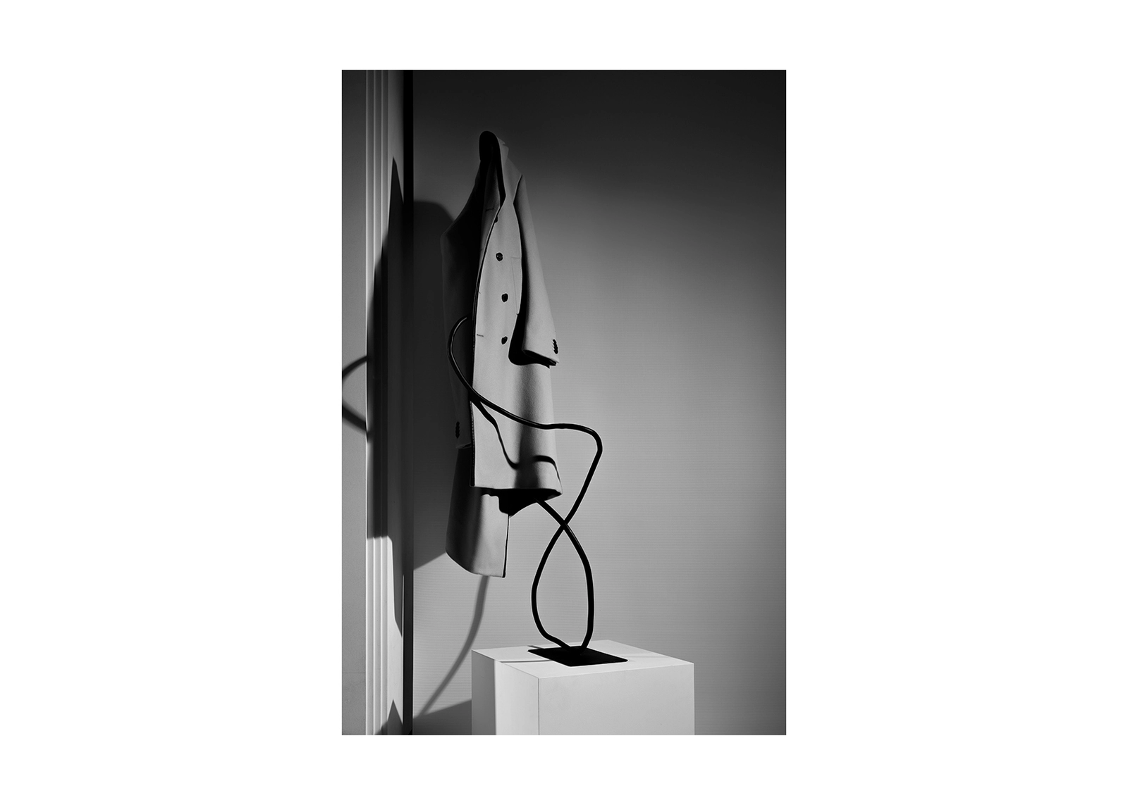 Kei 借鉴了布展的思路,创作了一系列造型独特的作品,两座白色雕塑同时拥有柔和曲线与结构感型态,如同怪石,有的角度小而起峰,有的角度又身形耸秀,任一角度所见不同,移步换景,让参观者不由得绕行观看。而此时,亦穿行于一侧富有体量感的成衣之间,两相平衡,各分秋色。
