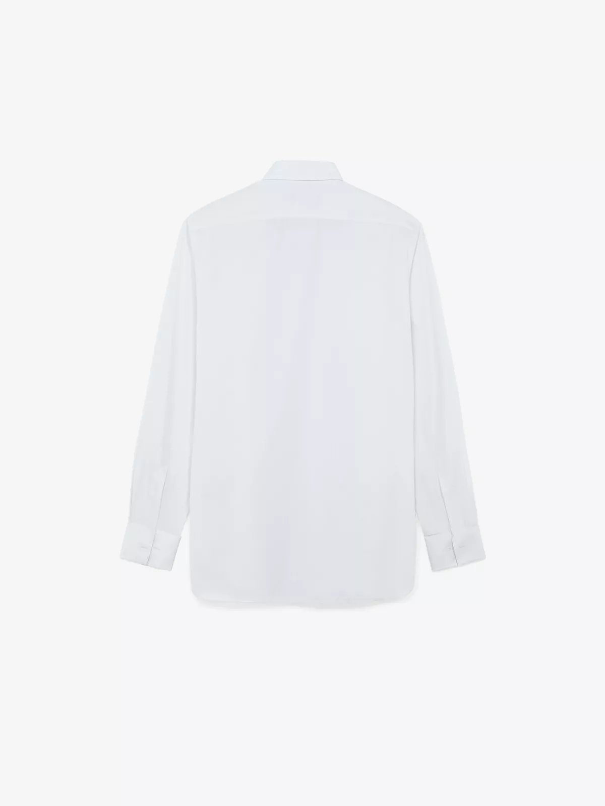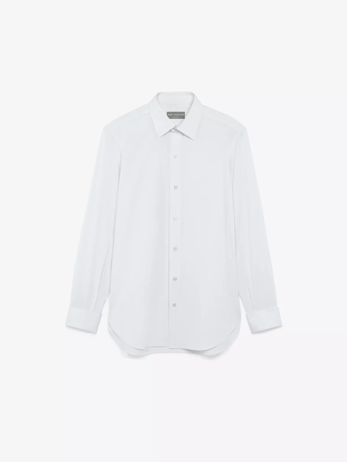 这款珍珠灰正装衬衫由100%纯府绸棉制成,拥有经典的单排扣,法式双叠袖和尖领设计。