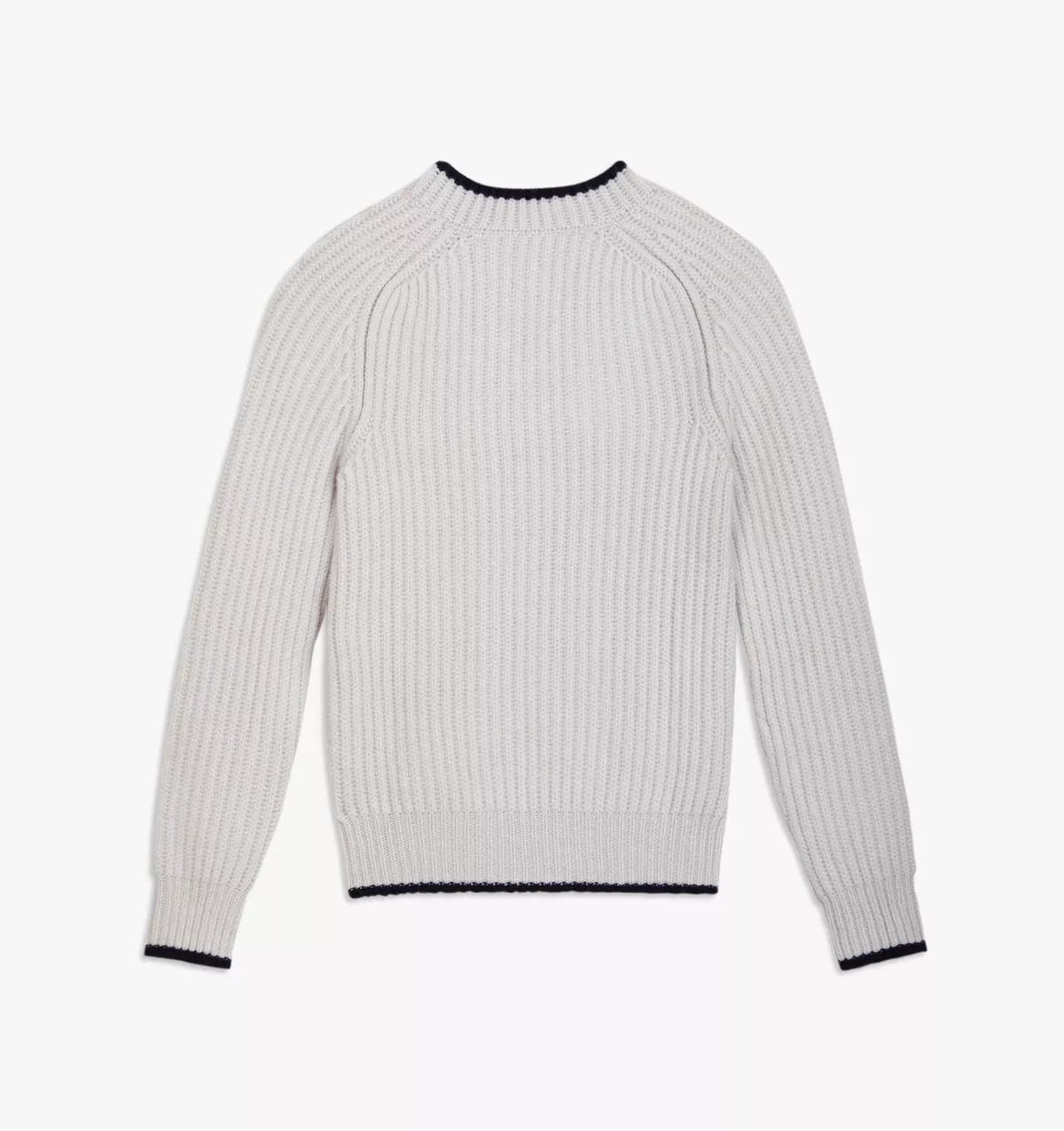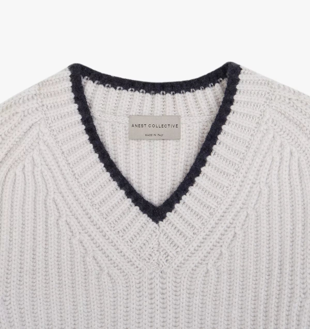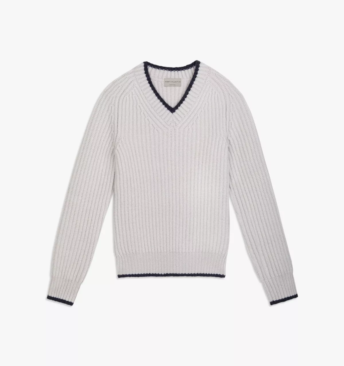 这款浅褐色的V领毛衣是用纯羊绒以独特的渔夫罗纹织法而织成,为您带来极致的温暖和舒适。它的特点是在领口、下摆和袖口配有装饰对比色线条。