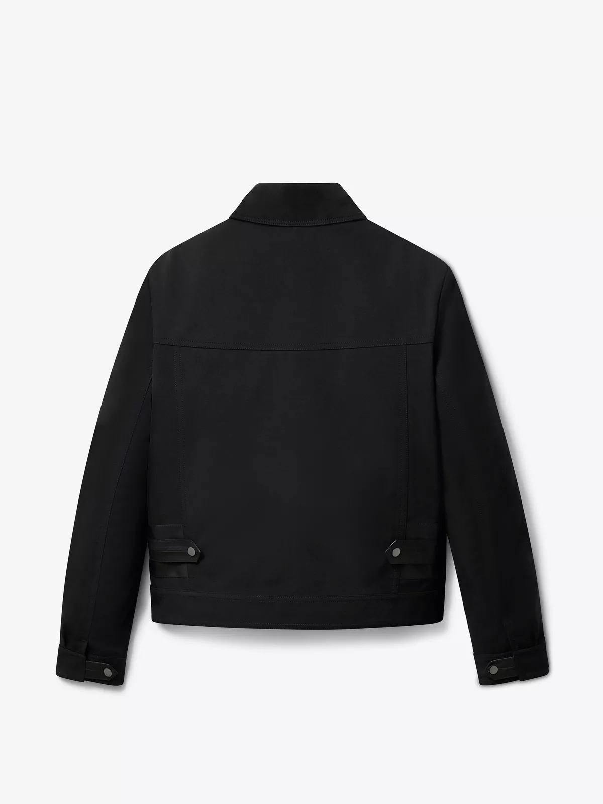 这款以牛仔布为灵感的短上衣由双色羊毛和棉织物制成(外观为黑色,内部为钢蓝色),有一个隐藏式的前襟,皮革边饰和可调节的肩带,并配有一件内部可拆卸的羊毛混纺背心。