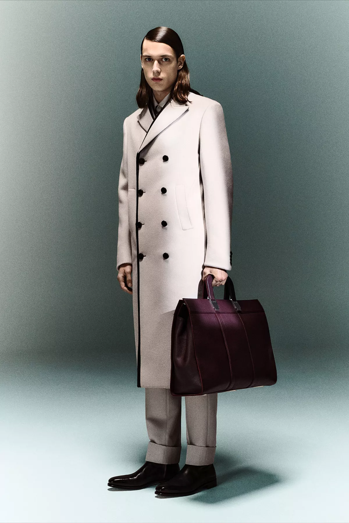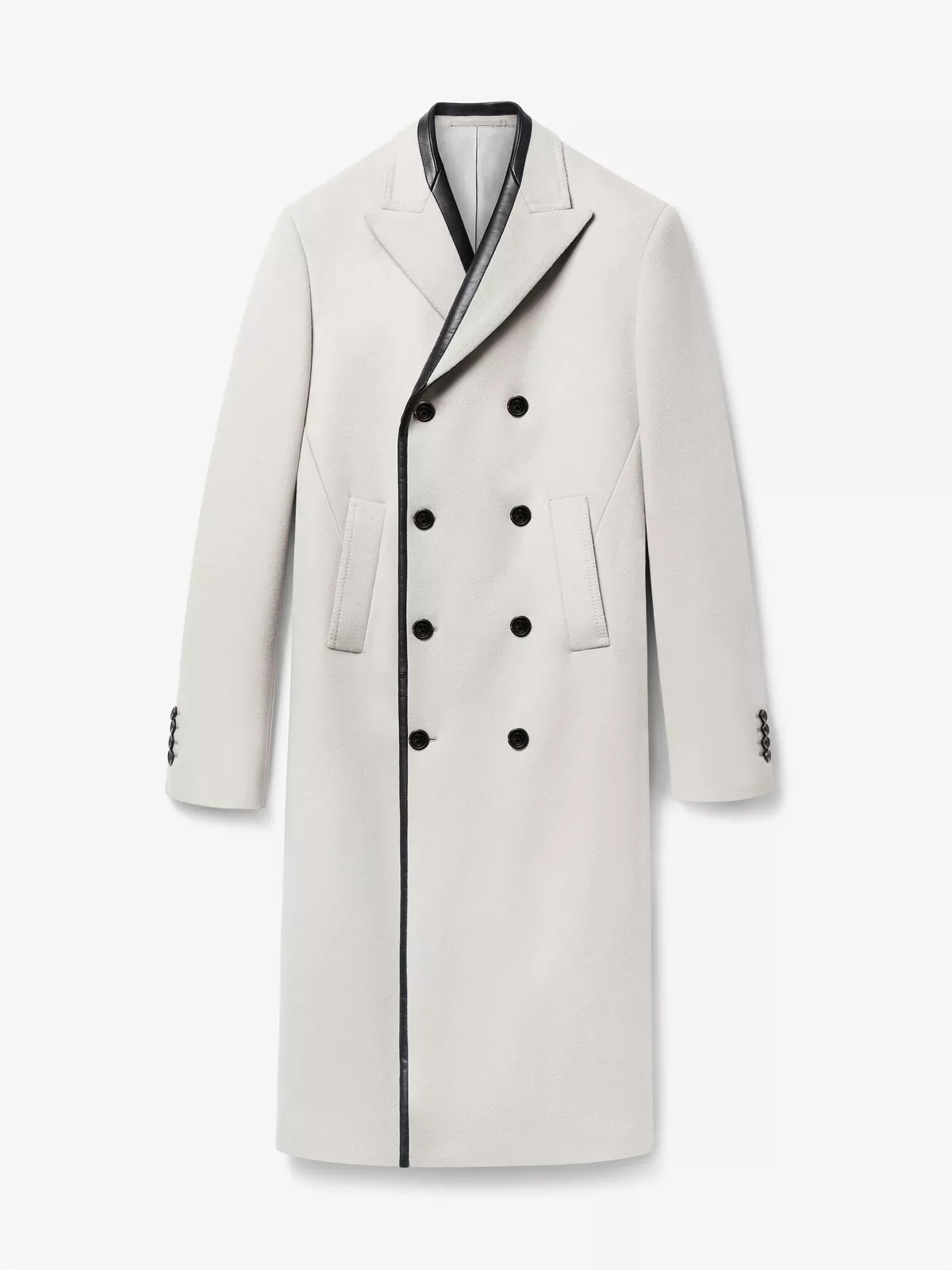 这款独特的大衣外套由初剪羊毛和羊绒混纺而成,裁剪由双排扣带来修身轮廓,皮革装饰细节与同面料皮革包括牛角扣形成鲜明对比。