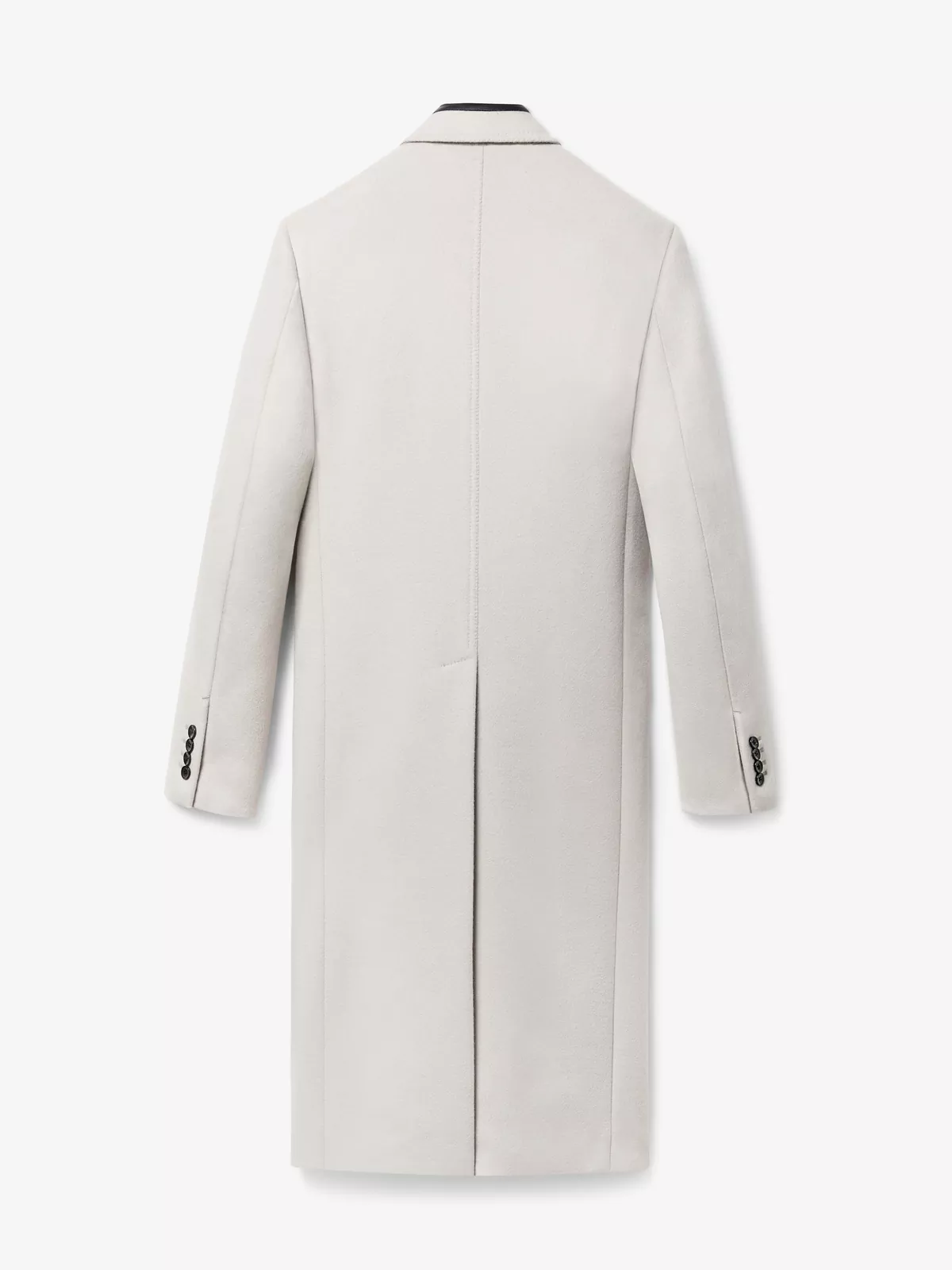 -90% 初剪羊毛, 10% 羊绒 -皮饰细节: 100% 小牛皮 -乳灰色配以黑色皮饰 -ANEST Logo 客制化牛角扣 -双排扣 -侧边口袋 -中等长度 -100% 铜氨纤维全衬里 -意大利制造