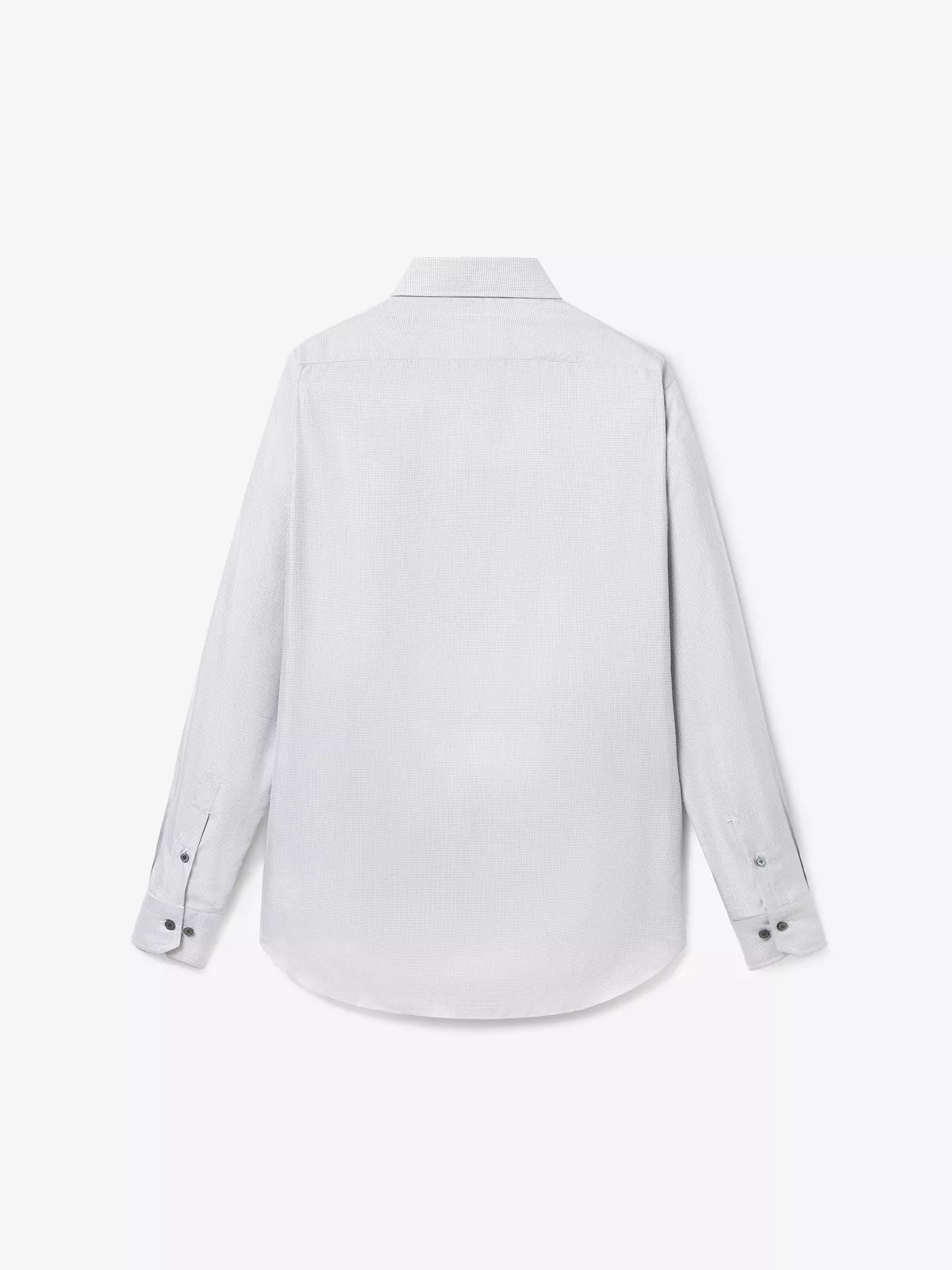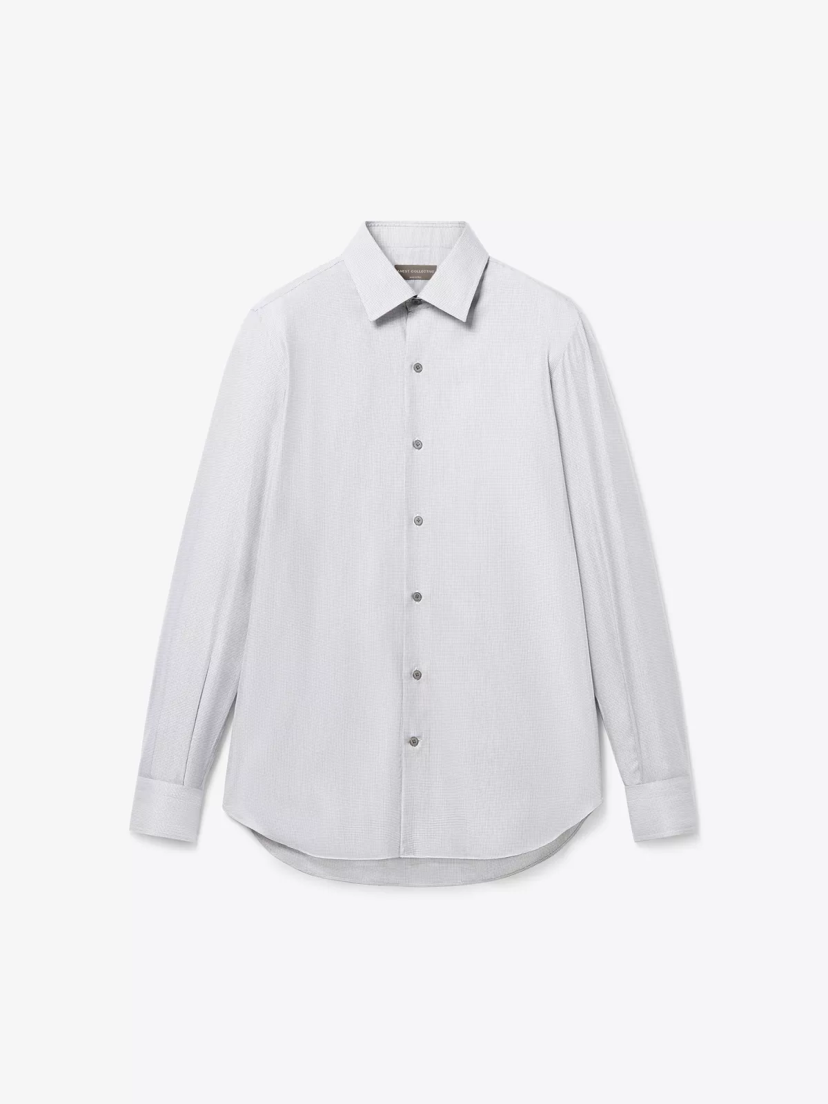这款时髦风格的衬衫是在意大利由顶级的斜纹府绸棉制成的,拥有法式尖领,配以银色领针。