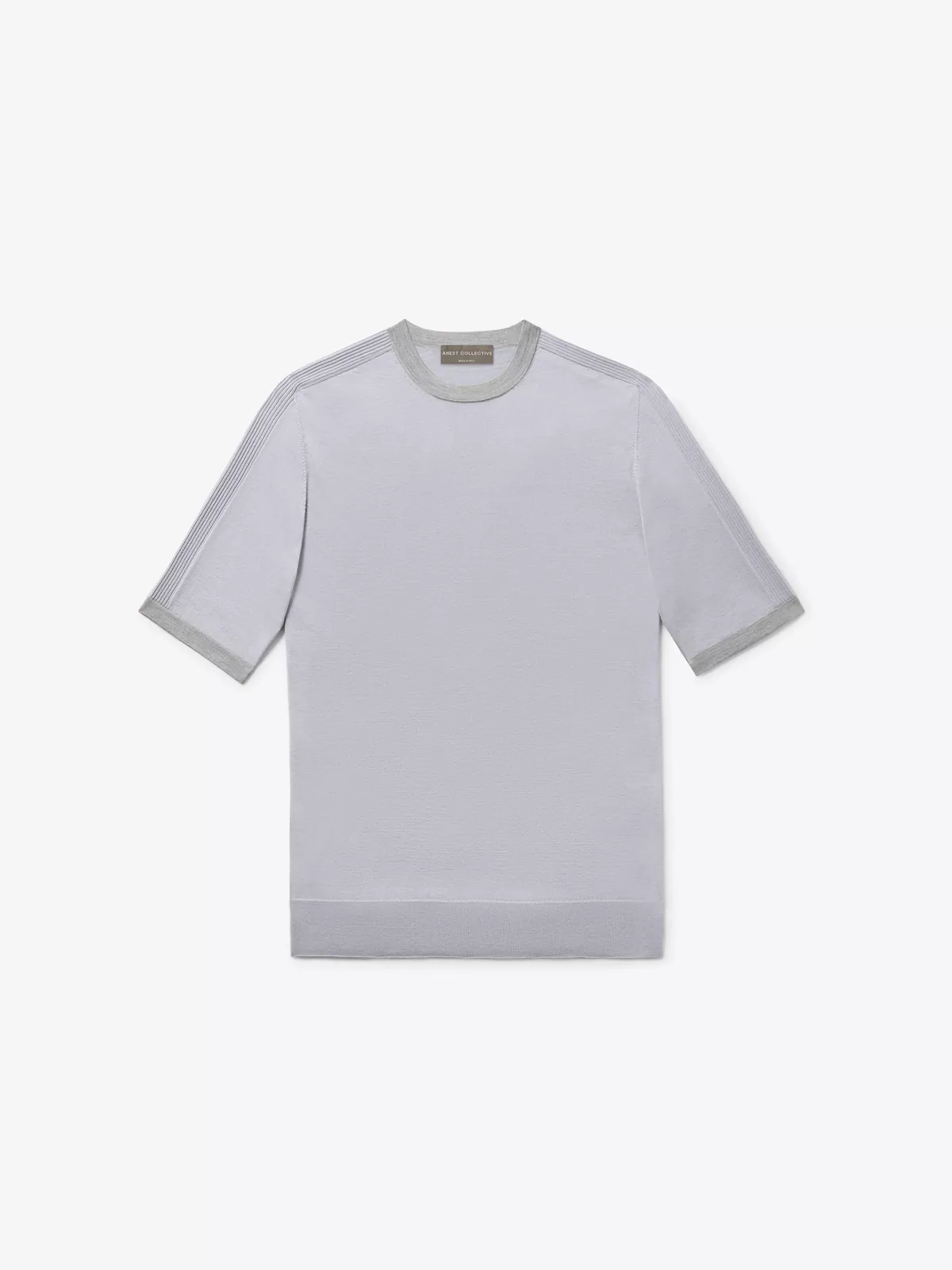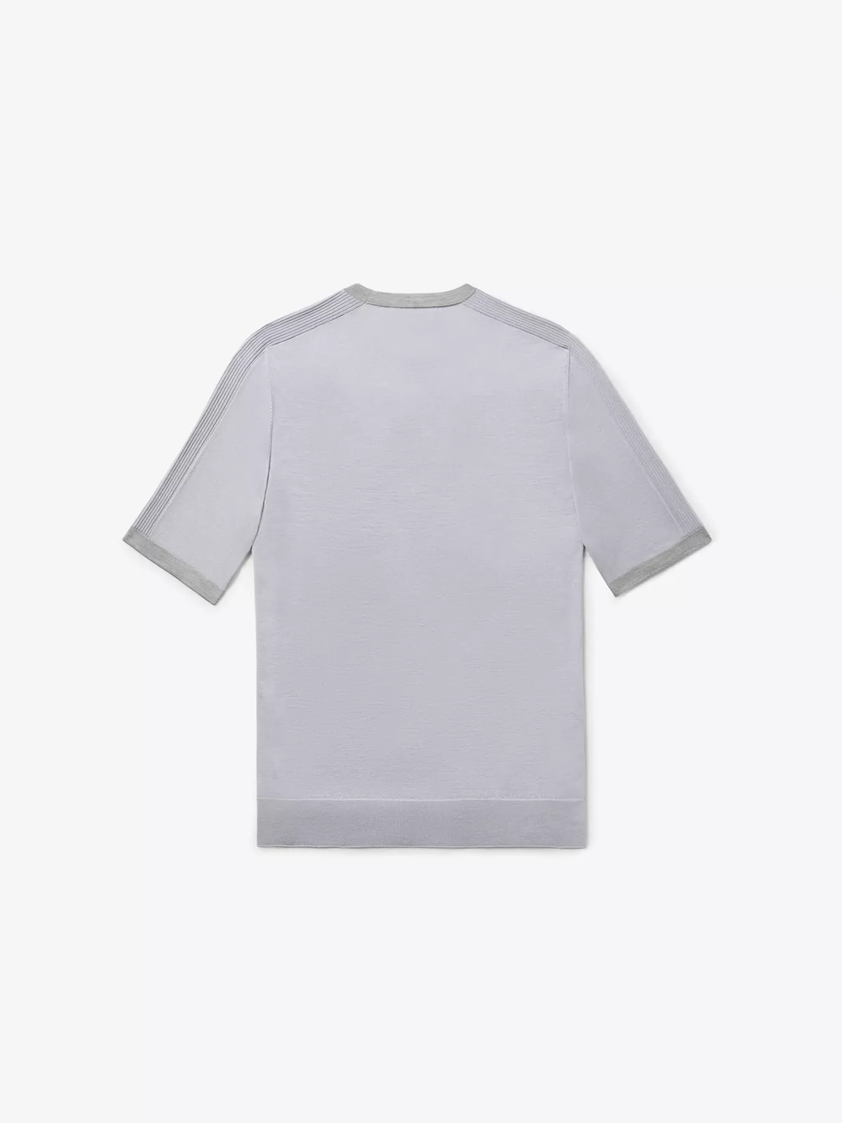 这款圆领短袖针织衫由珍贵的桑蚕丝混纺面料制成,直筒合身,肩膀和袖子处有罗纹设计。