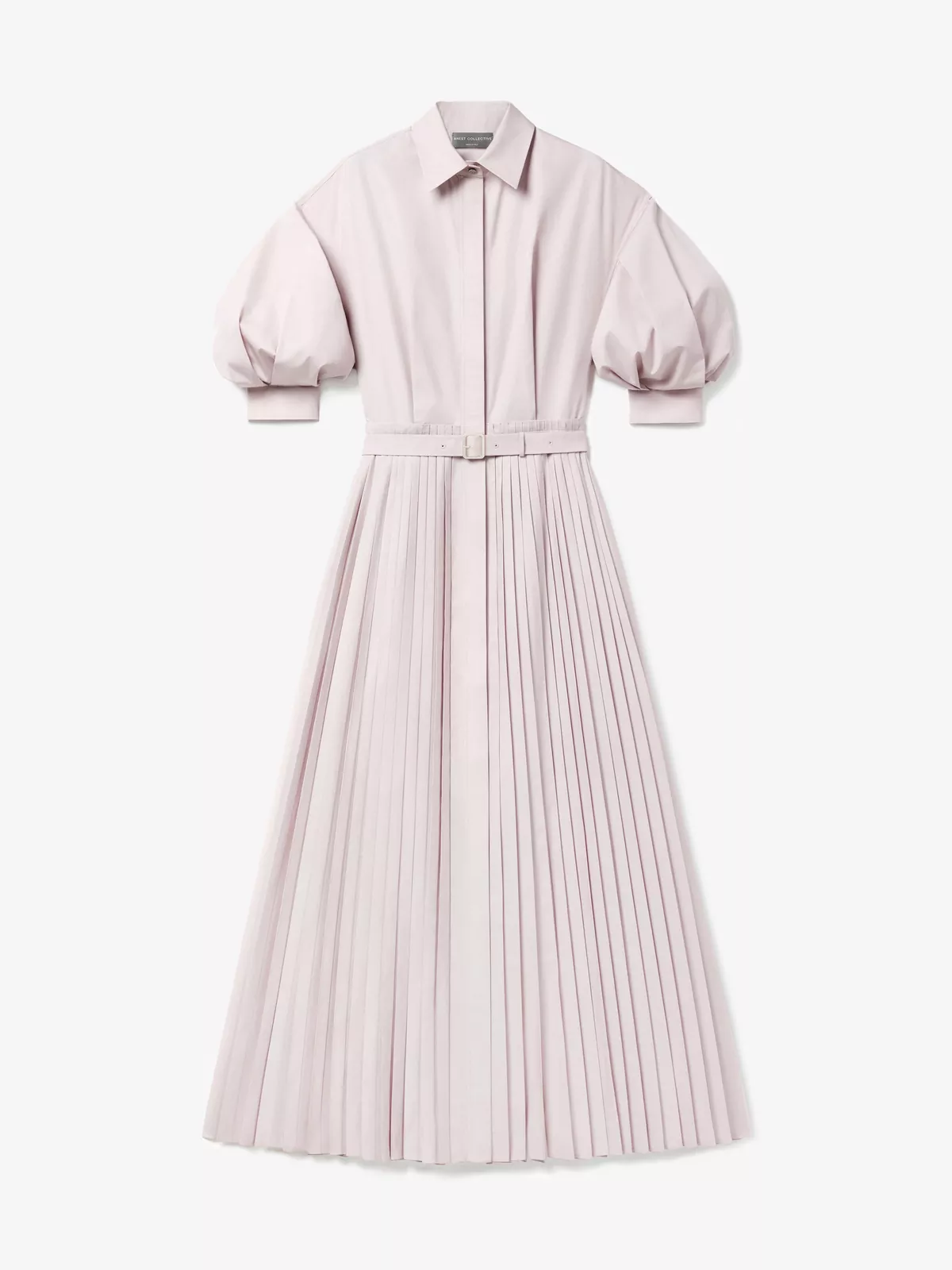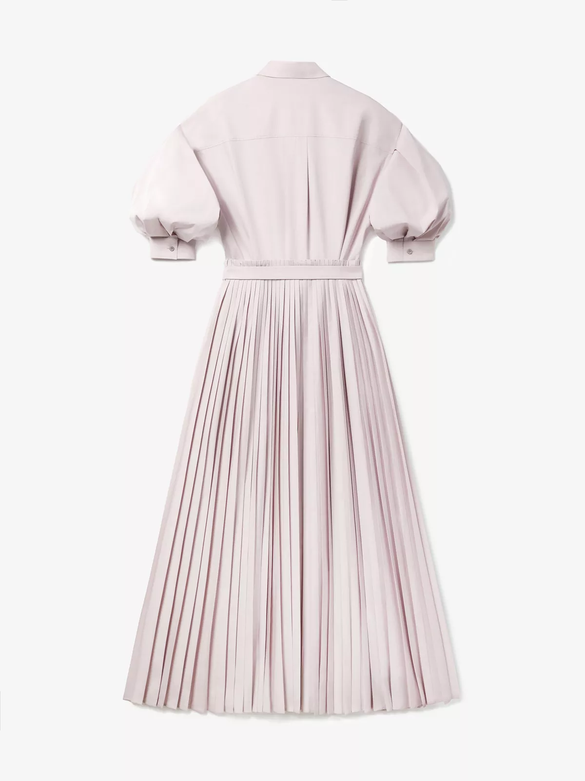 这款百褶裙的特色是富有细节的褶裥设计,和及肘袖长的泡泡袖。它是由精致的府绸棉在意大利制成的,颜色是特殊的灰粉色,搭配的腰带饰有 ANEST Logo客制化金属带扣