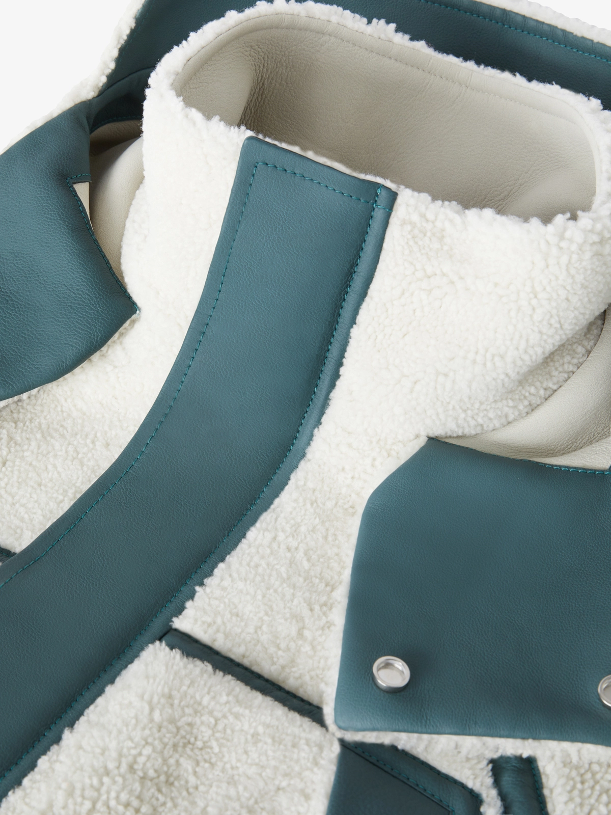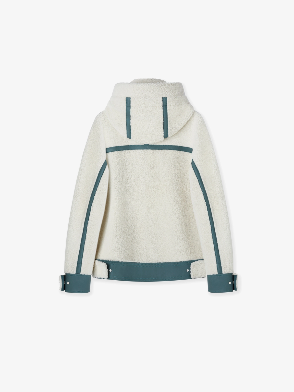 100%皮毛一体,100%纹理小牛皮细节 冬雪白鼠尾草拼色 袖口扣带 搭扣式前襟 ANEST Logo客制化浅金色金属拉链 意大利制造