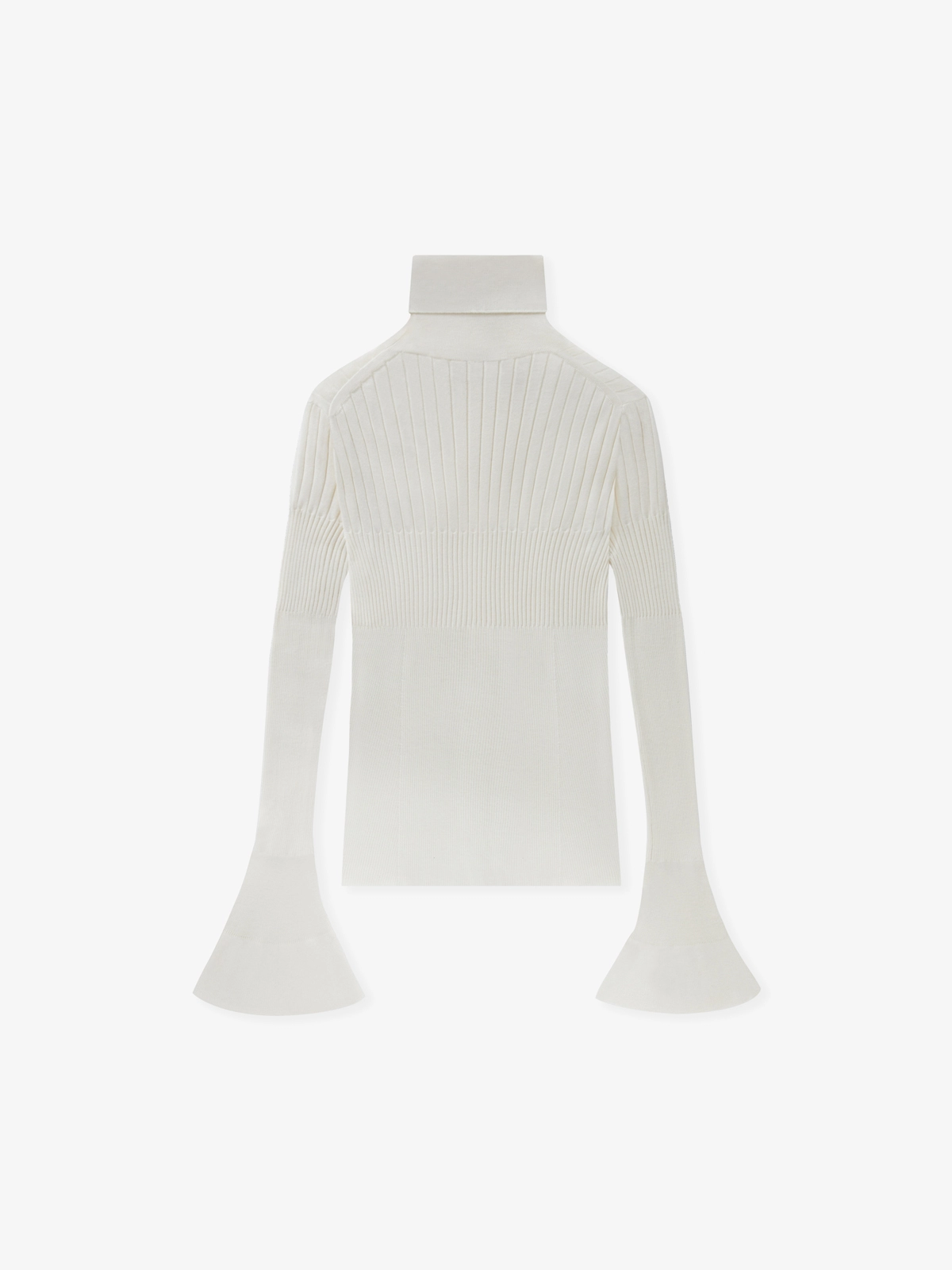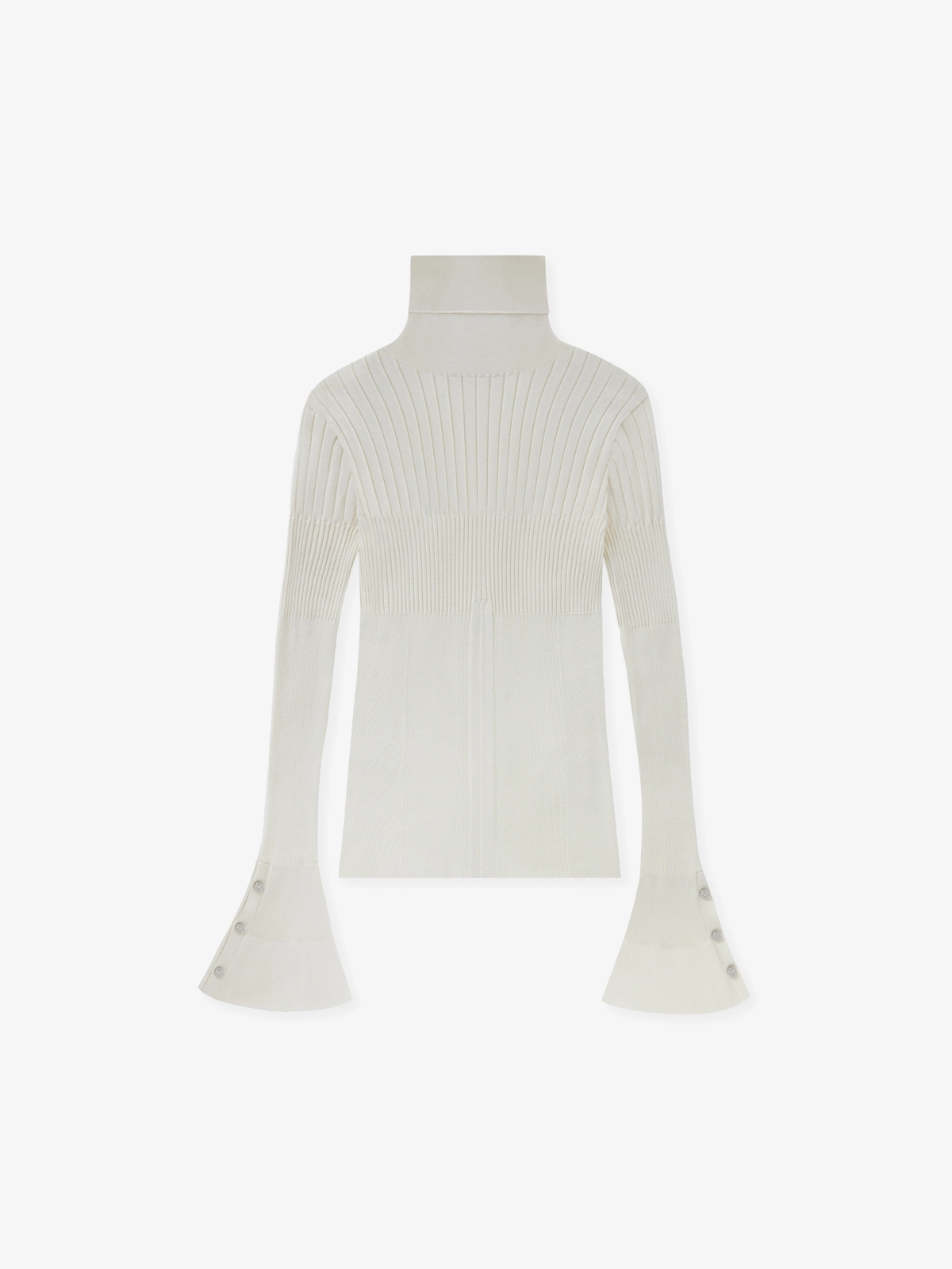 这款罗纹针织高翻领上衣采用高级羊绒和桑蚕丝混纺面料,配以桑蚕丝细节,袖口宽松,金属纽扣细节别致。