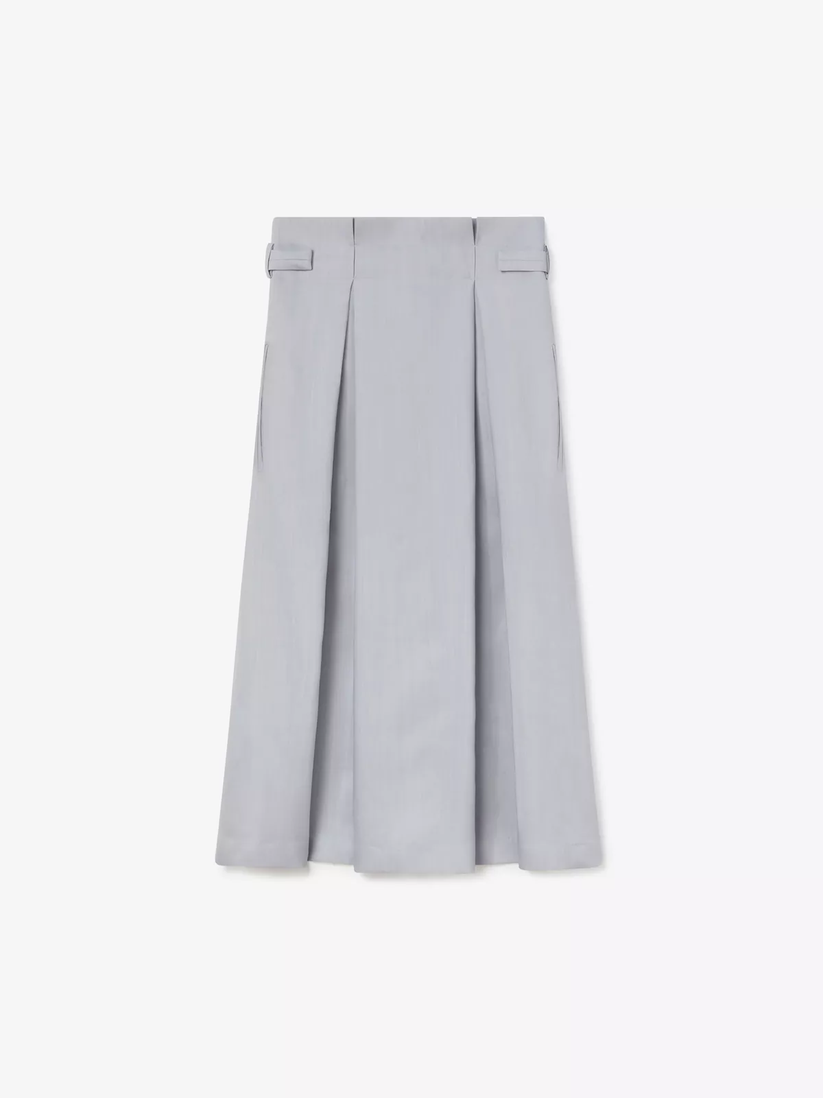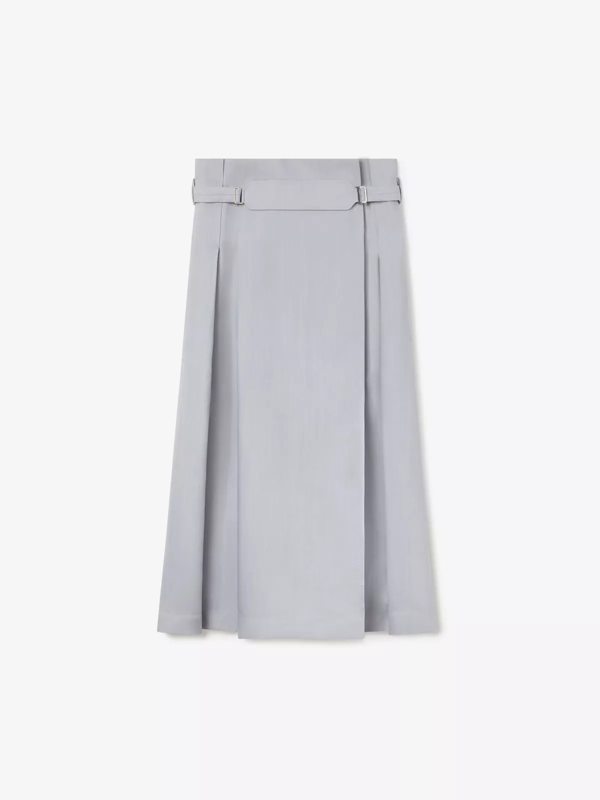 这款优雅的高腰围裹式半身裙采用羊毛和桑蚕丝混纺面料制成,剪裁为 A 字廓形,正面饰有柔软褶裥、可调节腰带和同色系马鞍缝线细节。
