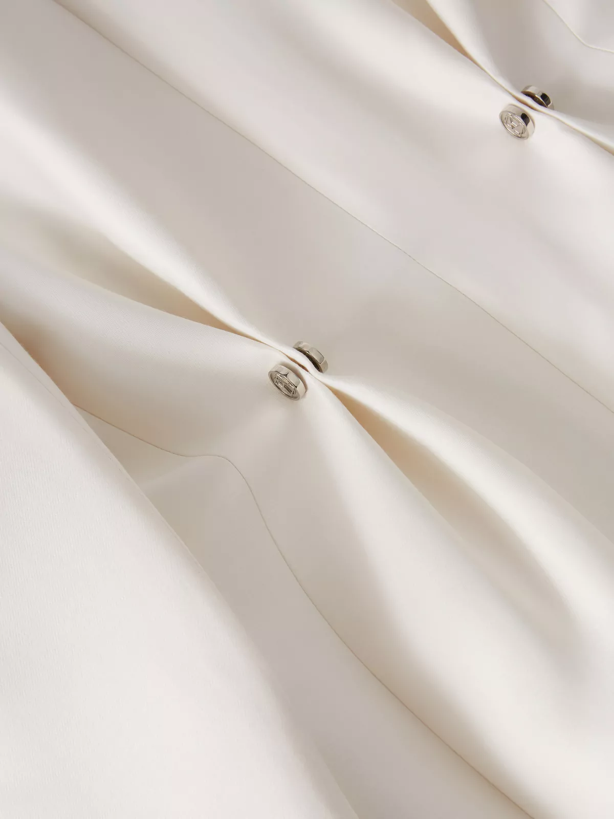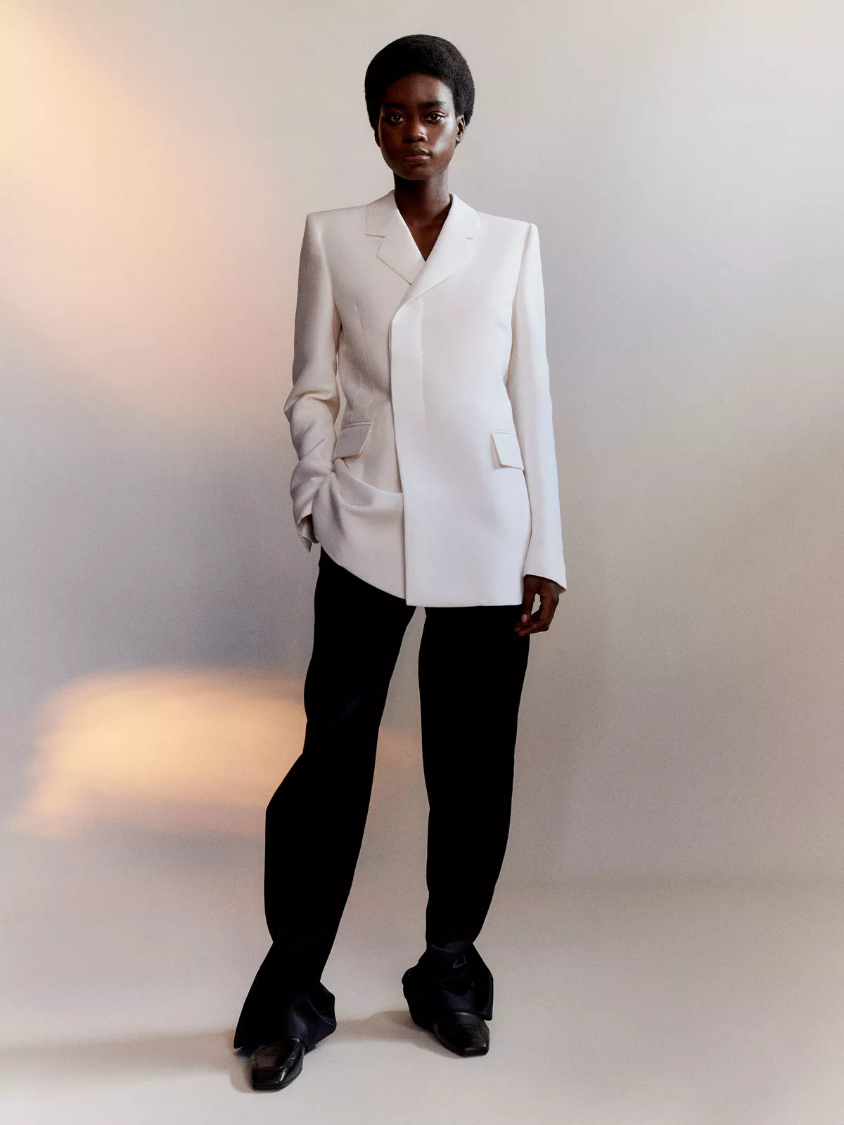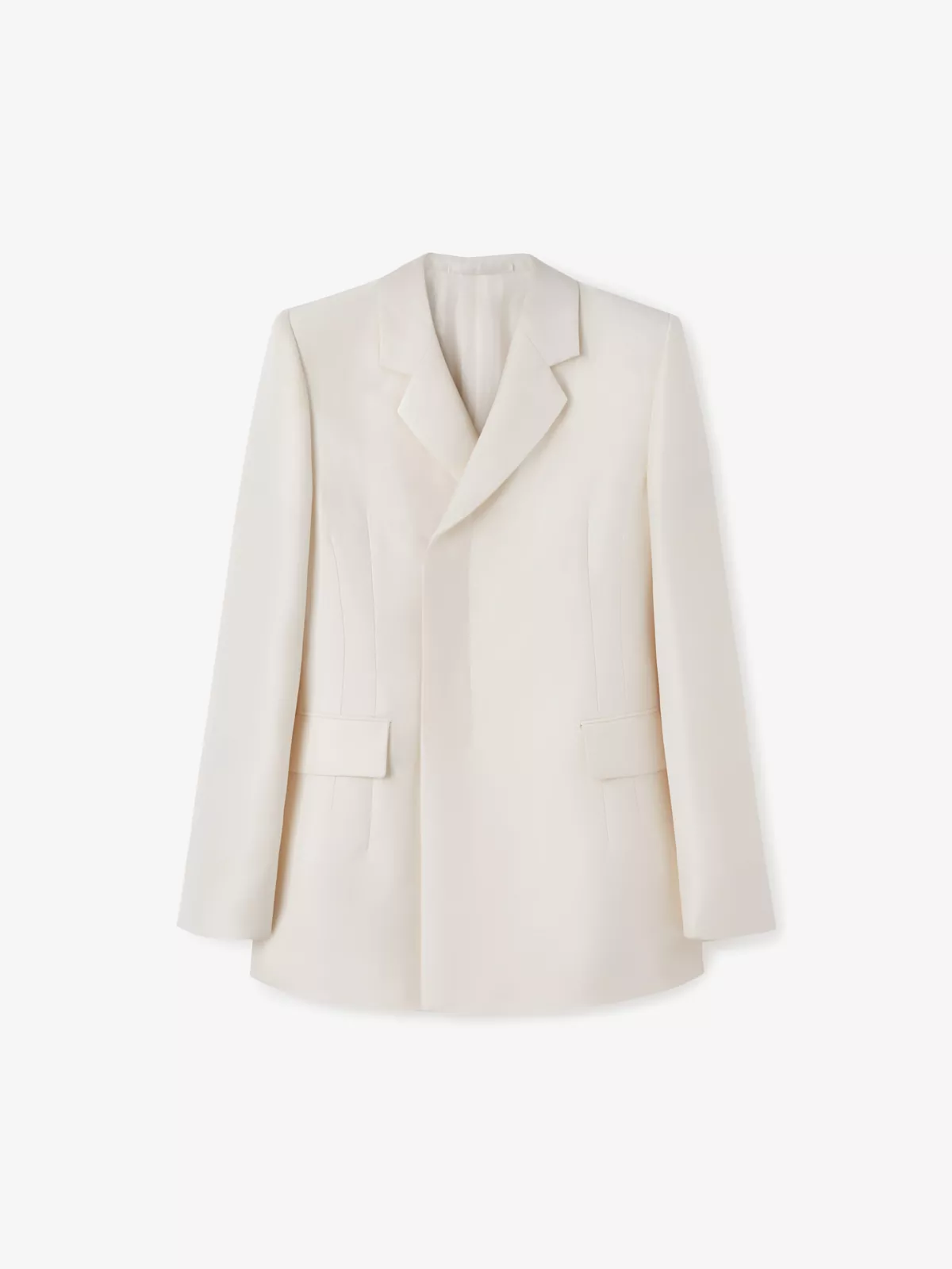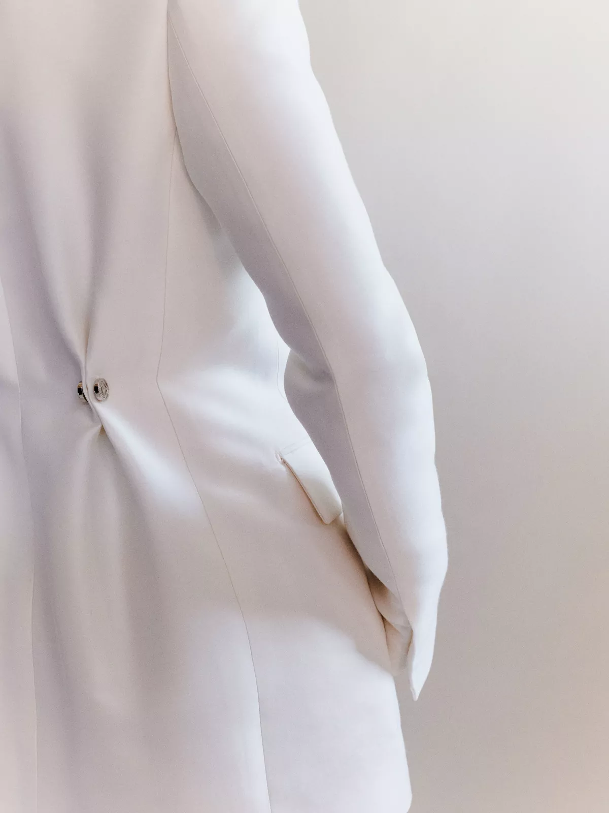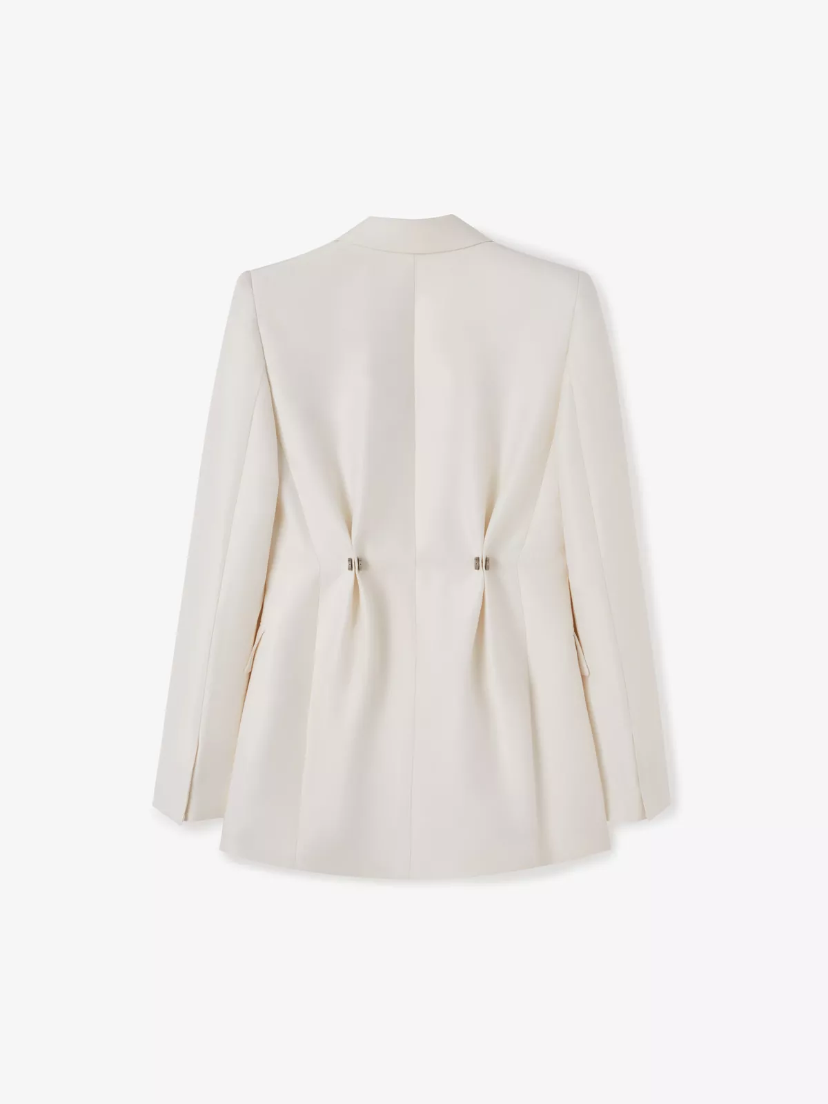 -47% 羊毛, 33% 原木天丝, 20% 桑蚕丝 -象牙白 -双排扣 -袖扣收腰设计 -意大利制造
