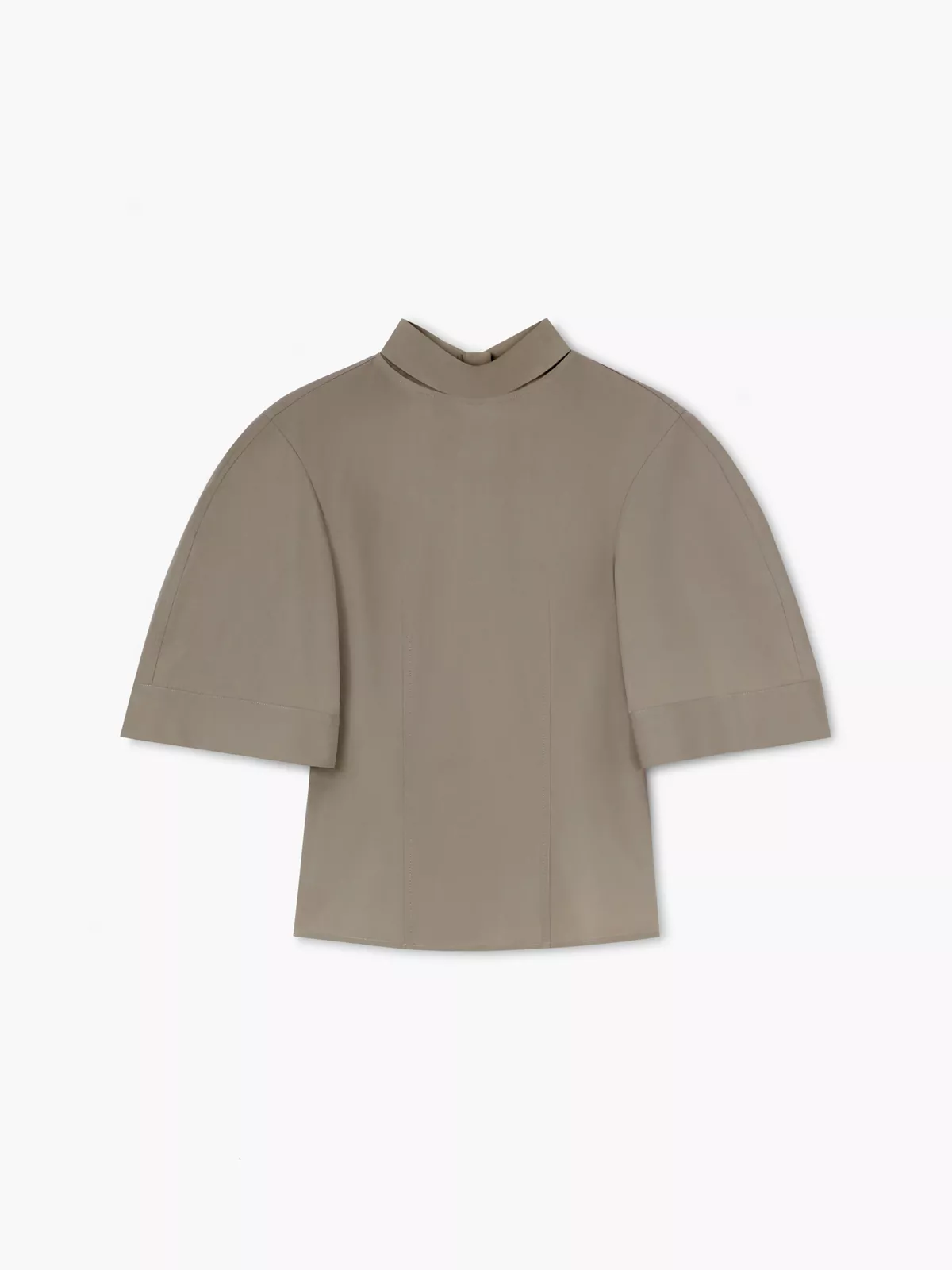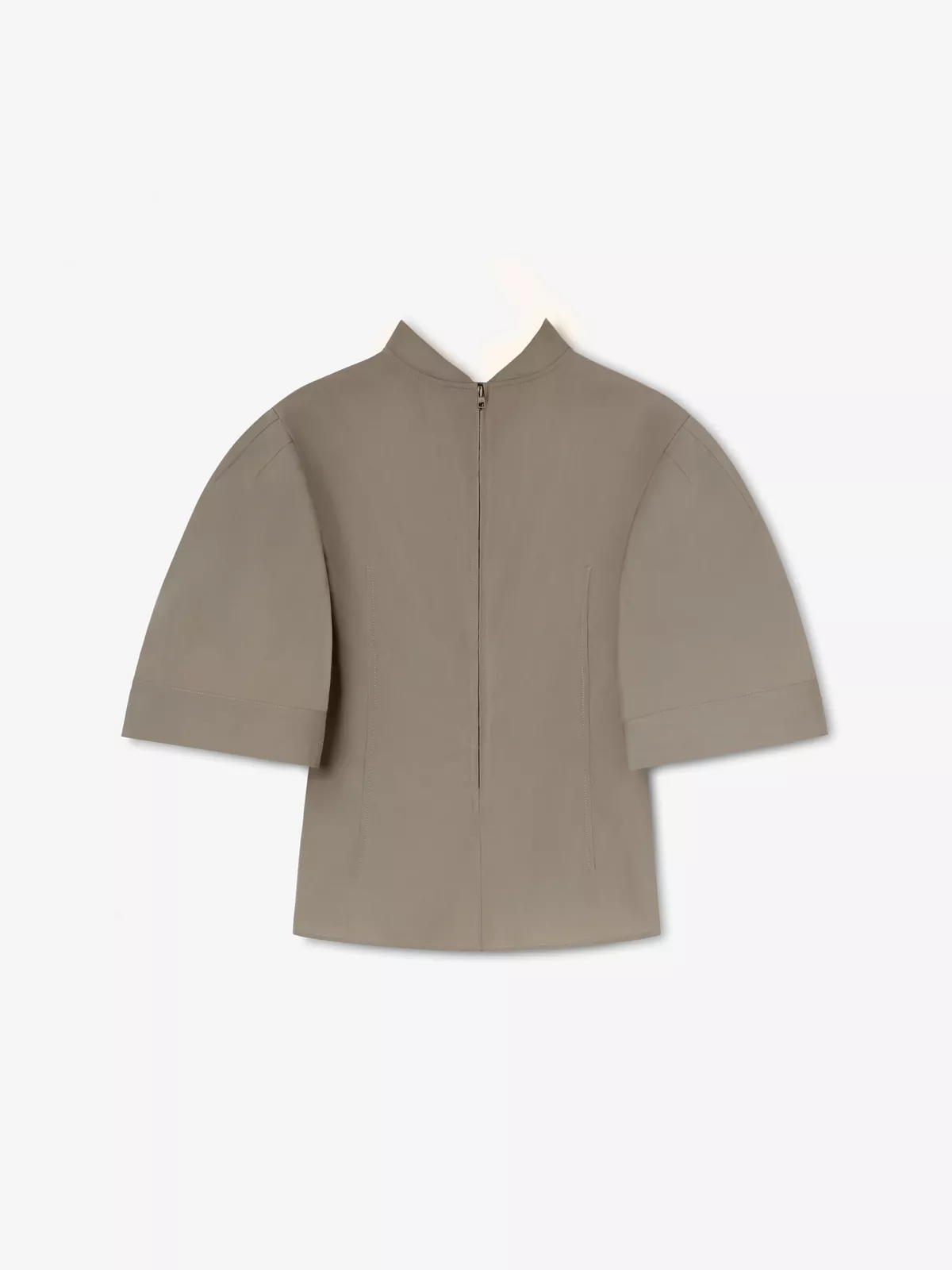 这件优雅的和服风格的衬衫是由纯棉府绸面料裁剪而成,带有圆形短袖和立领。