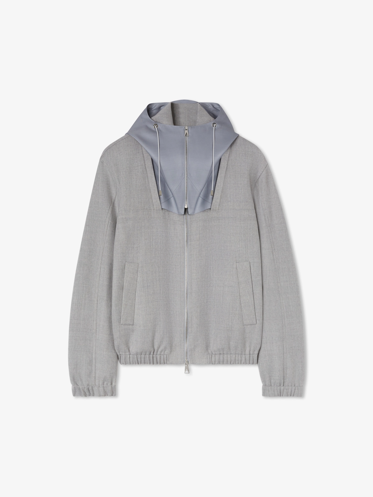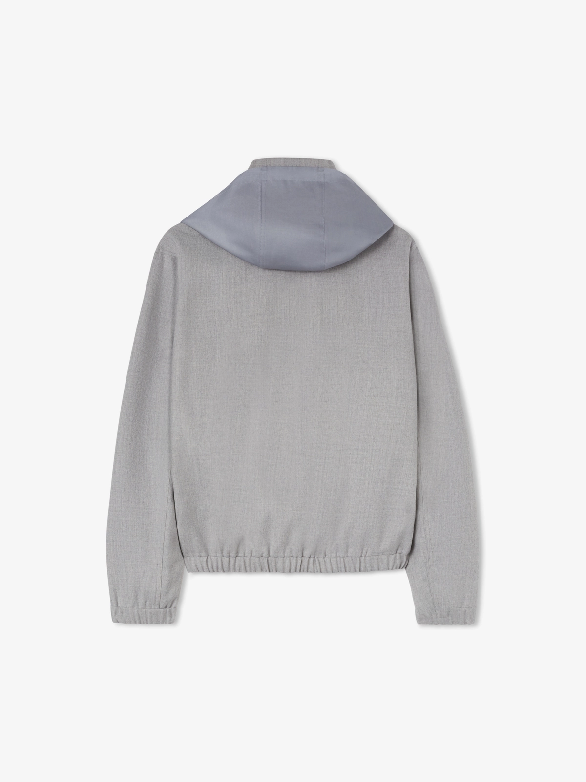 这件上衣采用优质双面美利奴羊毛面料剪裁而成,饰有一个衬衫领和一个可拆卸的帽子,采用对比色面料。袖子上有银色的缝合细节。