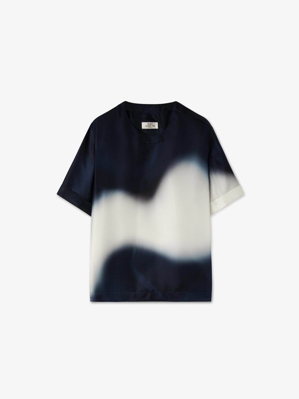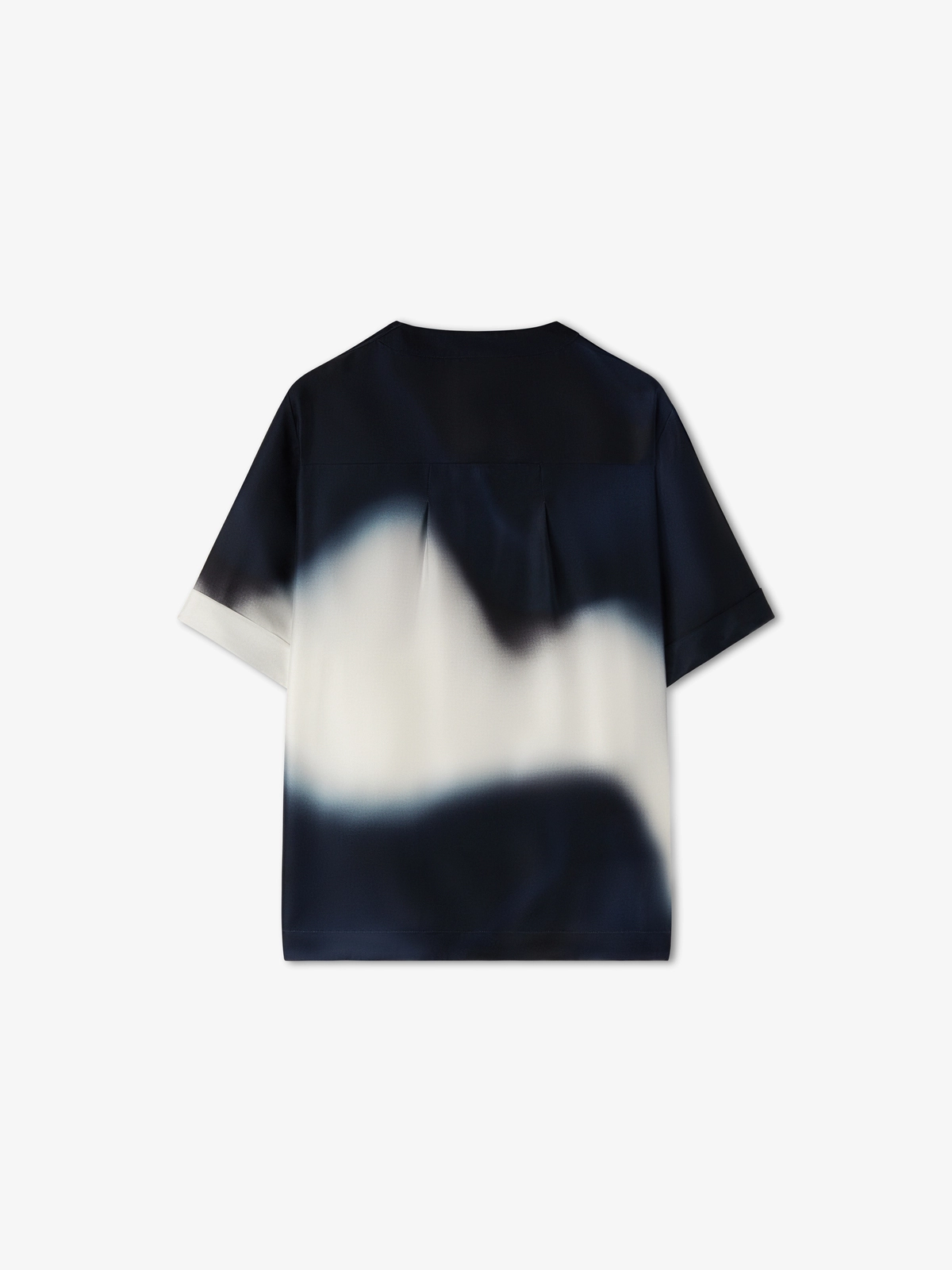 圆领短袖桑蚕丝斜纹上衣,印有抽象的声波印花,背面附有顶部缝线细。